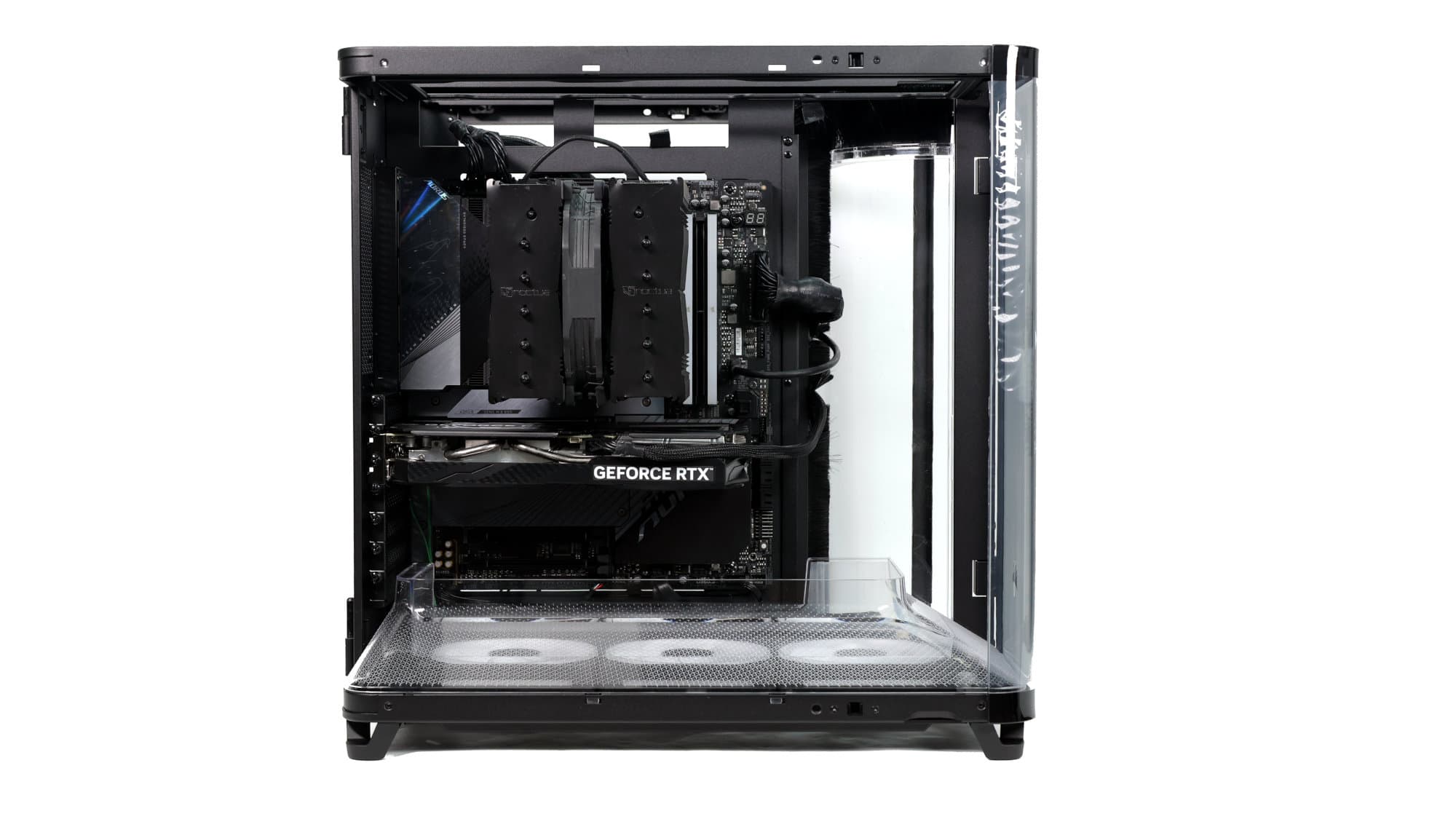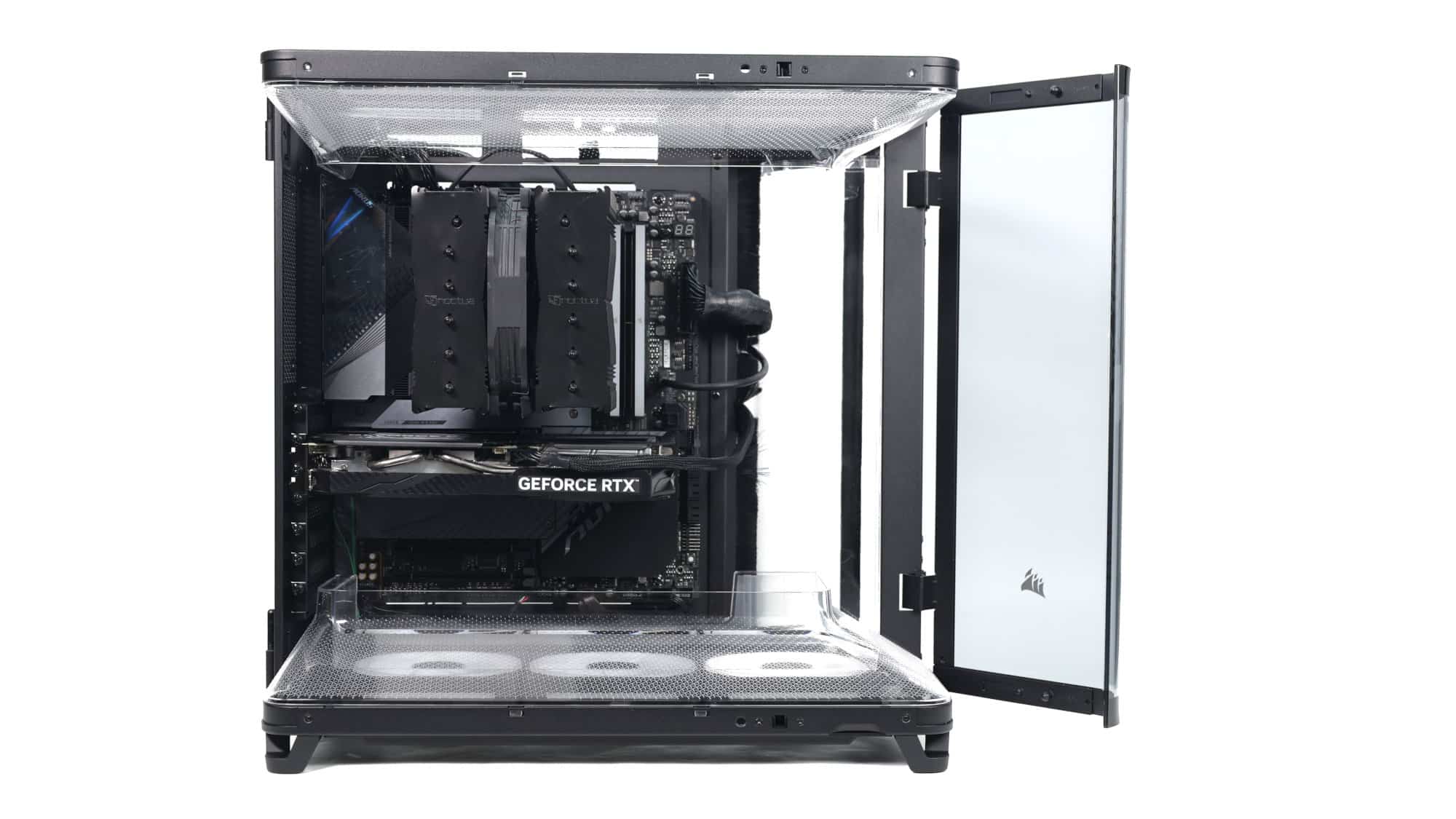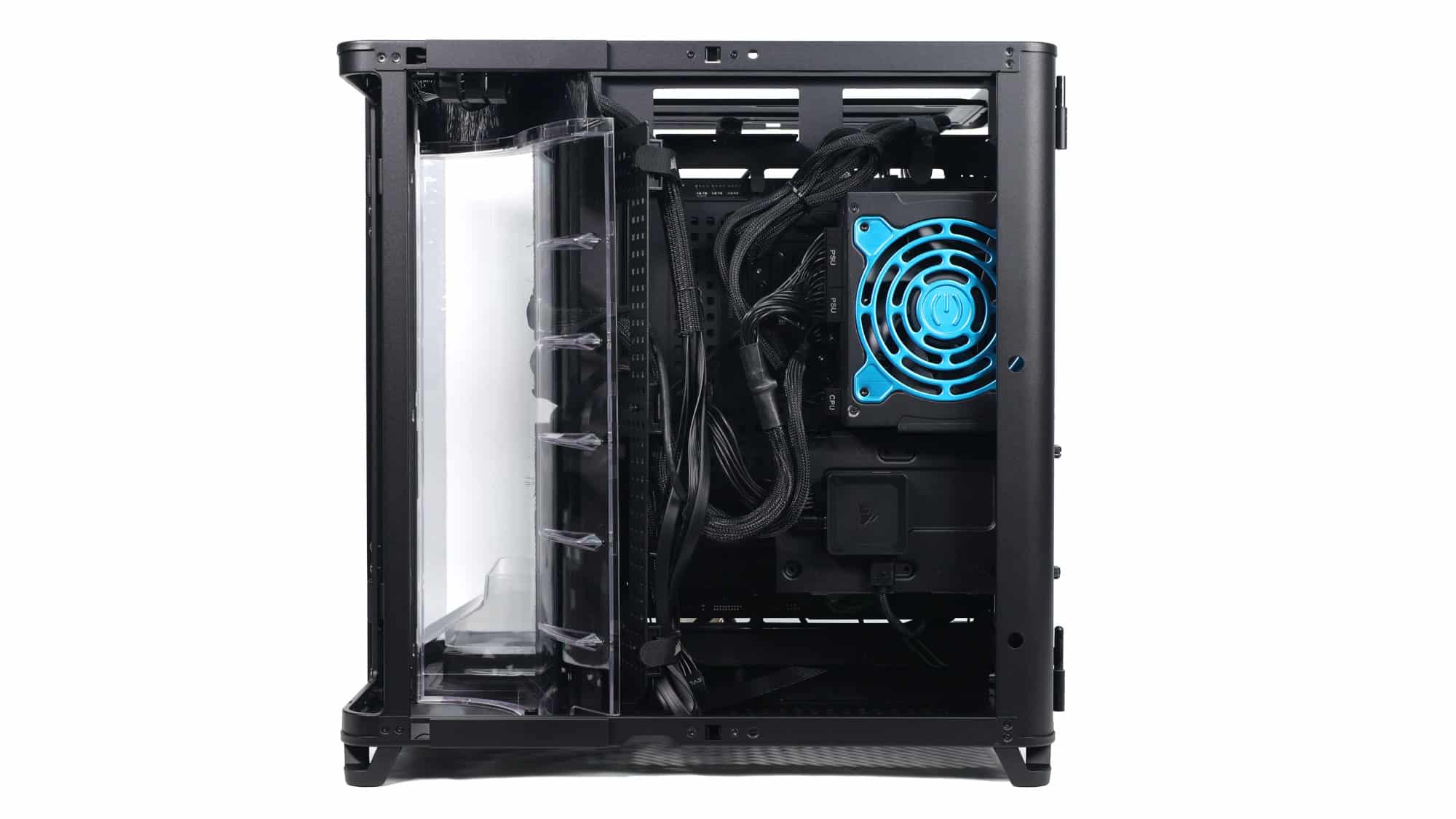 Here’s the assembled system with our standard configuration. This chassis is designed for power-hungry components, given its strong focus on cooling performance. In addition, there is a strong emphasis on air channeling inside the main chamber, from top to bottom. For builds where additional airflow over the VRMs is necessary, there is an option to install a rear exhaust fan, but it will be handicapped.