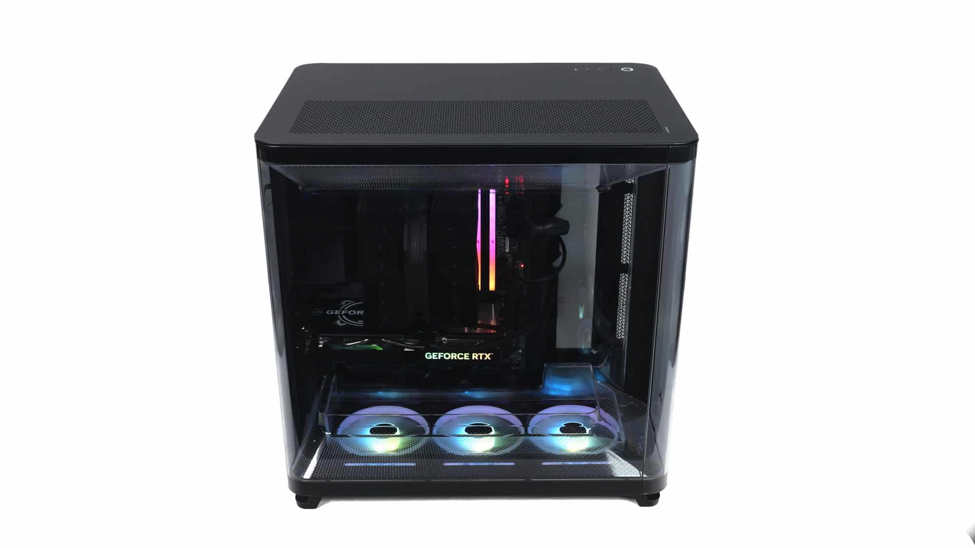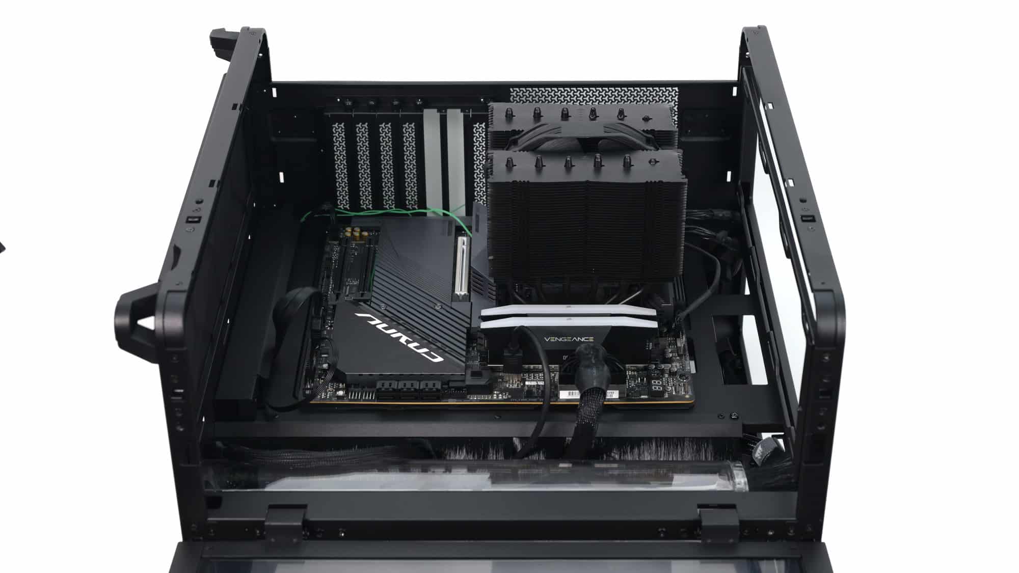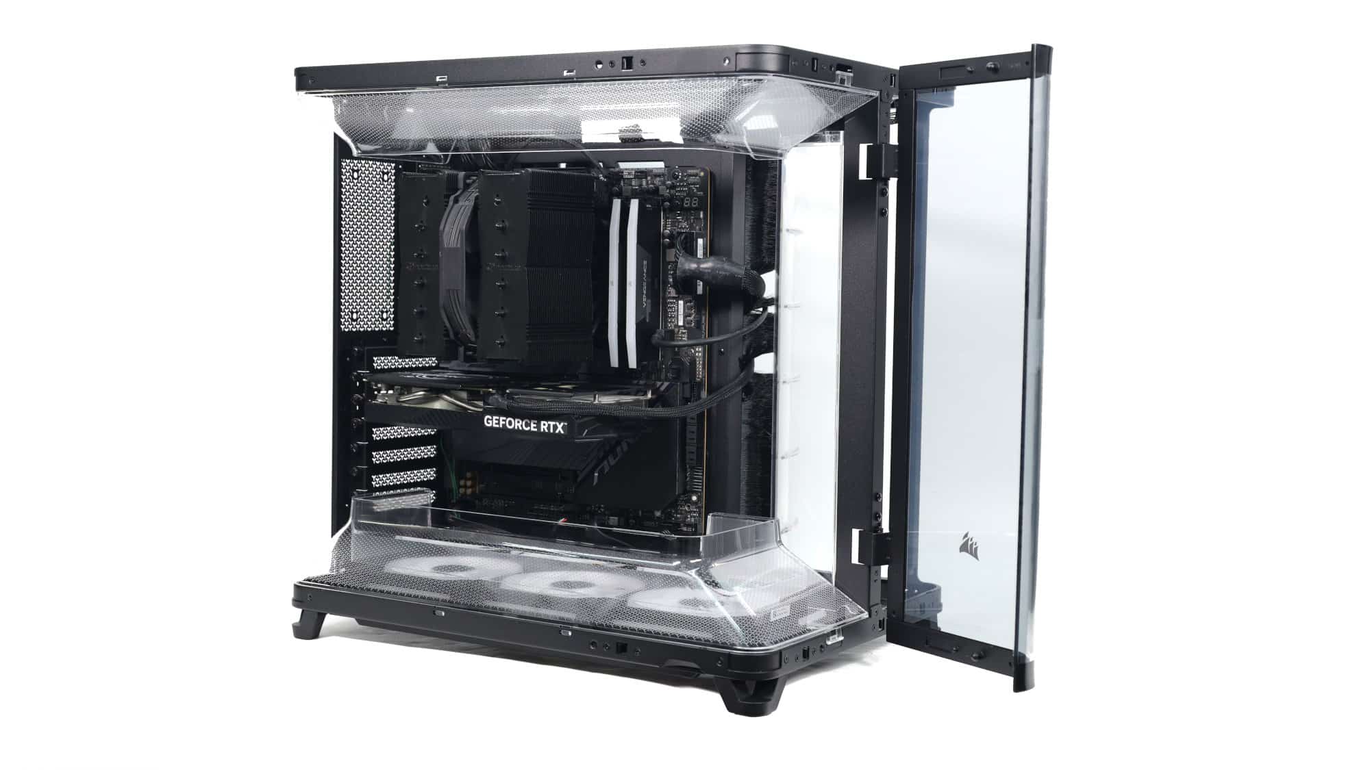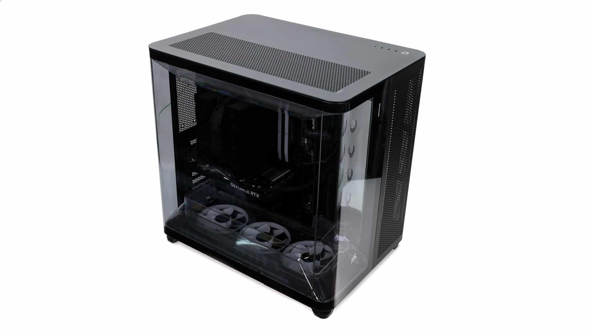 Here’s the assembled system with our standard configuration. This chassis is designed for power-hungry components, given its strong focus on cooling performance. In addition, there is a strong emphasis on air channeling inside the main chamber, from top to bottom. For builds where additional airflow over the VRMs is necessary, there is an option to install a rear exhaust fan, but it will be handicapped.