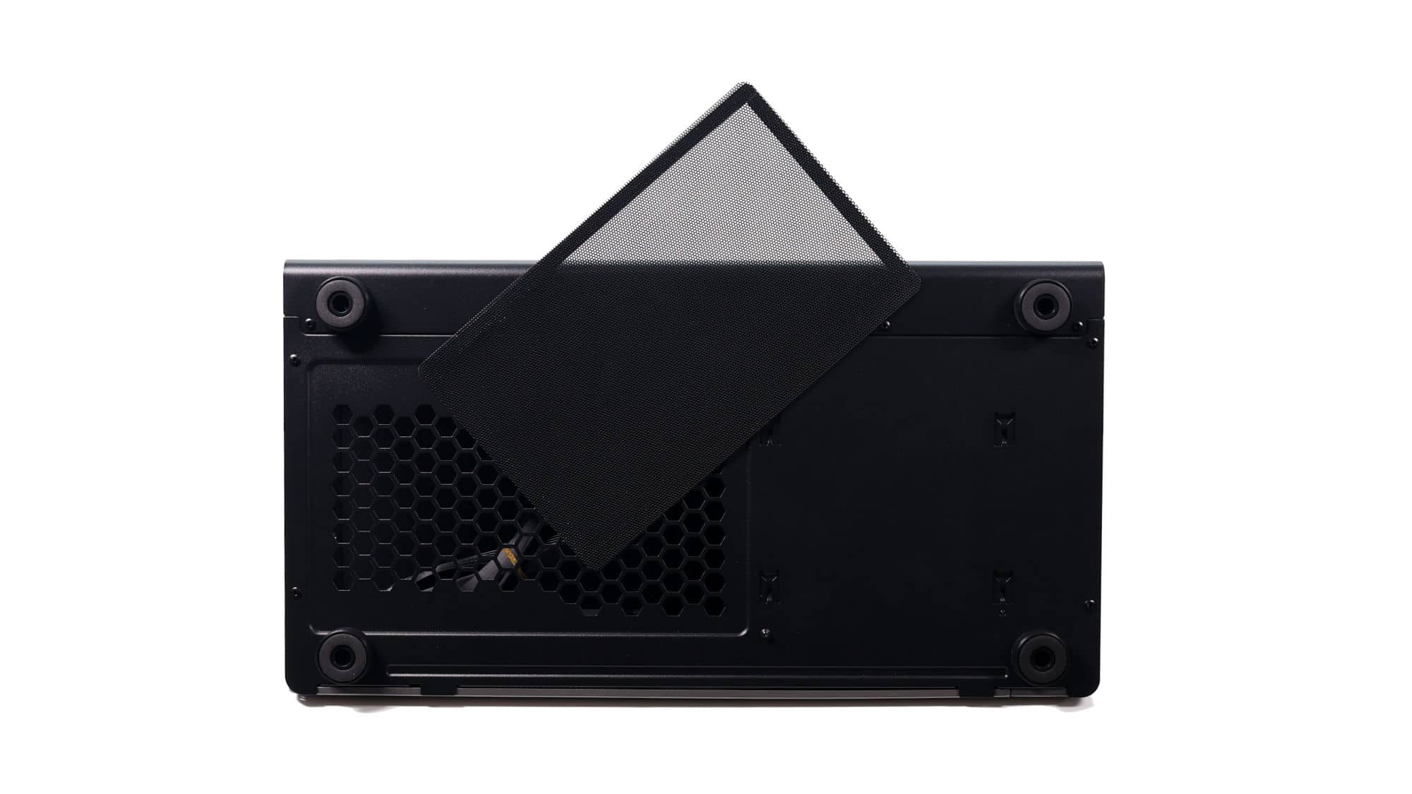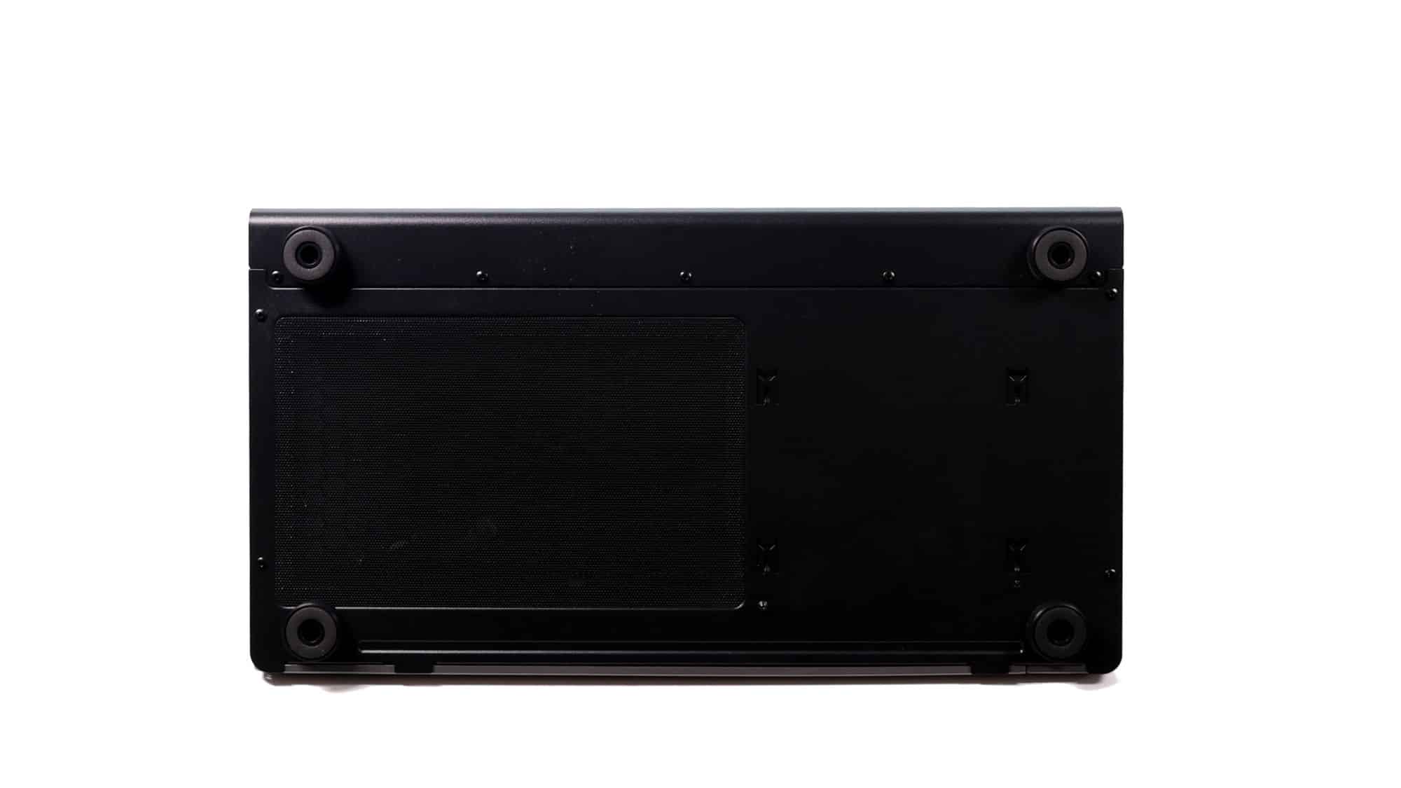 At the bottom of the chassis, we have additional ventilation for the PSU intake, a magnetic dust filter, case feet, and visible mounting slots for the drive cage.