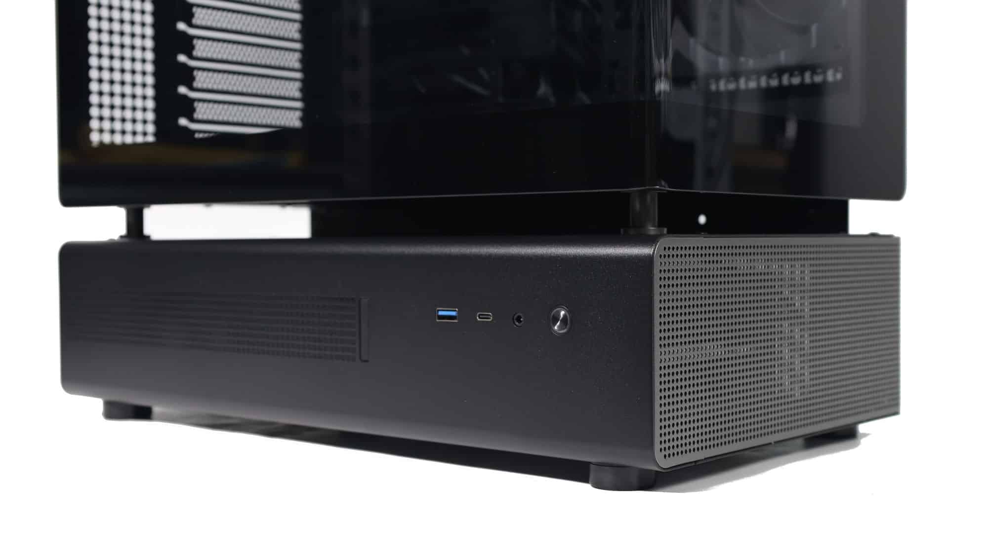 Starting the exterior tour from the side, we have wrap-around glass on top and a dot-matrix LED display accompanied by the chassis I/O at the bottom. The I/O includes a USB Type-A port, a USB Type-C port, a headphone jack, and a power button. It’s the same I/O selection we saw on the NZXT H5.