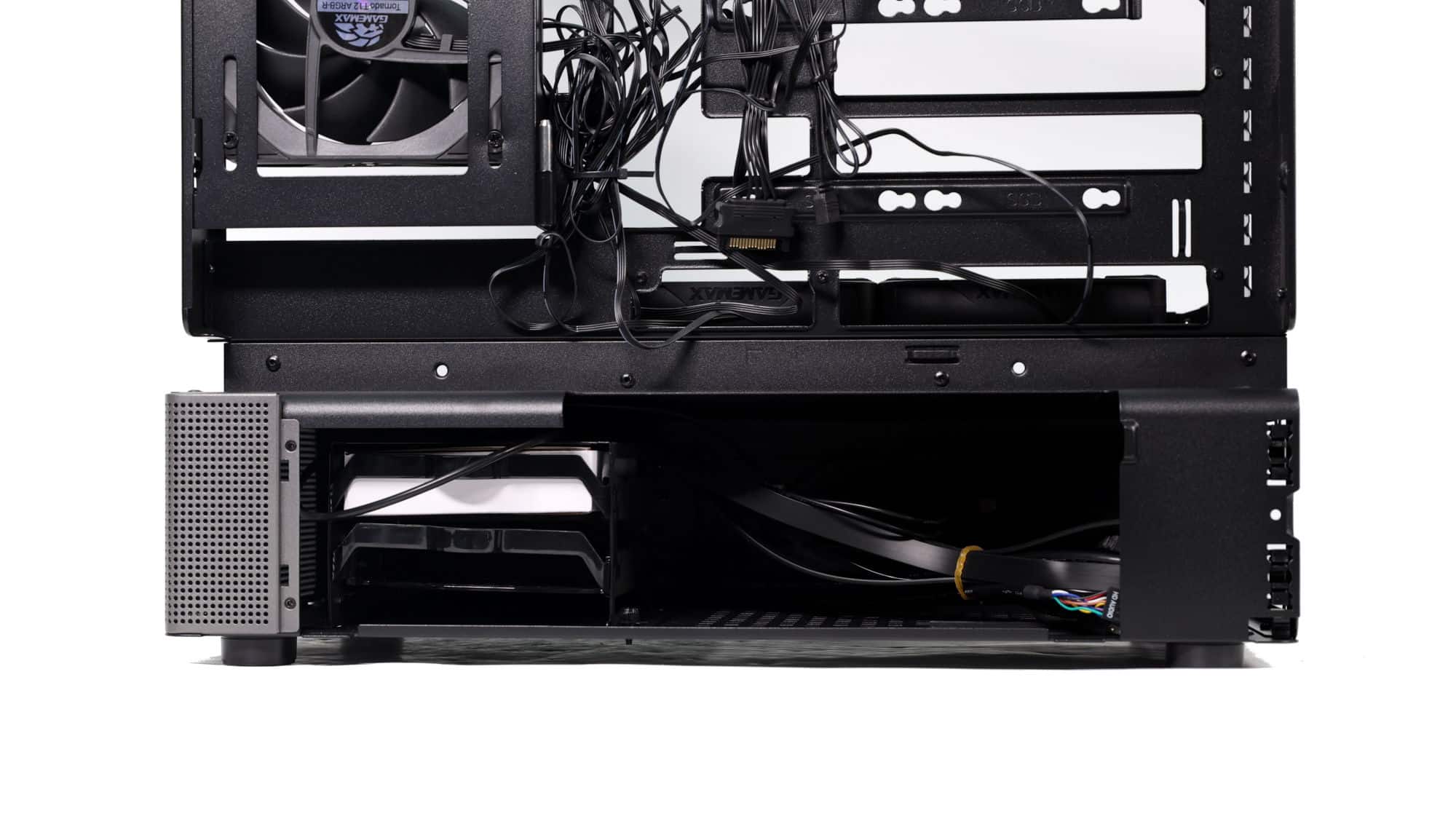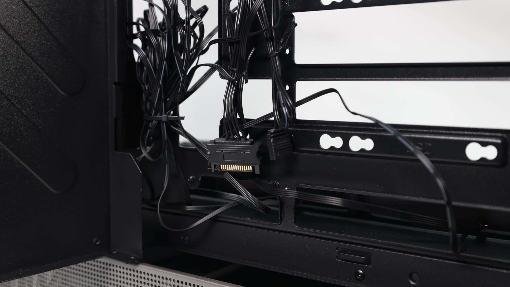 There is room for storage devices in both chambers. At the top, you’ll find two mounting points for 2.5-inch drives using the provided rubber mounts. Space is tight, but workable. Flat SATA connectors will be necessary, though most PSUs include them.