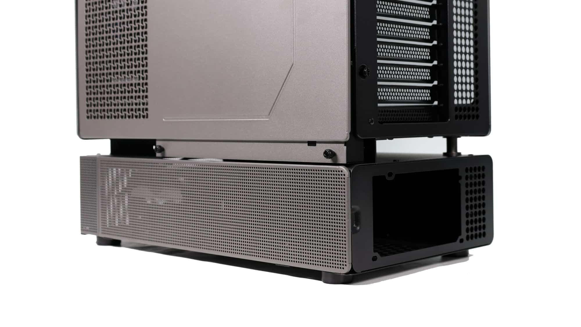 Following the glass, it stops at the front. The glass quality is very good, certainly above average, and the radius is similar to the very tight curvature we recently saw on the competing Corsair Frame 4500X. The bottom chamber is ventilated at the front to allow cool air to enter.