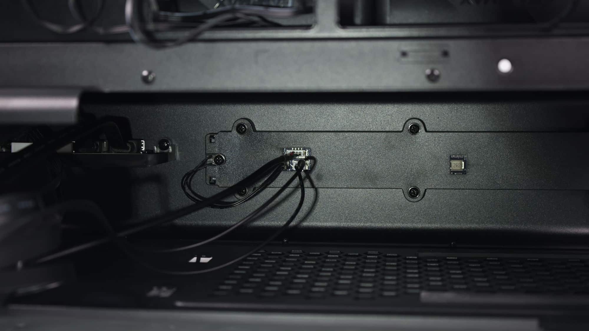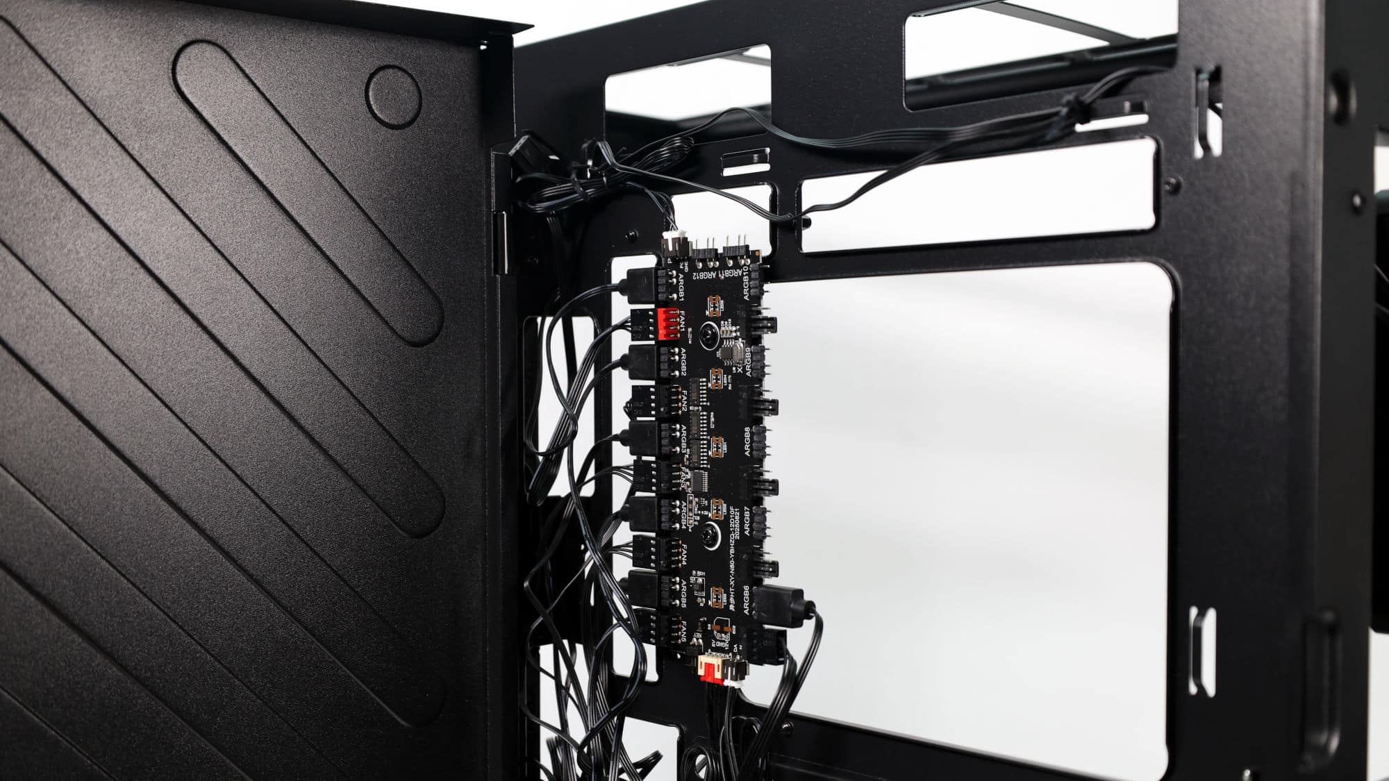 Behind the motherboard tray is another panel that hides everything away. This panel is hinged and can also be entirely removed. Behind it, you’ll find the fan hub, mounting points for 2.5-inch drives, and limited, yet workable, cable-management space. Thankfully, there are several metal hooks stamped into the motherboard tray to help with securing cables.