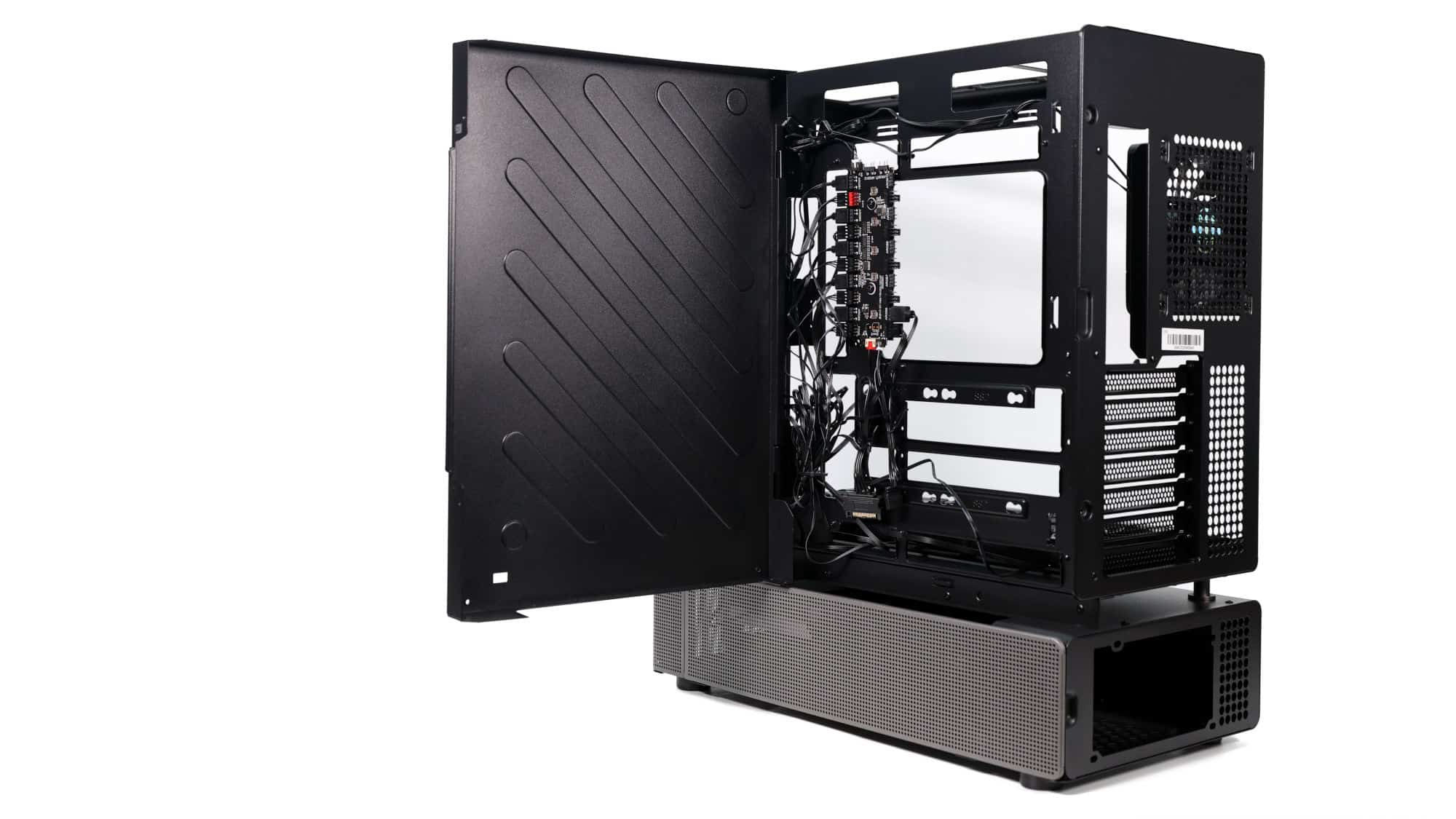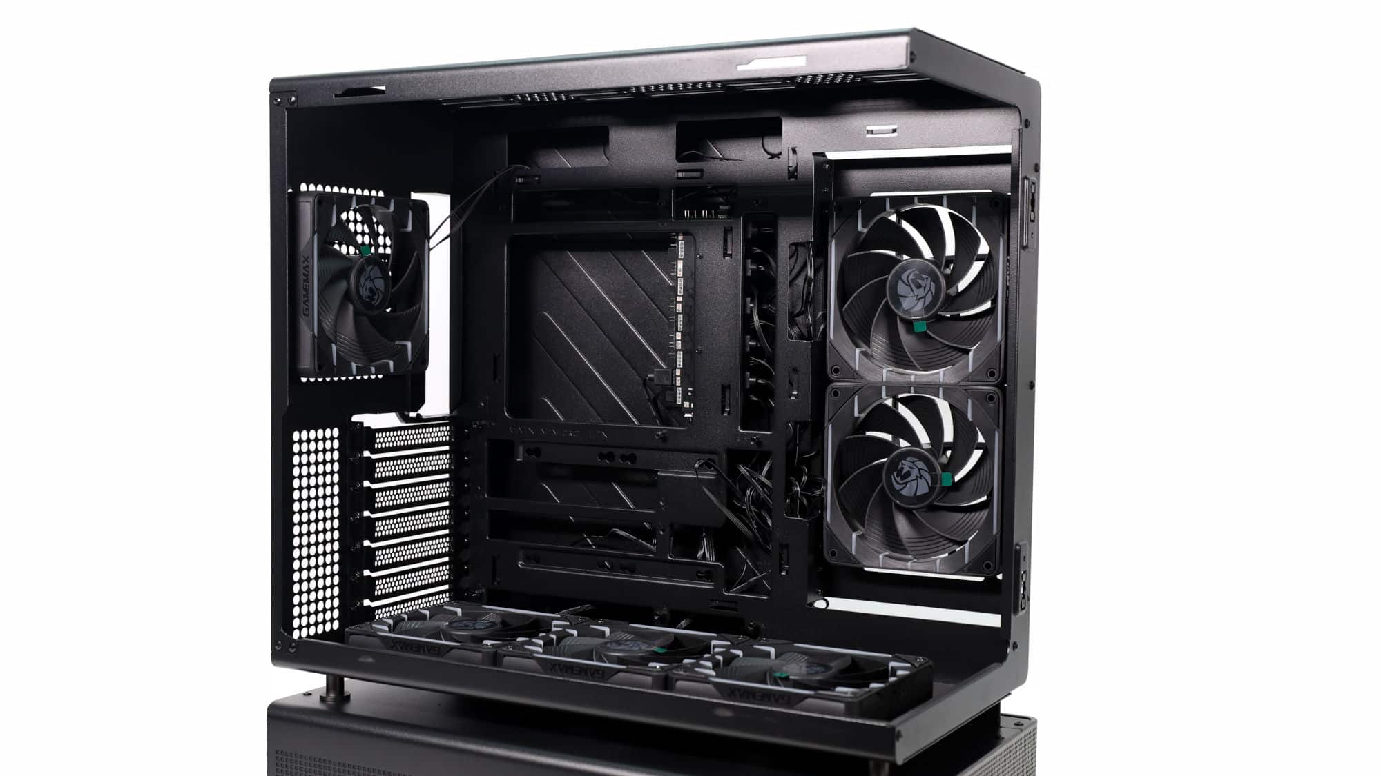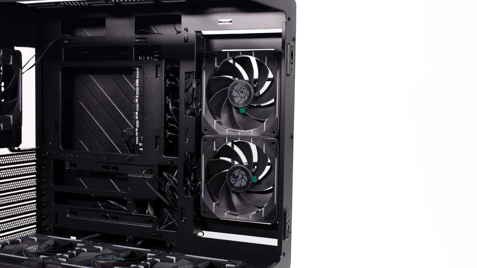 To the right of the motherboard, you’ll find two pre-installed intake fans, with three more at the bottom.