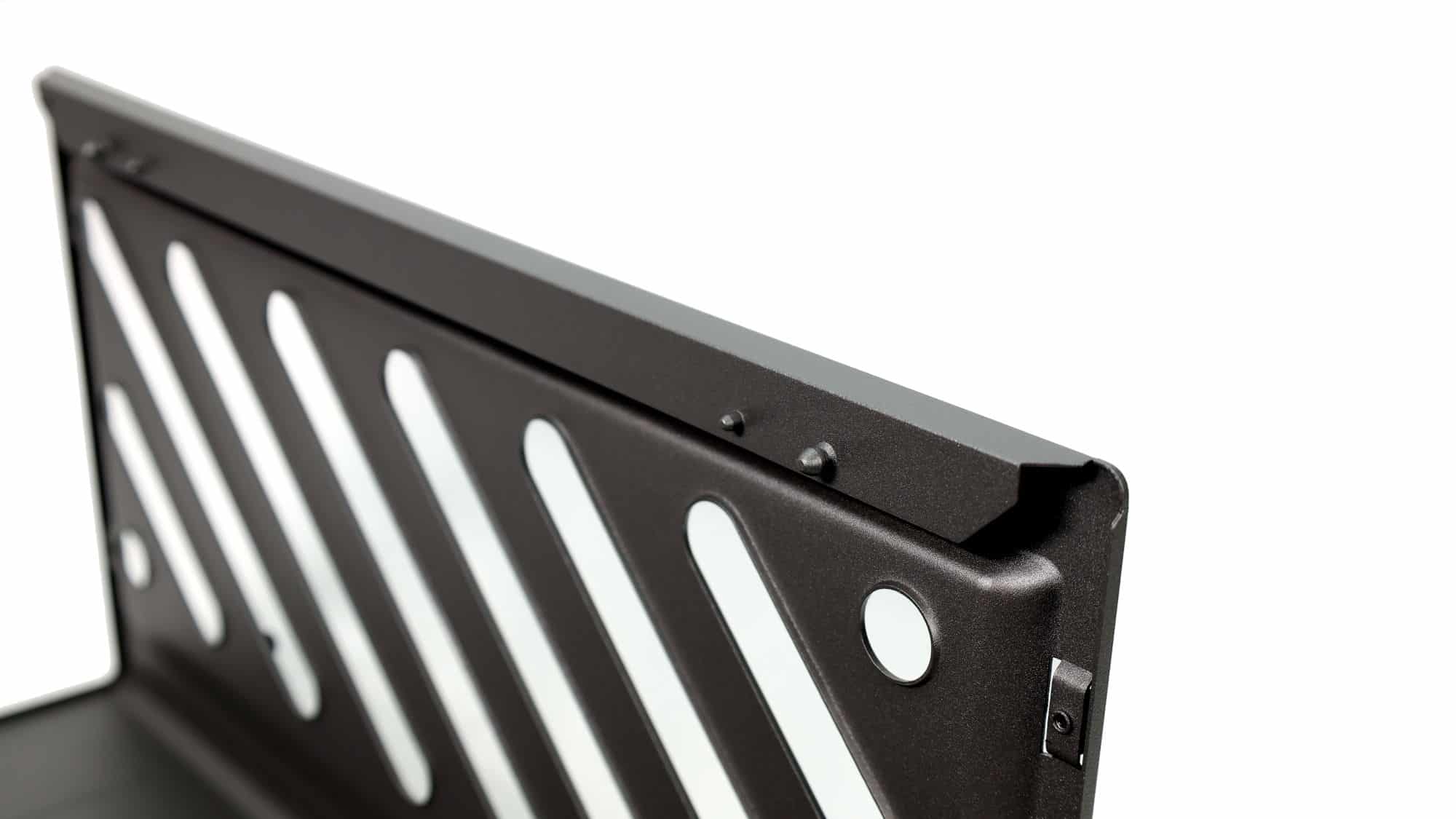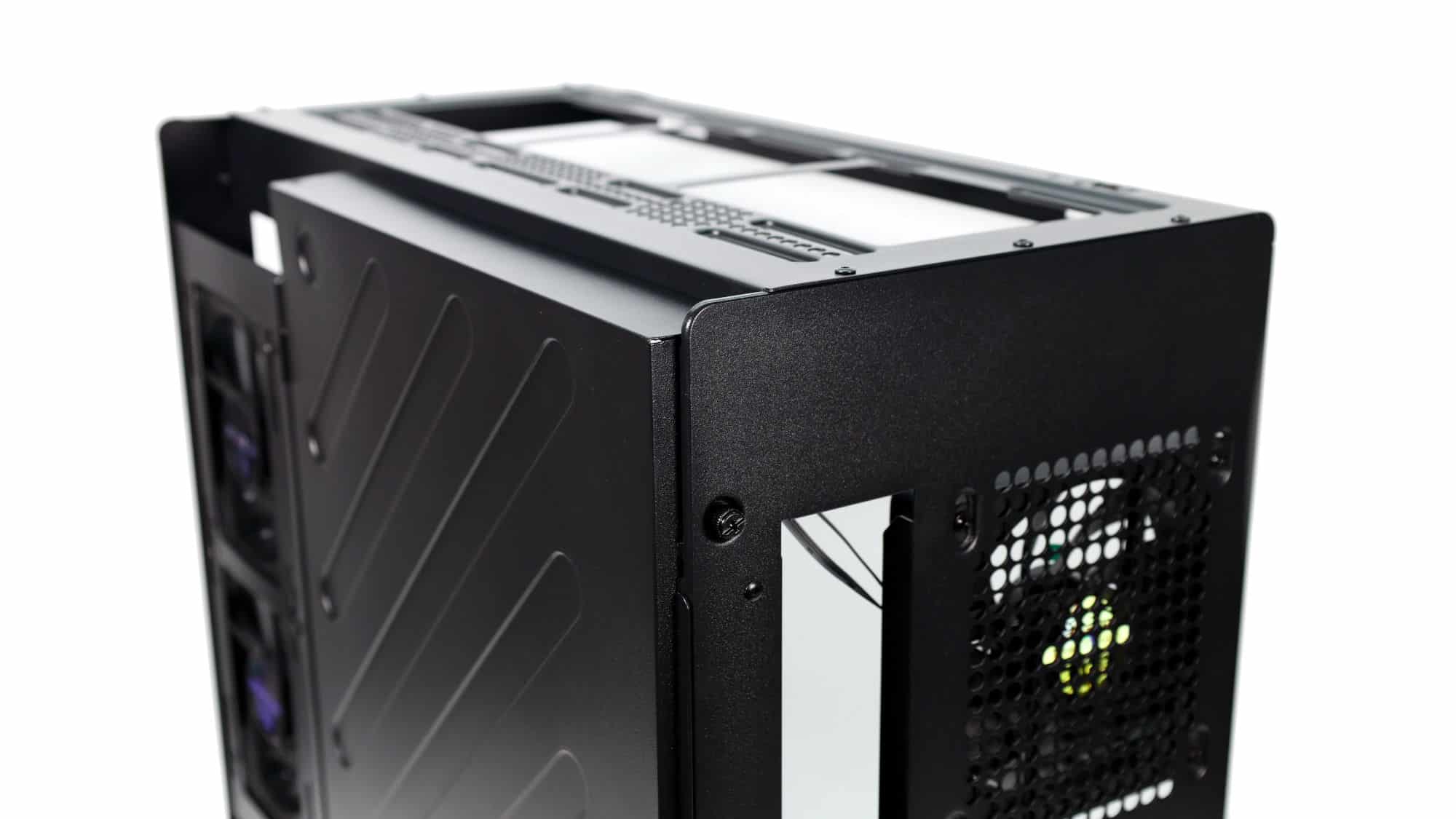 Turning to the back, we see a large steel panel that covers both the back of the main chamber and its top. This panel attaches with plastic clips at the top, while two thumbscrews secure it at the rear. Both the top and sides of this panel include vents for airflow. The bottom chamber is also fully ventilated from the side.