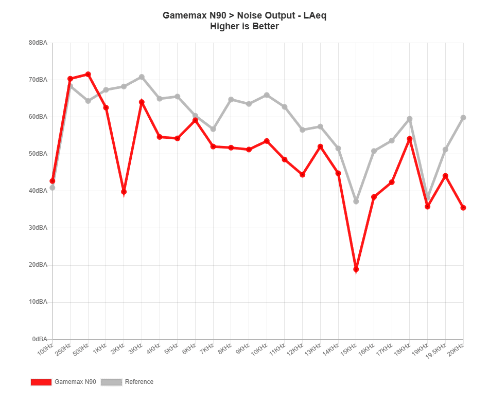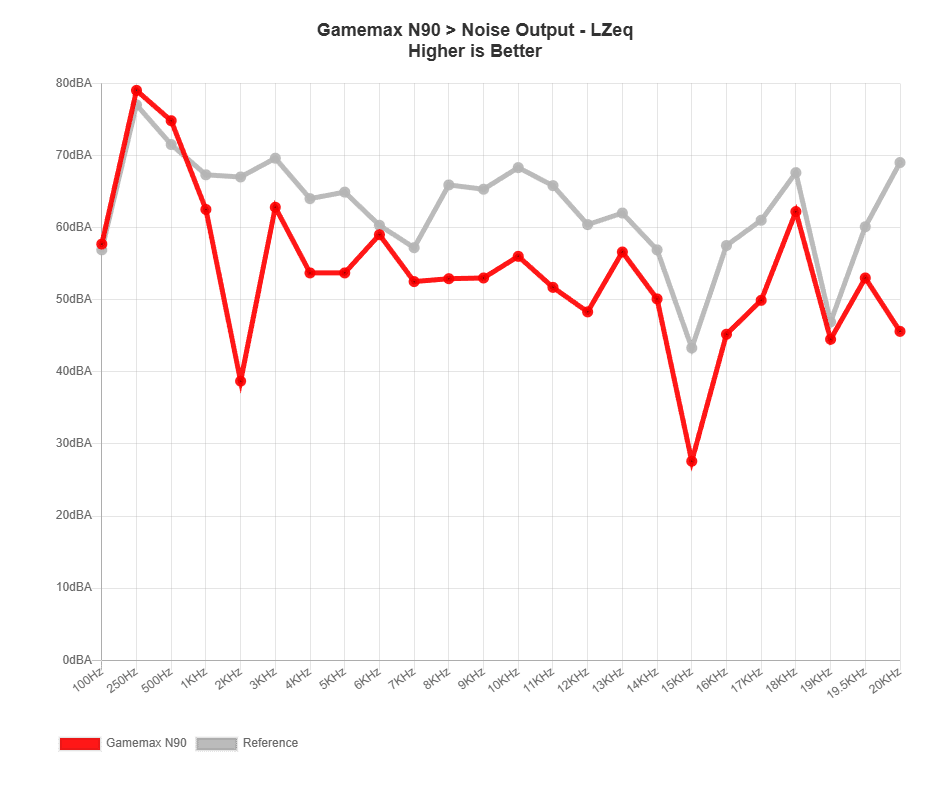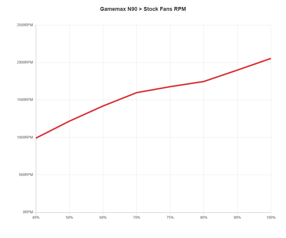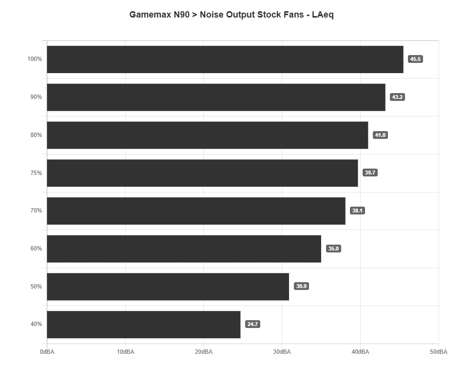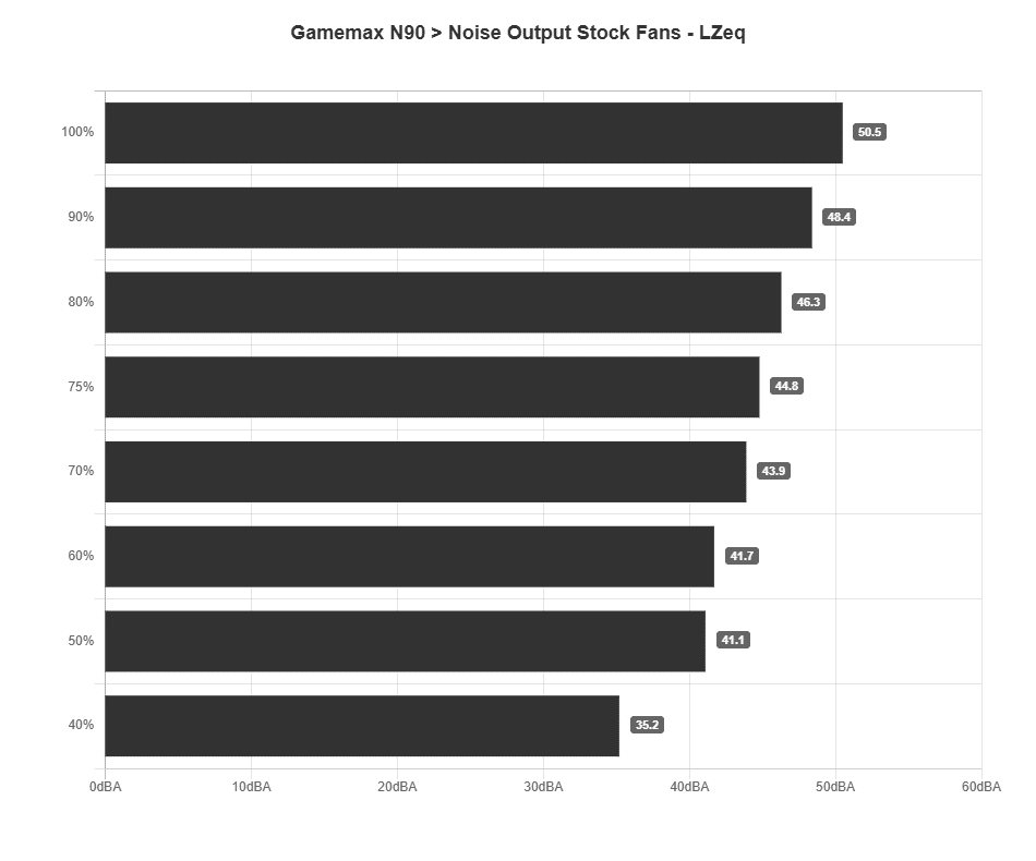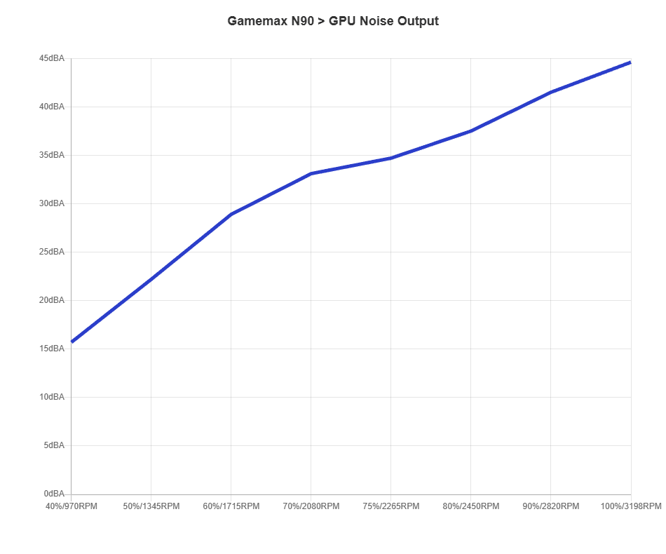 GPU noise output falls within the typical range, with a slight increase observed up to 60-70% PWM.