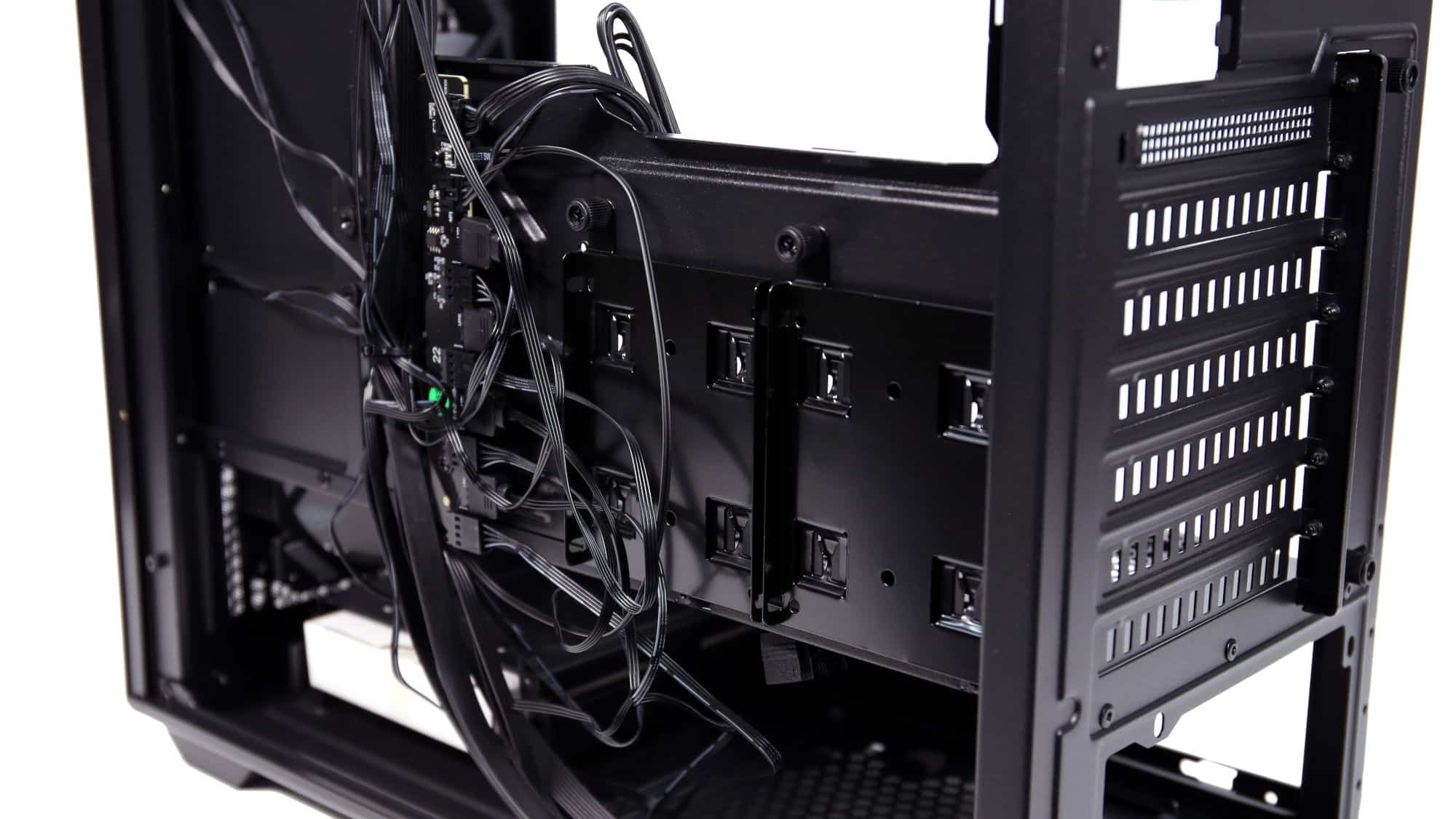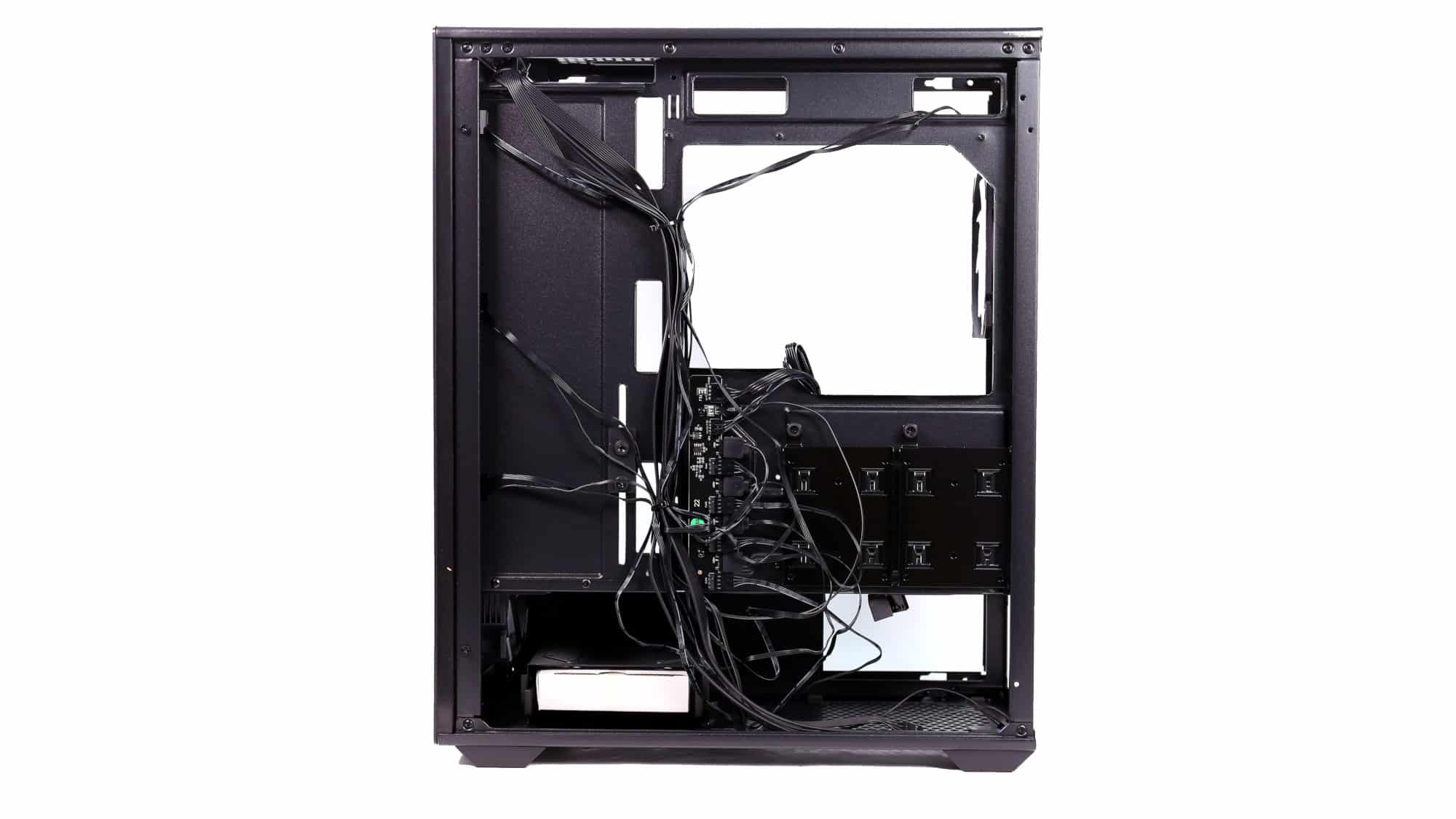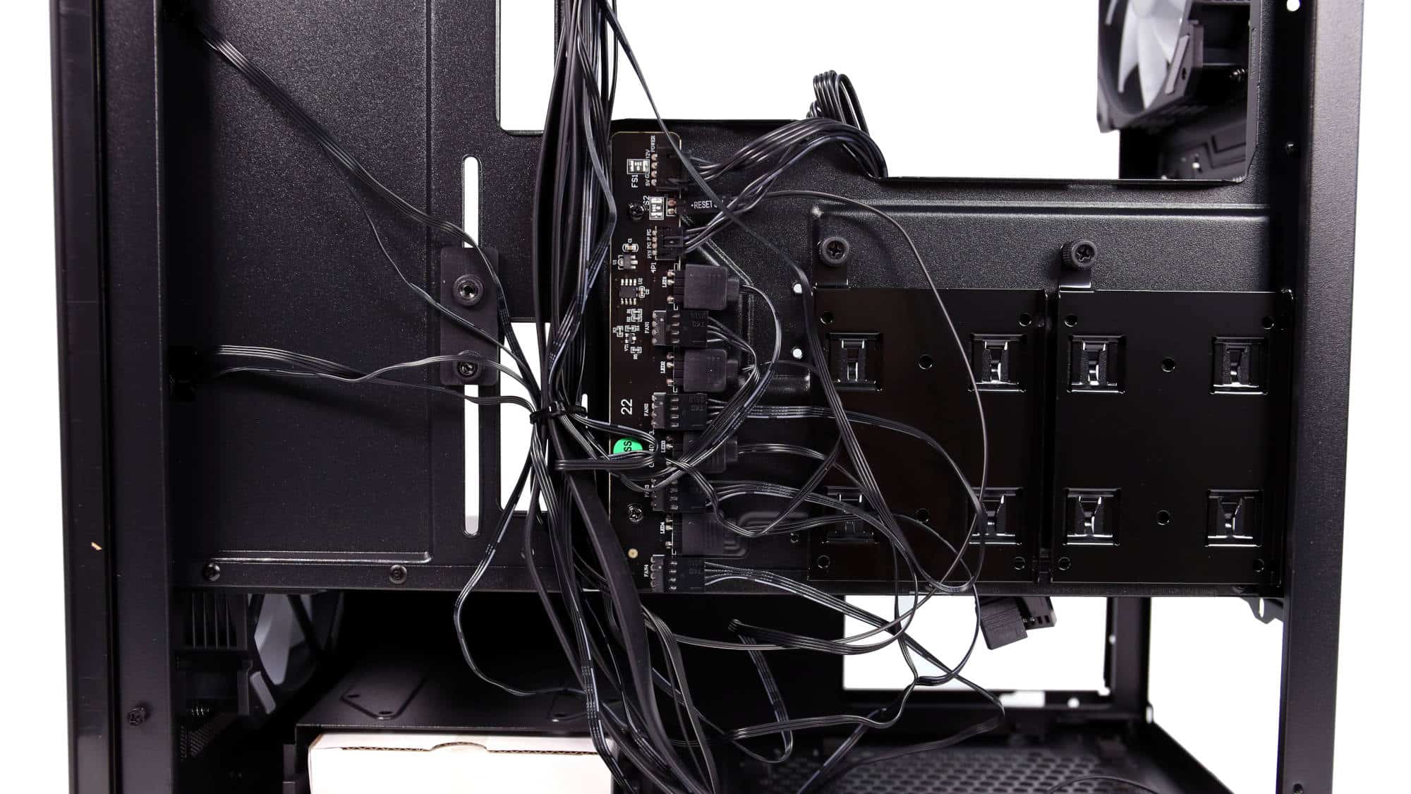 Behind the motherboard tray is the included fan hub. It utilizes standard PWM and ARGB connectors, powered by the SATA interface. Both PWM and ARGB can be synced with your motherboard. The reset button cable can be detached from the hub if you prefer to use it as a traditional reset button. The hub is centrally located, making cable runs easier; however, you’ll want to replace the factory zip ties to avoid a messy appearance. The space here is a bit limited, at 19mm deep.