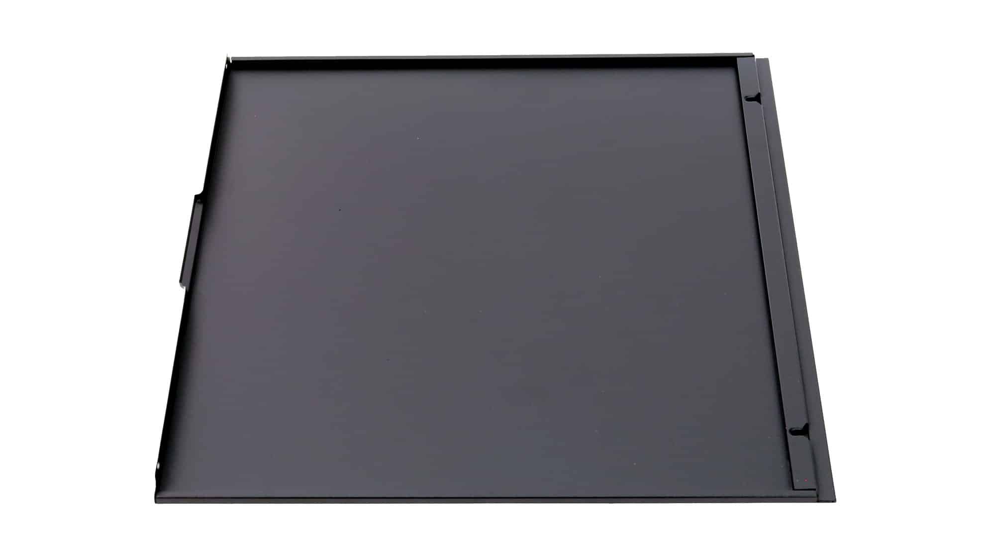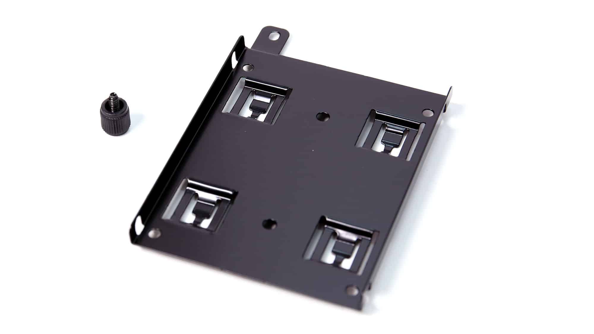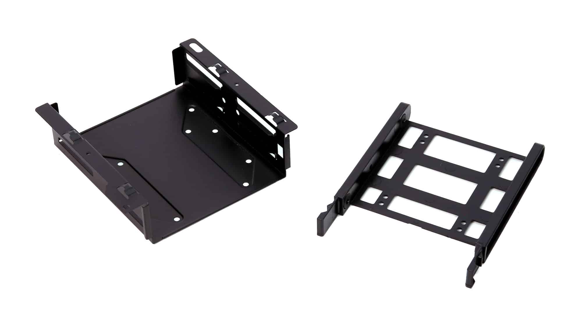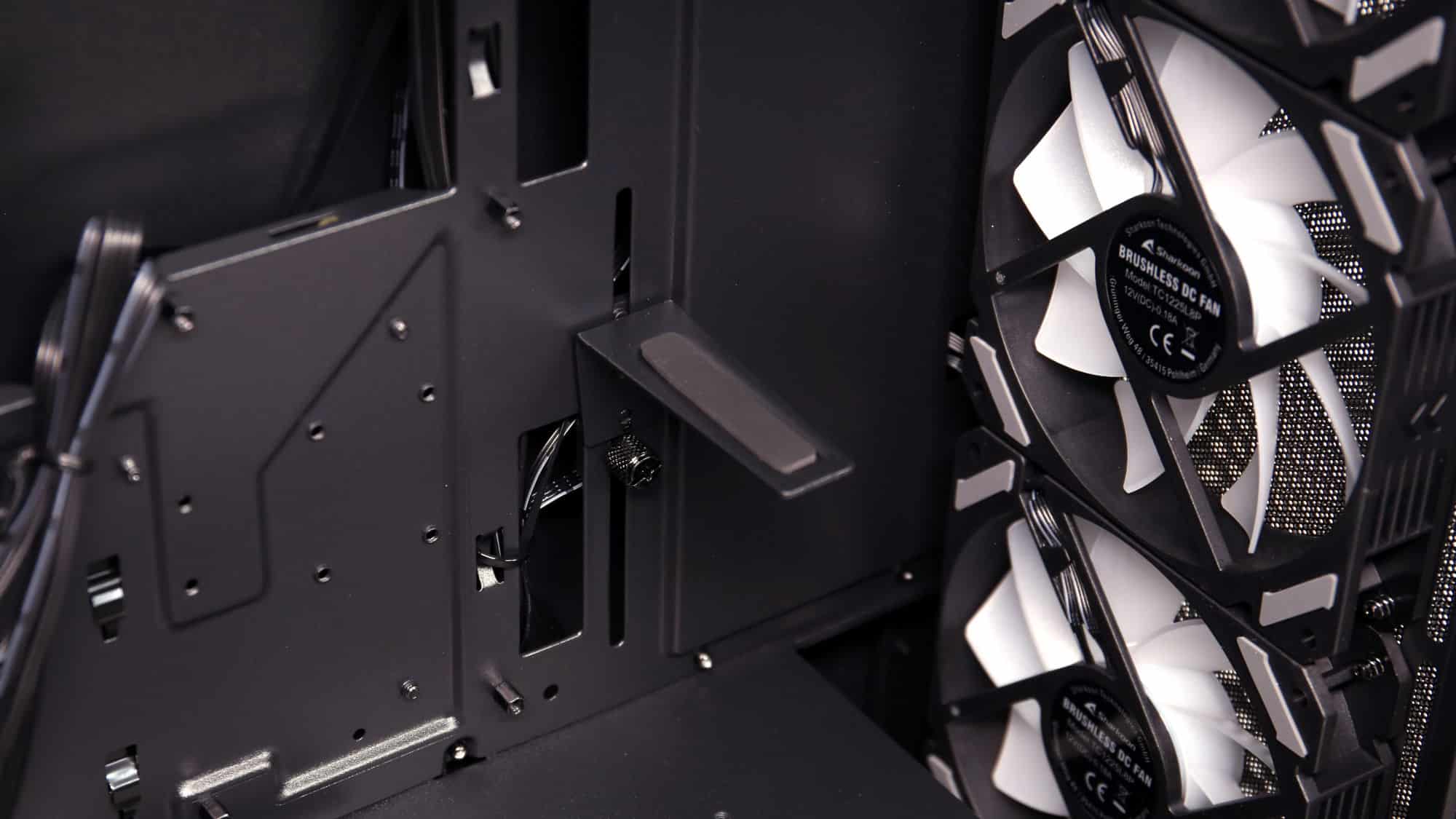 Storage is accommodated by two 2.5-inch drive slots located on the right side of the fan hub, which is mounted directly to the chassis. The rest are inside the lower PSU enclosure. There you will find a storage cage that bolts to the chassis from the bottom. One of the drives can be installed in the removable, tool-less slot, while installing the other requires removing the cage from the chassis. The slots on the cage can accommodate either 3.5-inch or 2.5-inch drives.