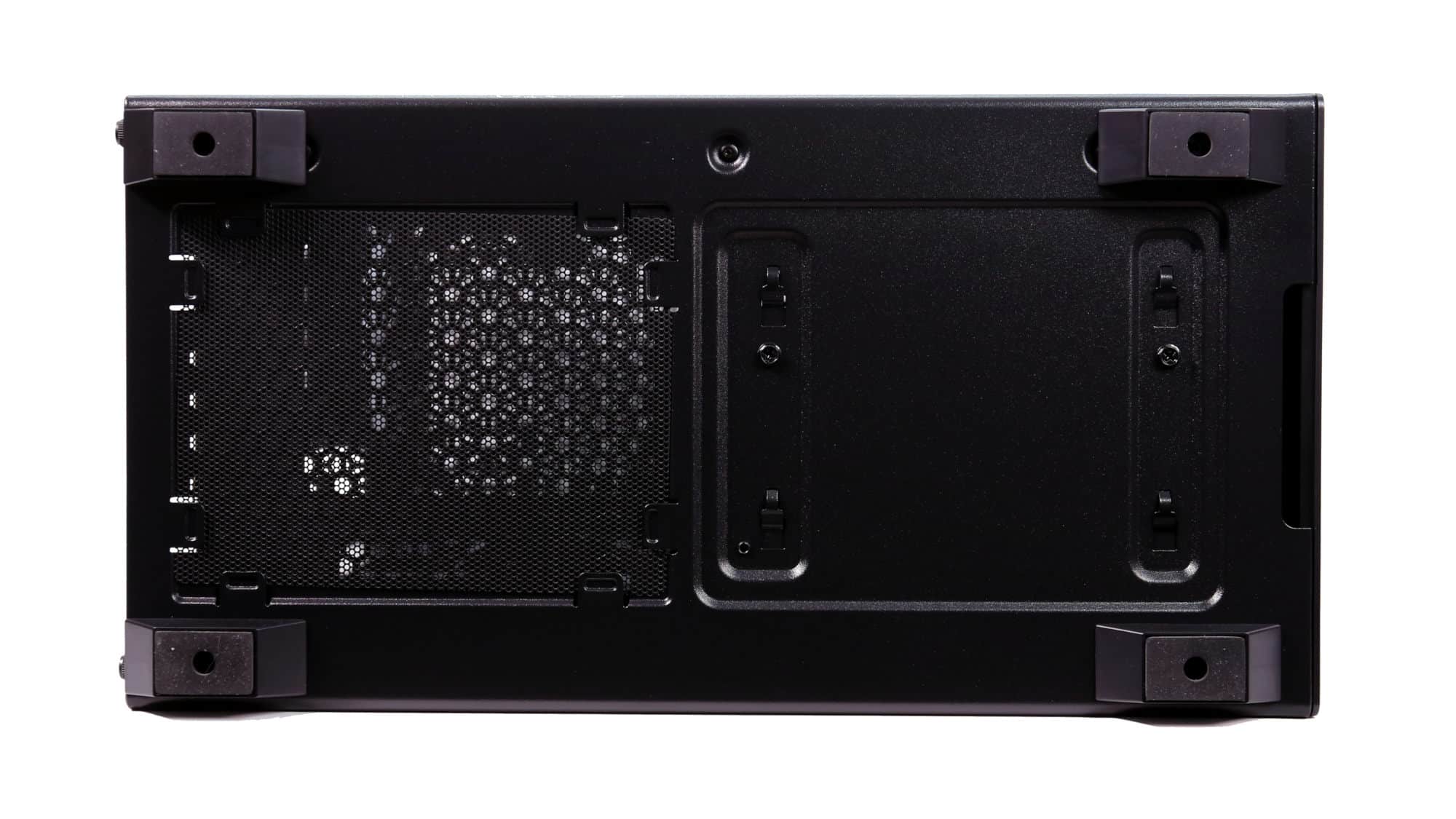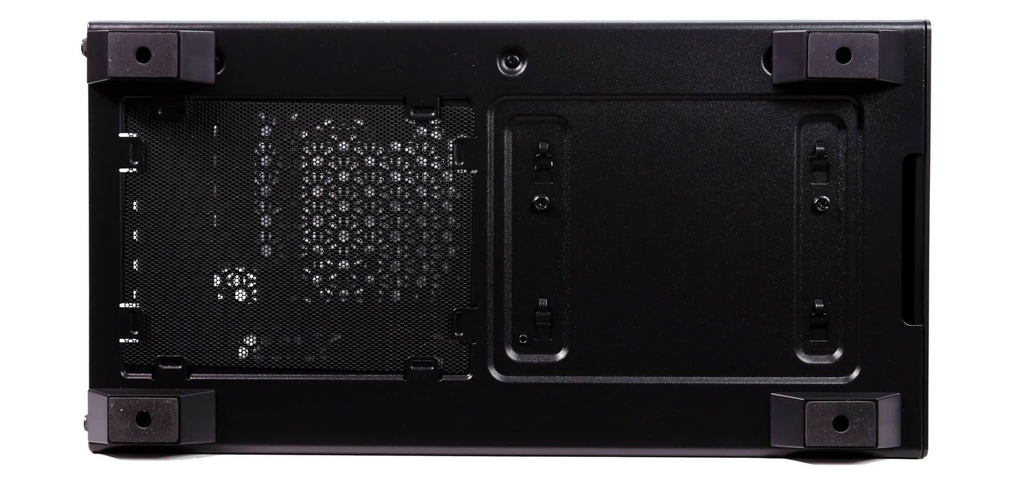 On the underside, you’ll find four feet that lift the chassis off the floor, a PSU intake with a removable filter, and a view of the metal clips used for the storage cage.
