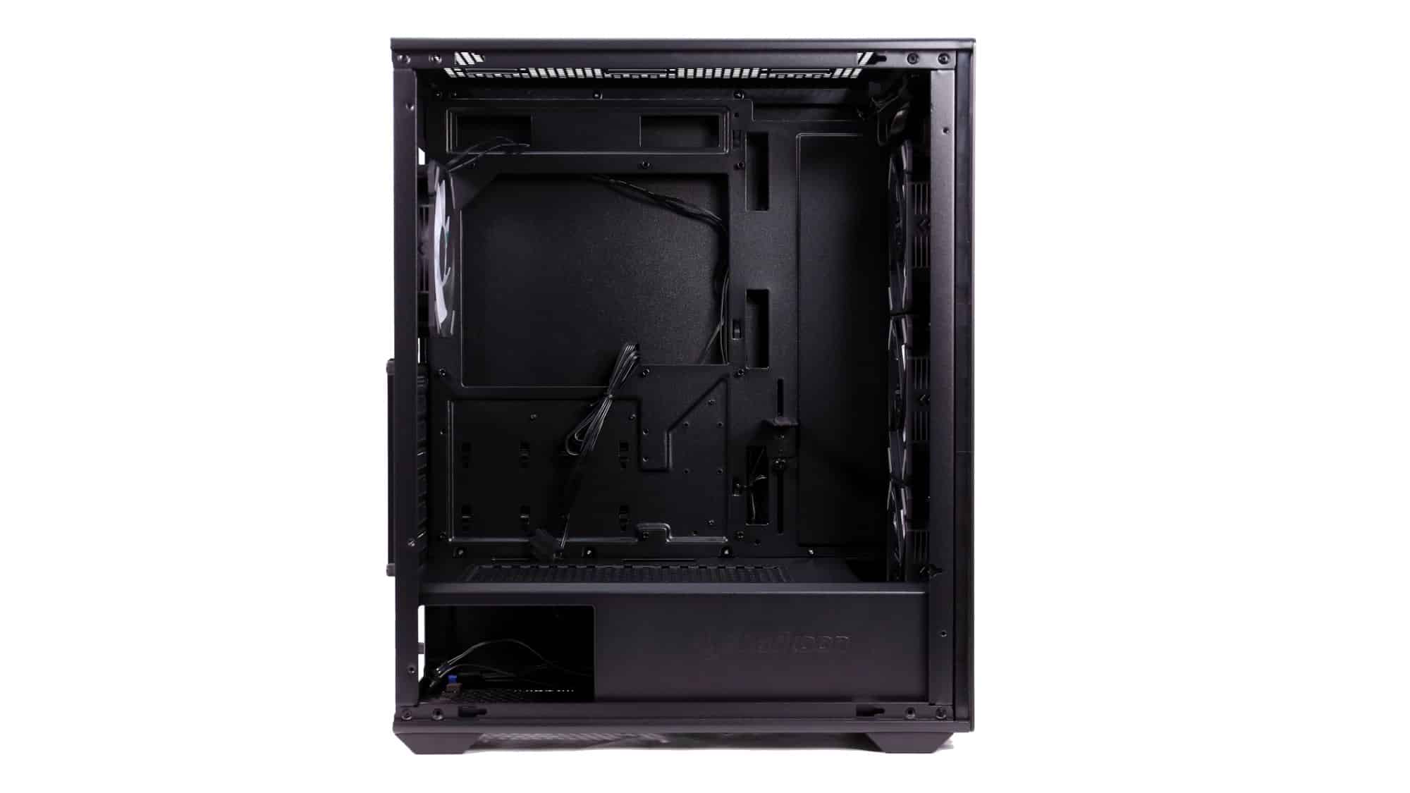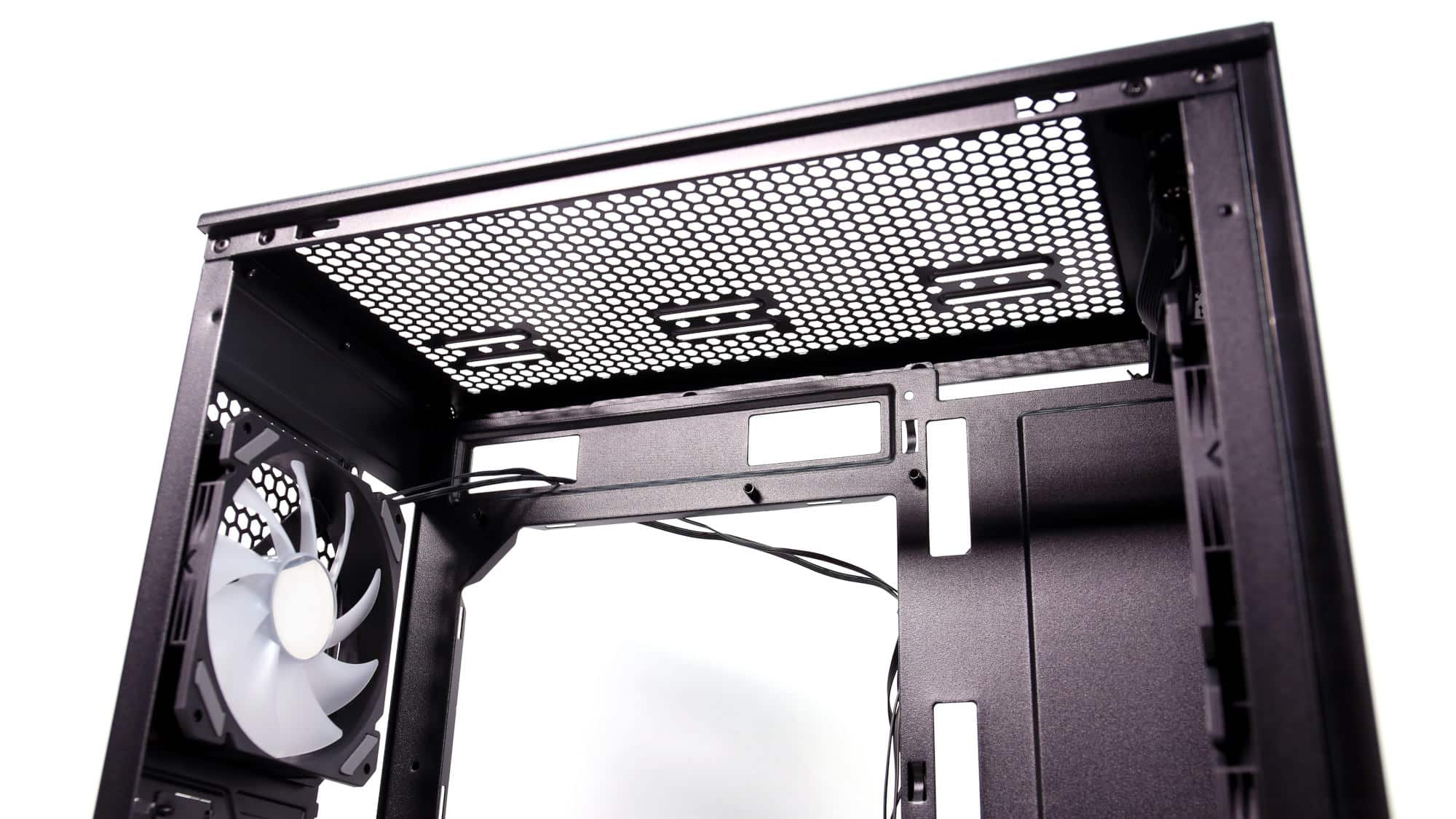 At the top right, a cutout routes the front, or rather, top I/O cables behind the motherboard tray. Above the motherboard, there’s sufficient clearance for a liquid cooling setup.