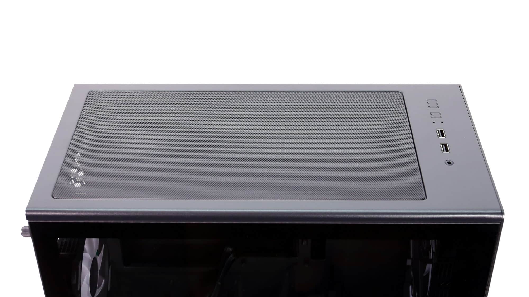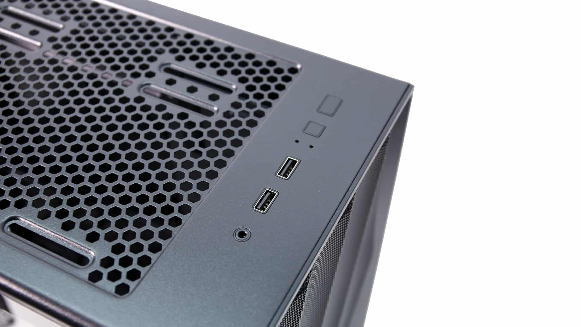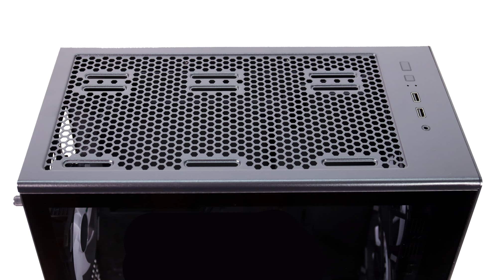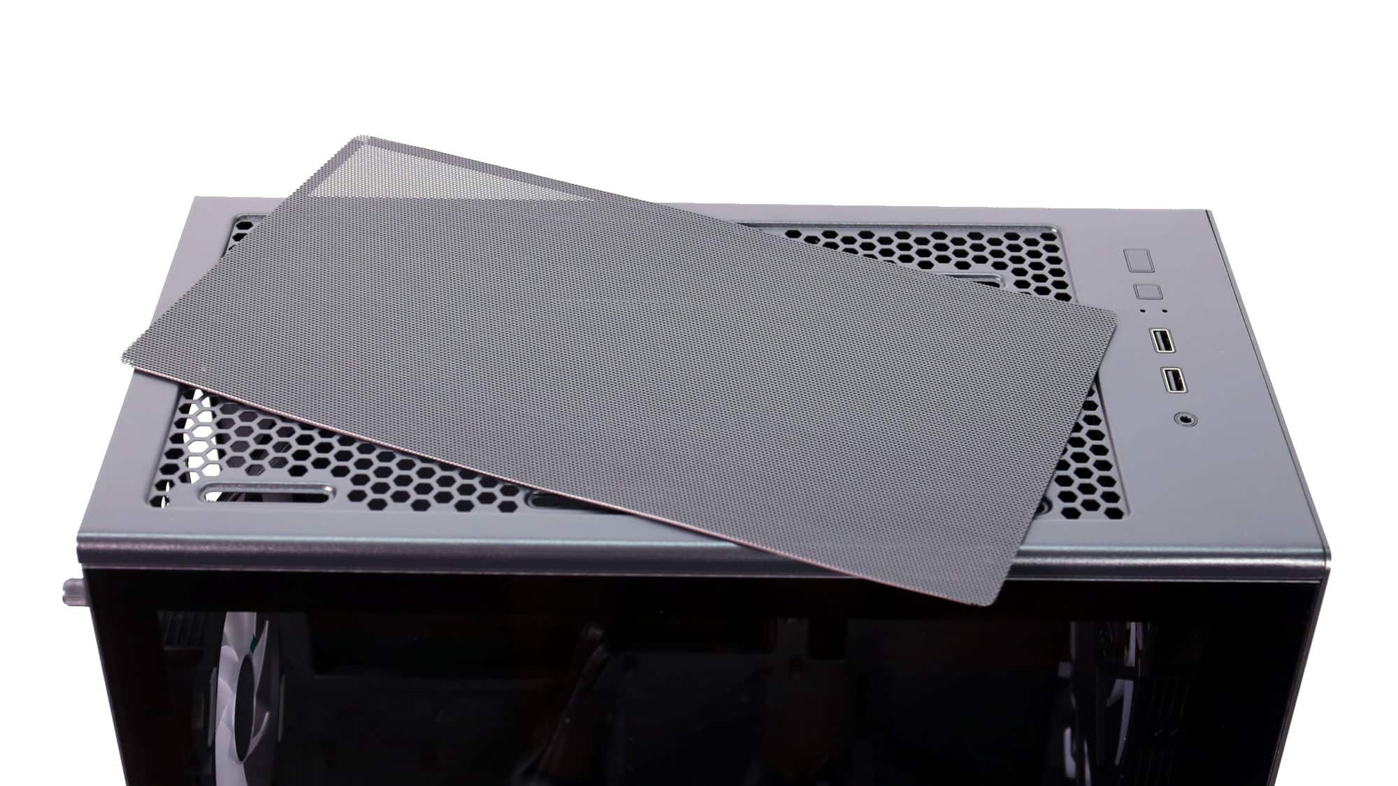 The top panel houses the chassis I/O and a magnetic dust filter. Beneath the filter is a hexagonal cutout pattern with mounting slots for cooling hardware. The I/O includes two USB 3.0 ports (USB 3.2 Gen 1 / 5Gbps), a combo audio jack, and a power button. Interestingly, the reset button has been repurposed to control the ARGB fans through the included hub.