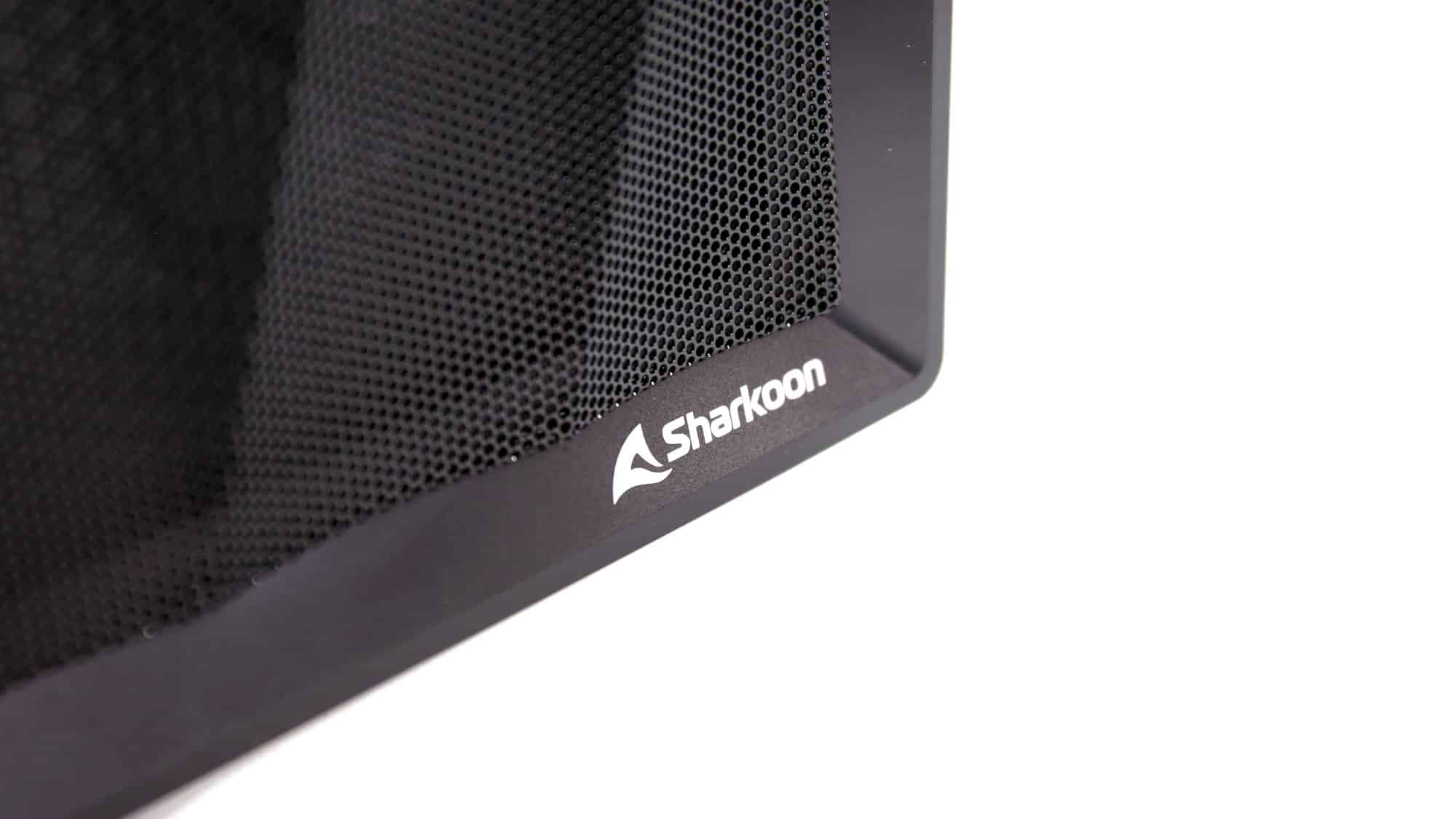 The entire left side is covered by the glass panel, running from top to bottom. The front panel is removable, featuring a classic bottom cutout for a secure grip. The mesh features a wavy pattern that adds both visual interest and rigidity. A silver Sharkoon logo sits at the bottom right.