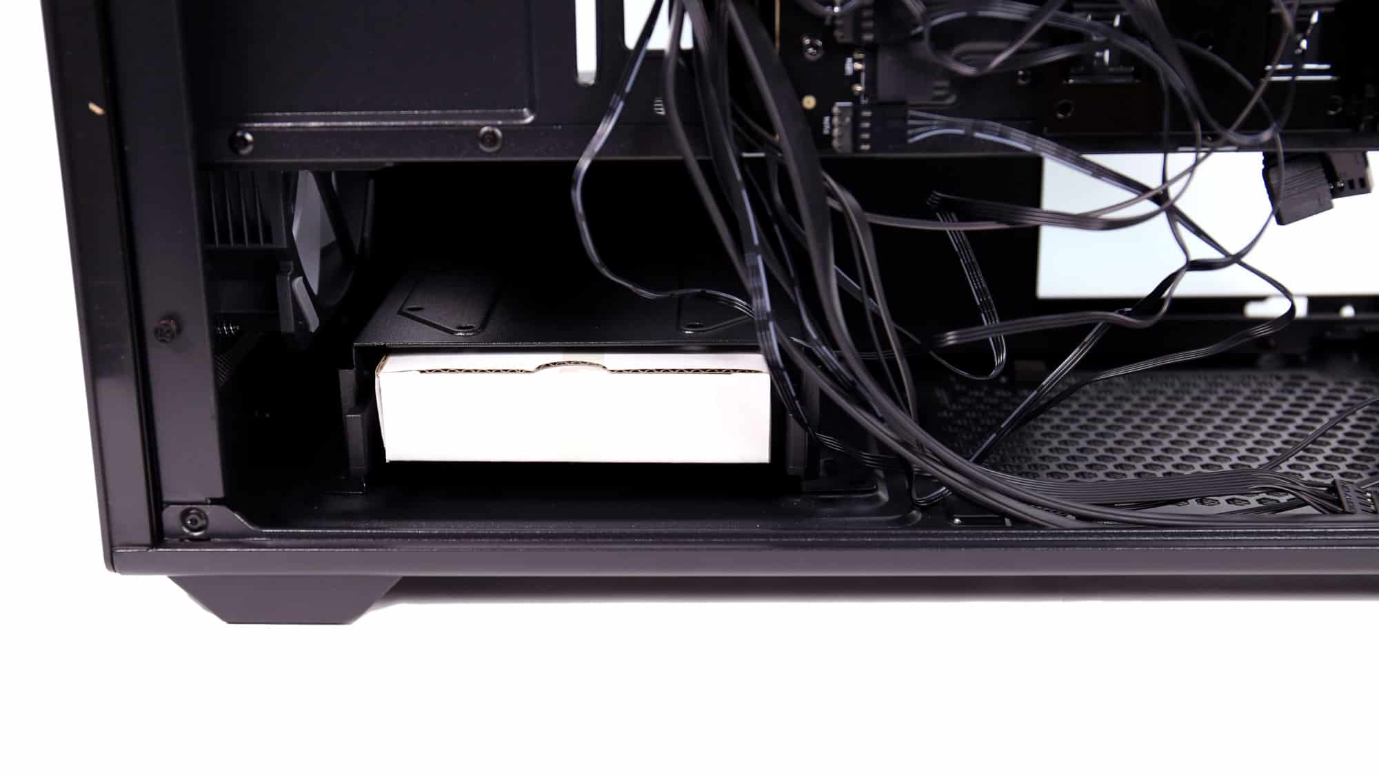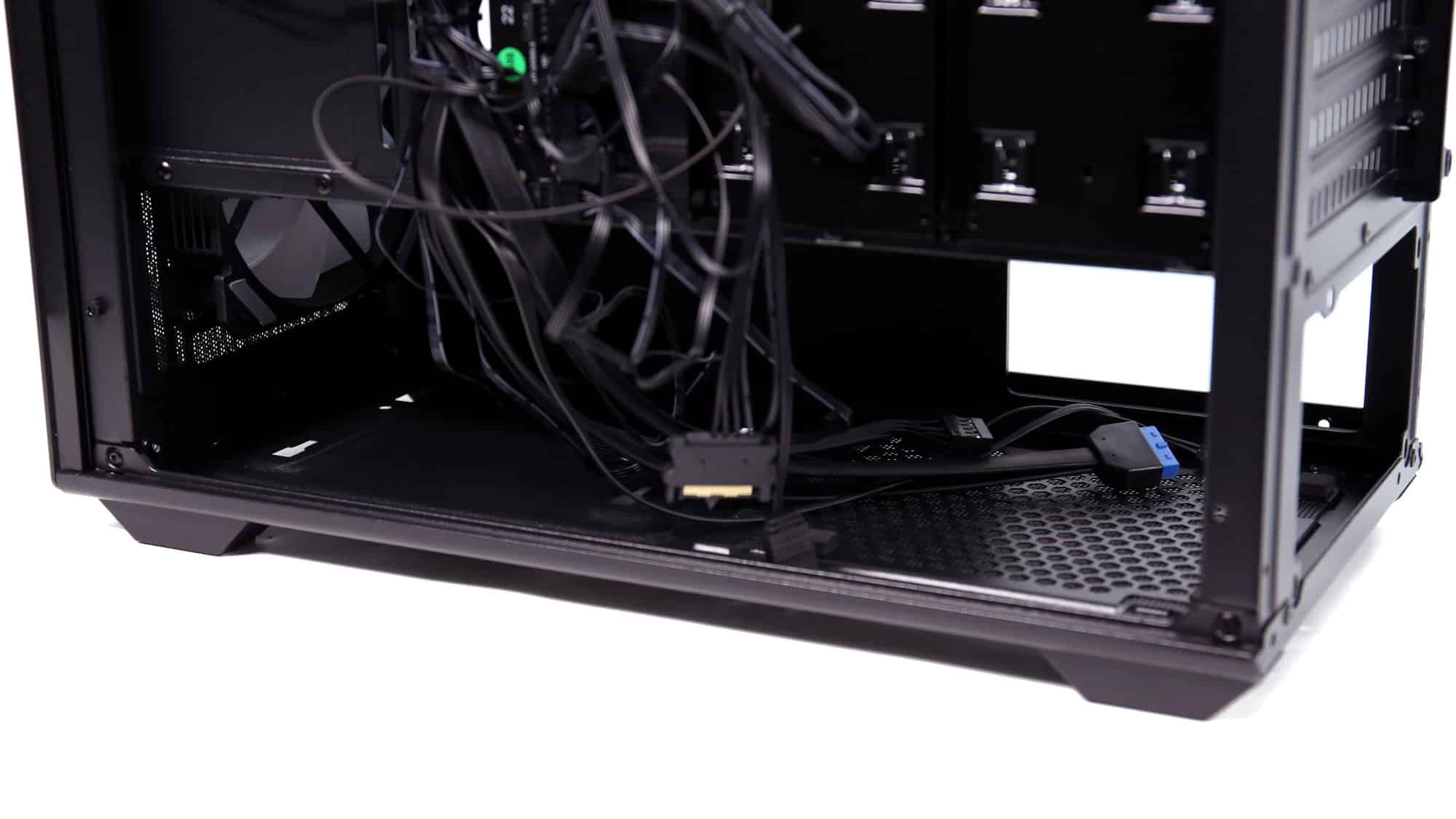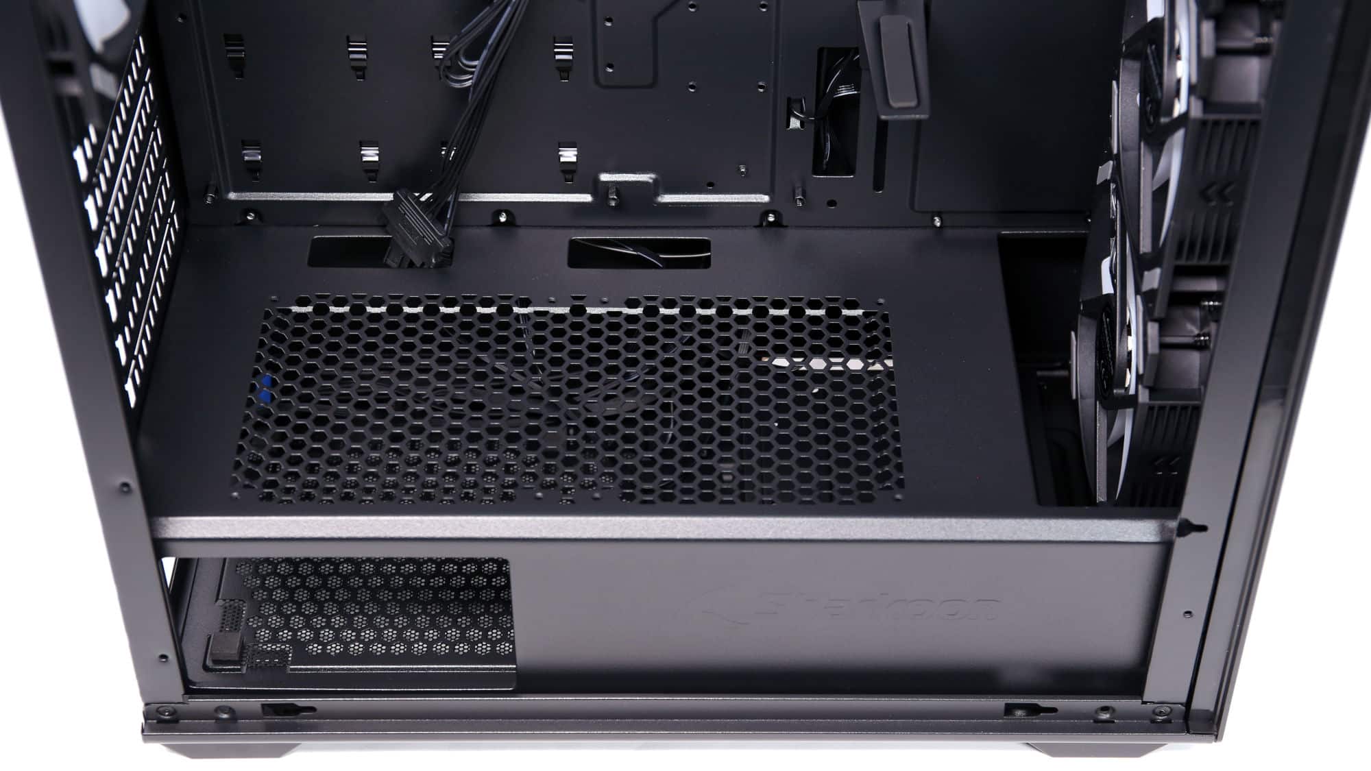 At the bottom, you’ll find a storage cage alongside the PSU bay. While the PSU is intended to pull fresh air from the underside, the cage design allows some additional airflow from above.