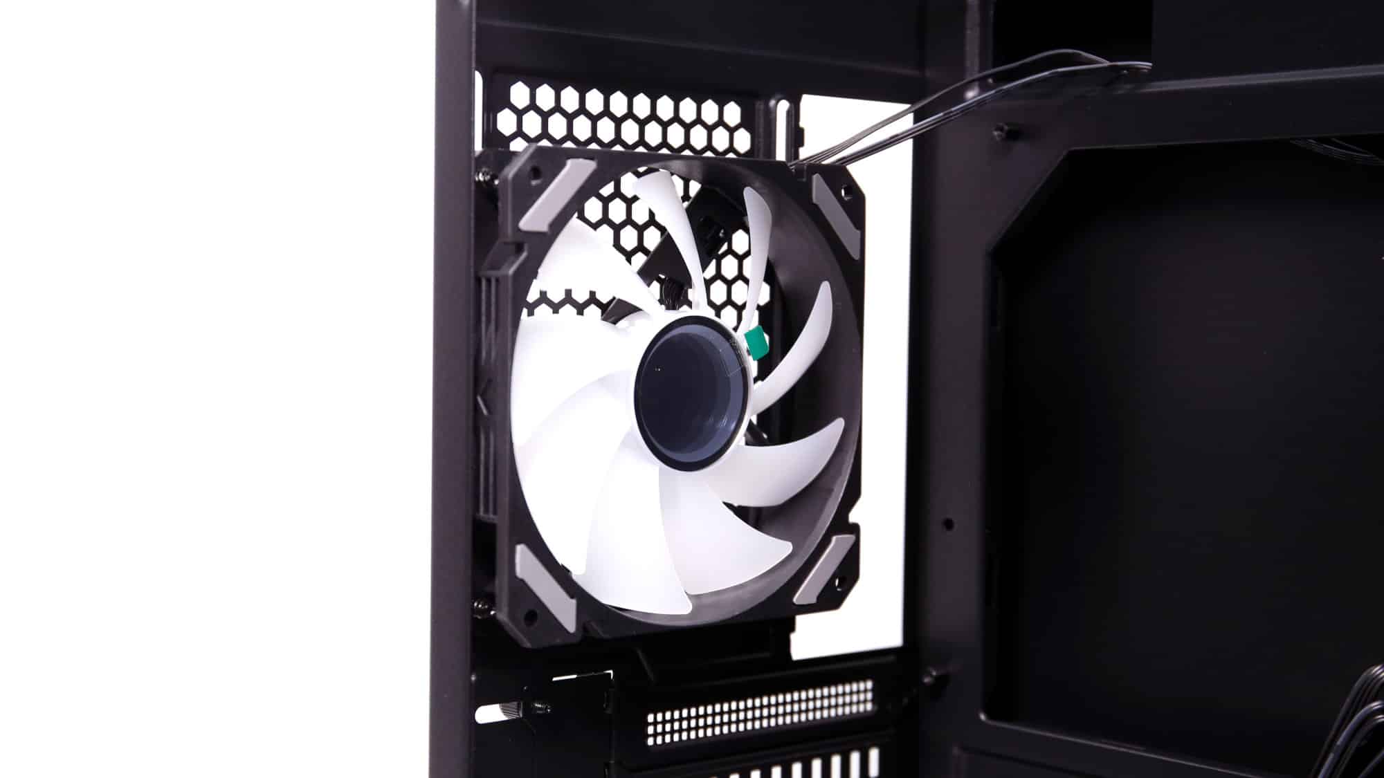 At the front, you’ll find three of the four included fans used for intake, and at the rear, the last one serves as exhaust. The elongated slots allow for vertical adjustment. At the top, there is the option for dual 120mm or 140mm fans, with support for up to a 280mm AIO. The front also supports up to a 360mm radiator. Lastly, for an extra cooling boost to your GPU, you may install two more 120mm fans on top of the PSU enclosure.