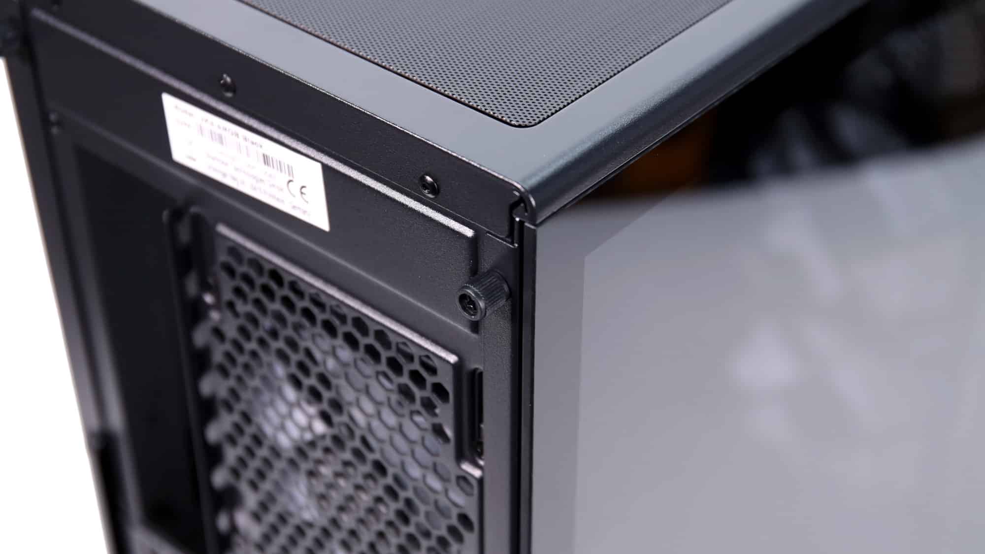 At the back, you’ll find a 120mm fan opening, the motherboard I/O cutout, seven expansion slots (with the top one using a different design), and a bottom-mounted PSU bay. The PCIe cover panel, as well as both side panels, are secured with thumbscrews for tool-less access. Most expansion slot covers are the break-away type, except for the top one.