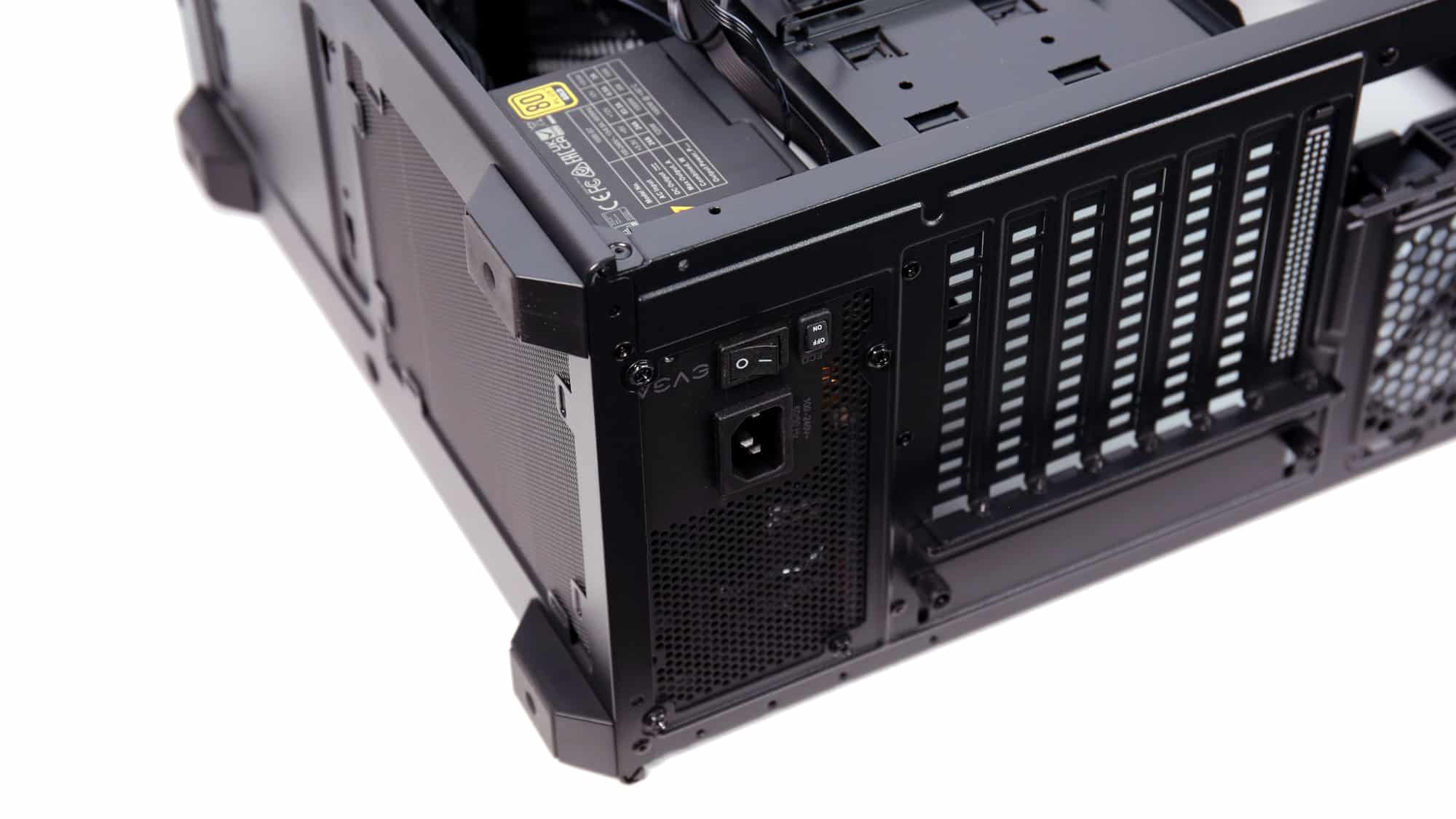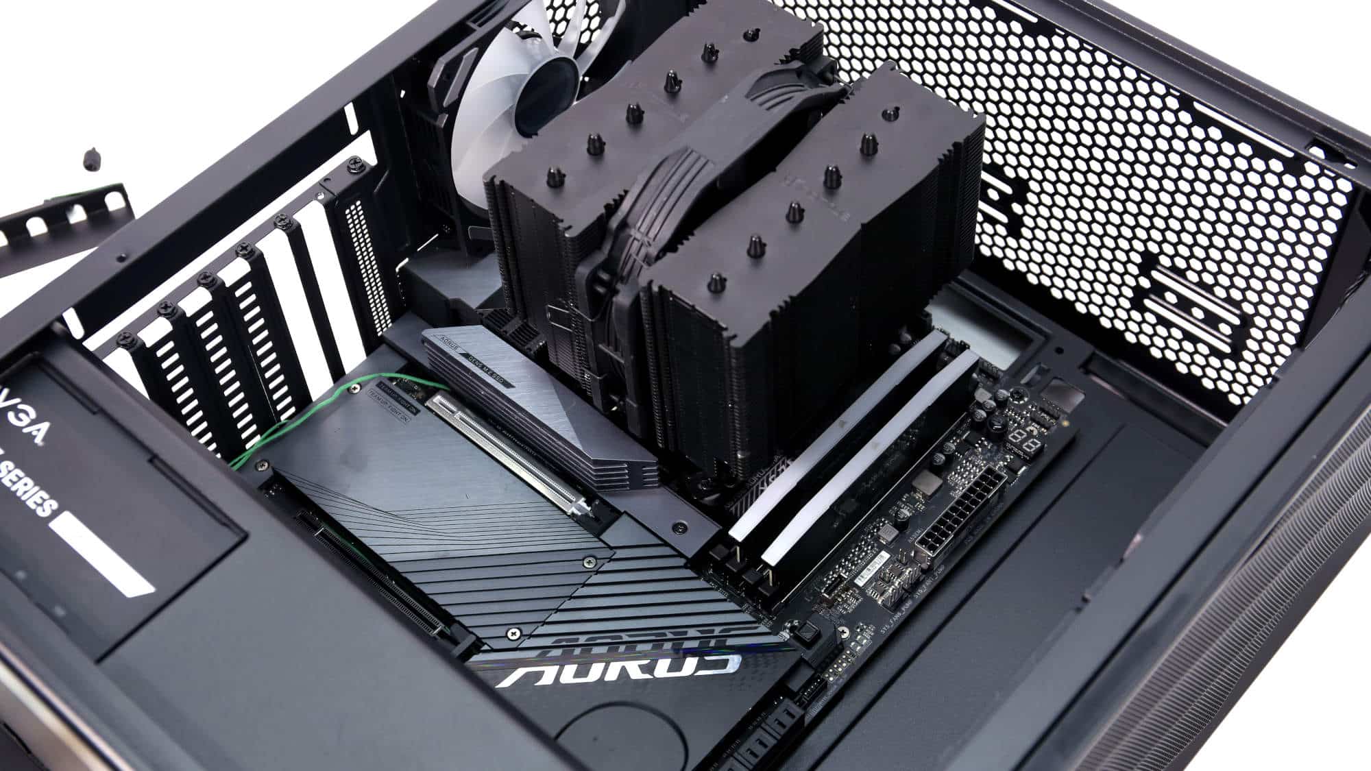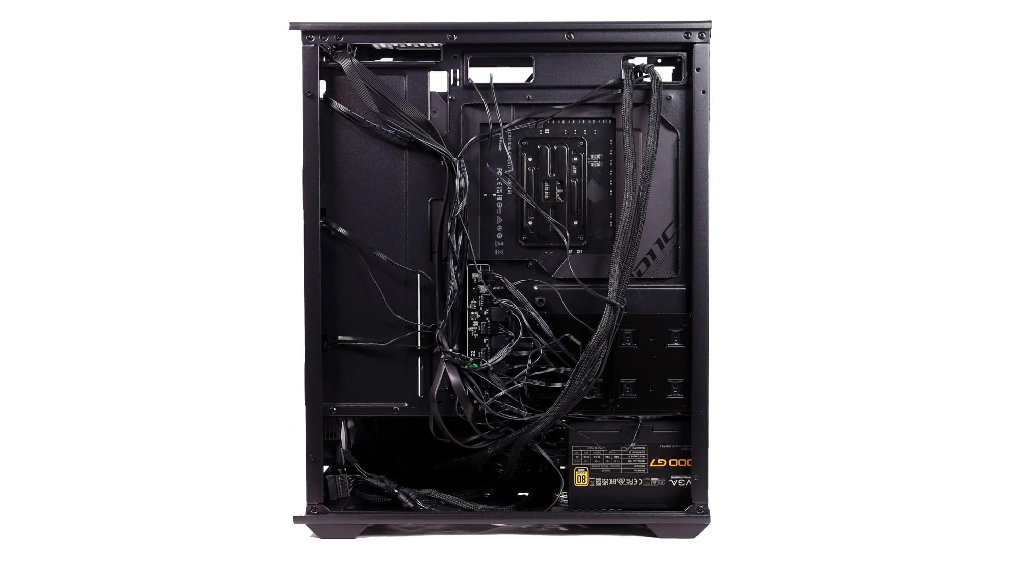 We began by installing the PSU in the bottom bay. Removing the storage cage gave us extra room for cables. Our E-ATX motherboard went in next, but because it covered the passthroughs, the ATX cable had to be routed through the front radiator cutout. To fit the board, we also had to loosen and remove the rear fan due to the tight clearance.