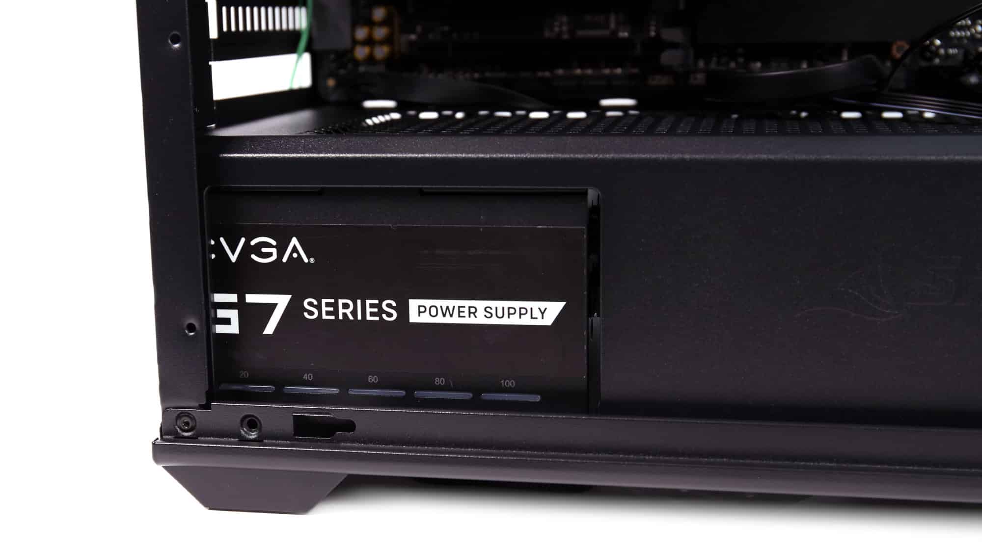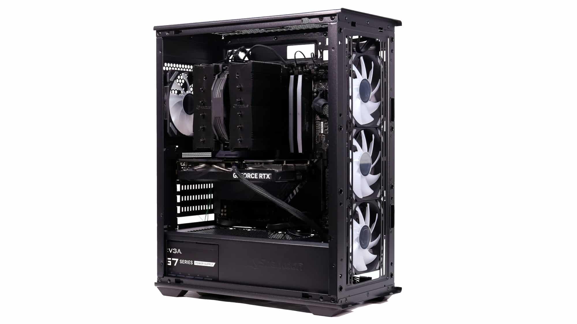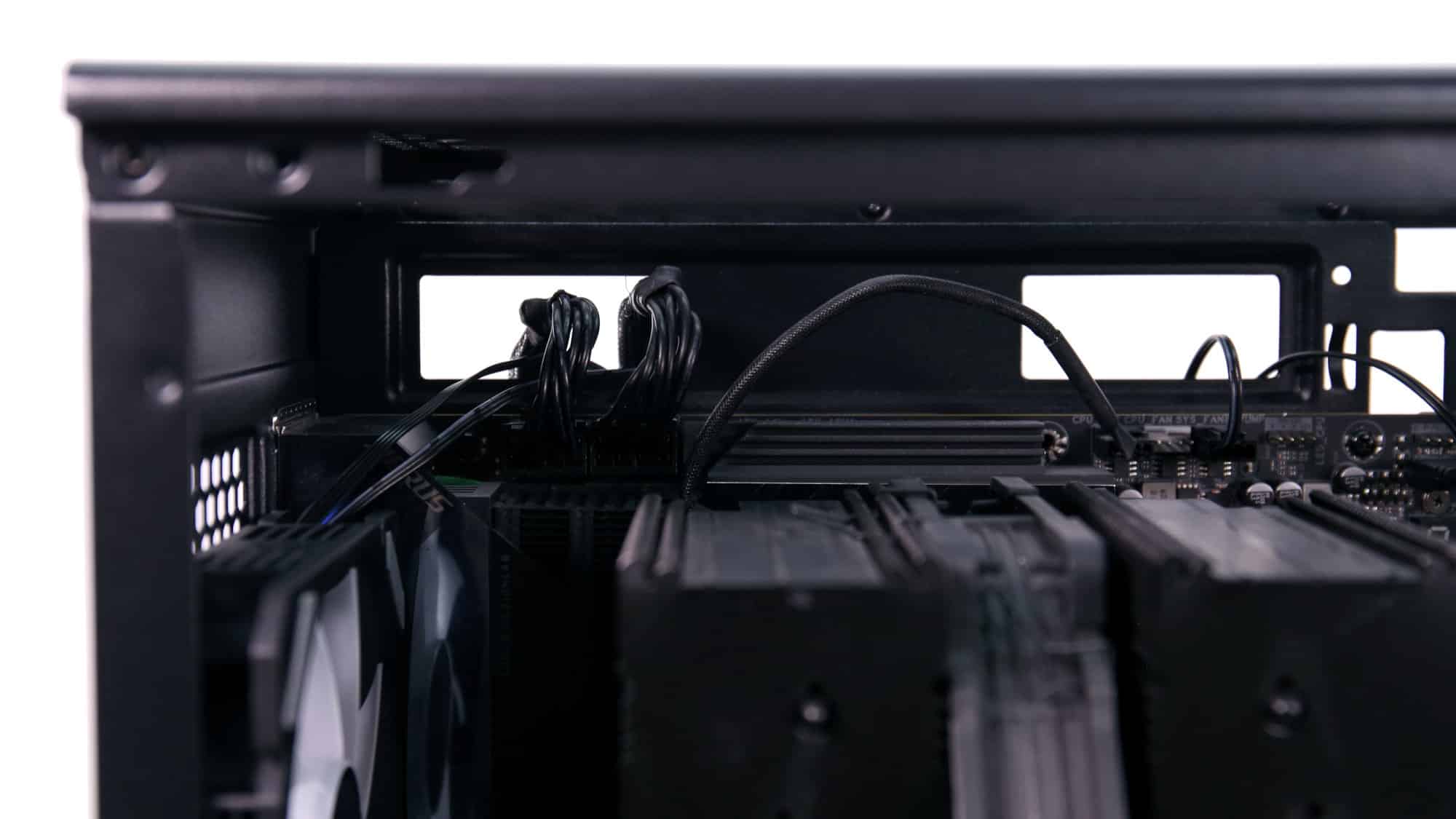 We began by installing the PSU in the bottom bay. Removing the storage cage gave us extra room for cables. Our E-ATX motherboard went in next, but because it covered the passthroughs, the ATX cable had to be routed through the front radiator cutout. To fit the board, we also had to loosen and remove the rear fan due to the tight clearance.