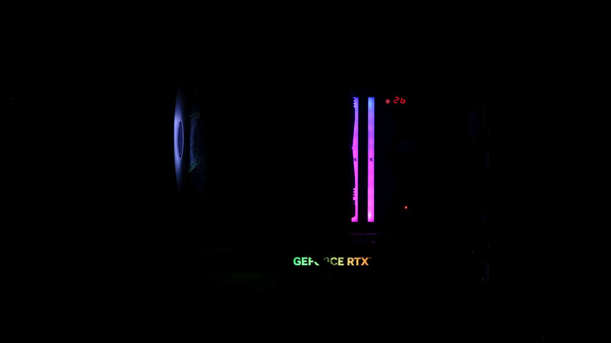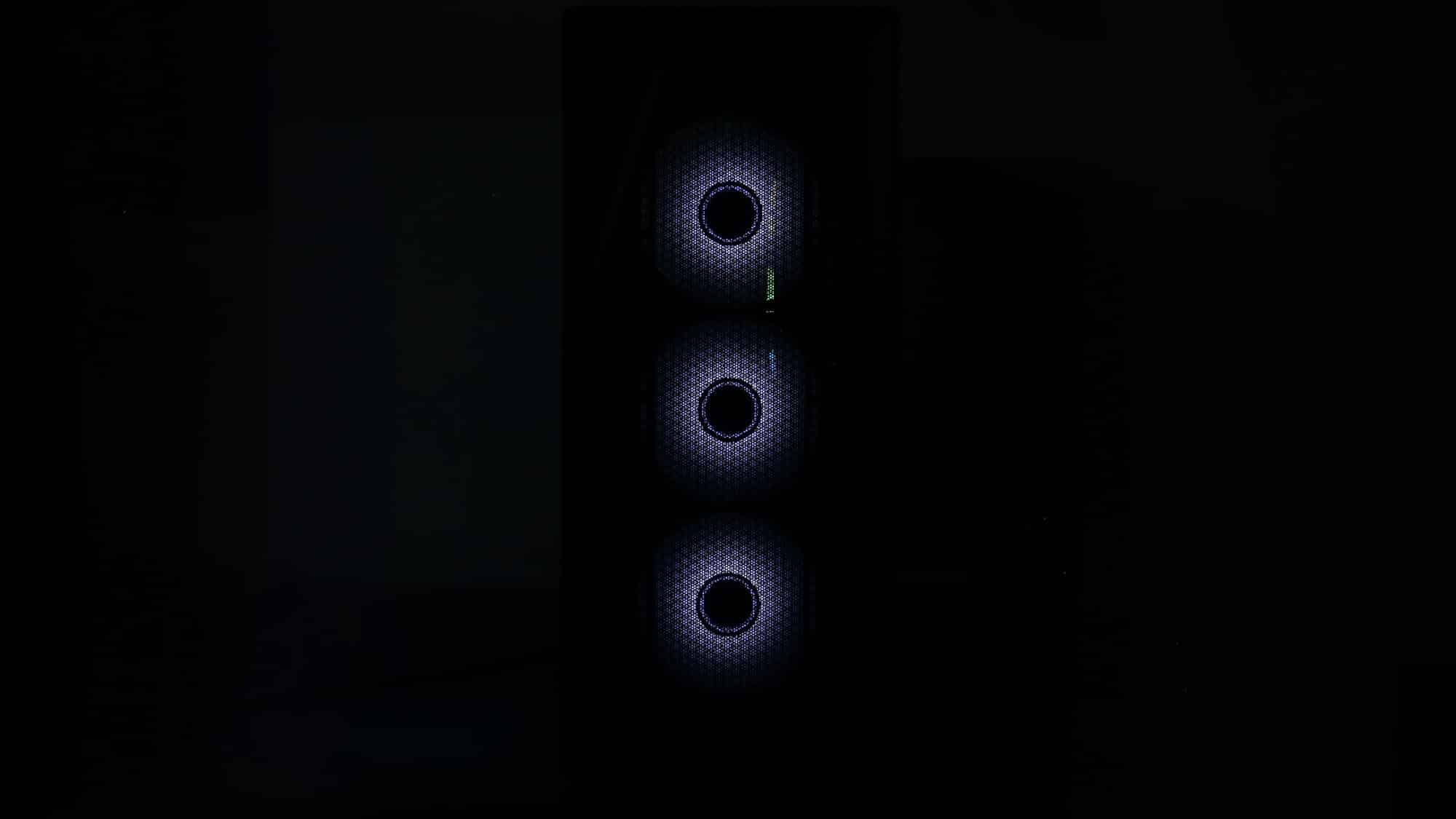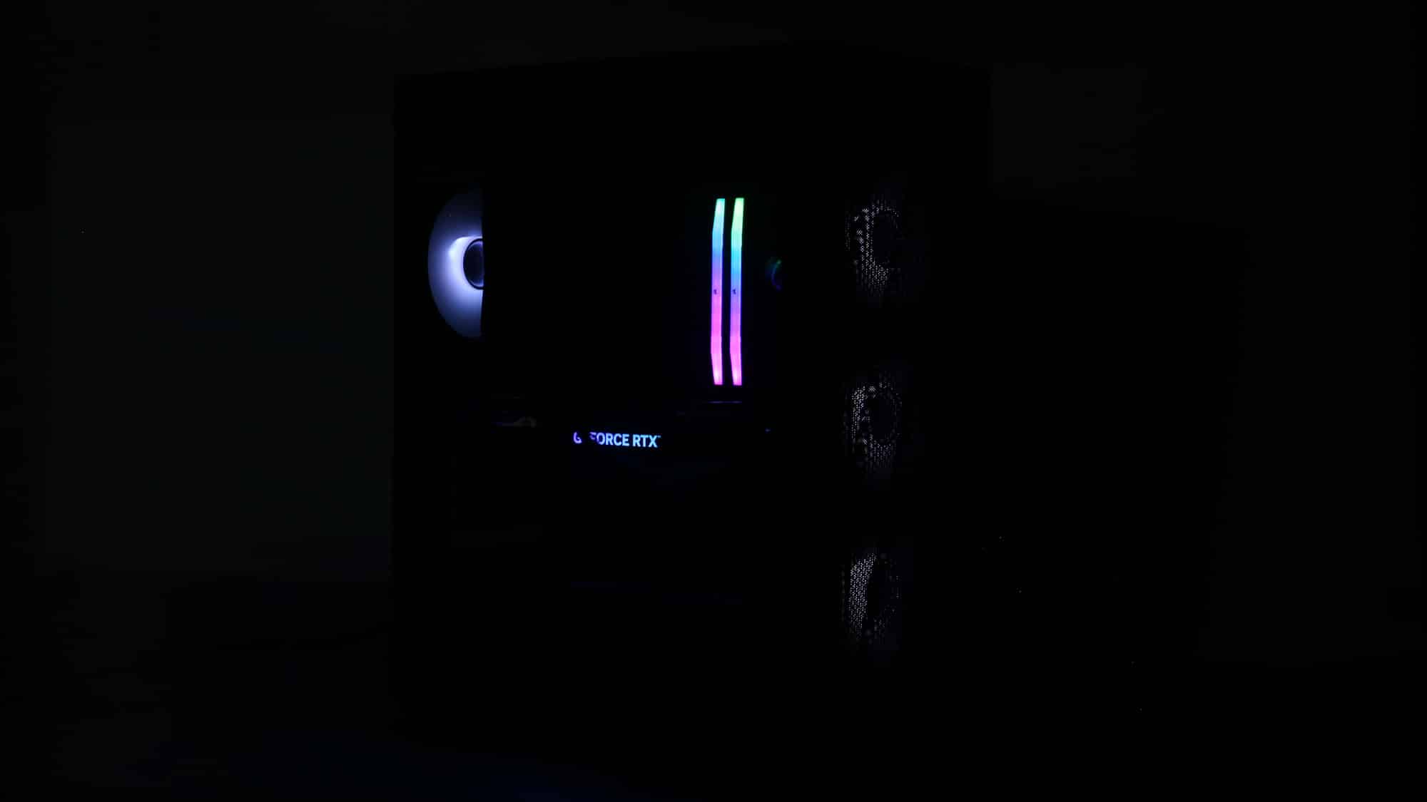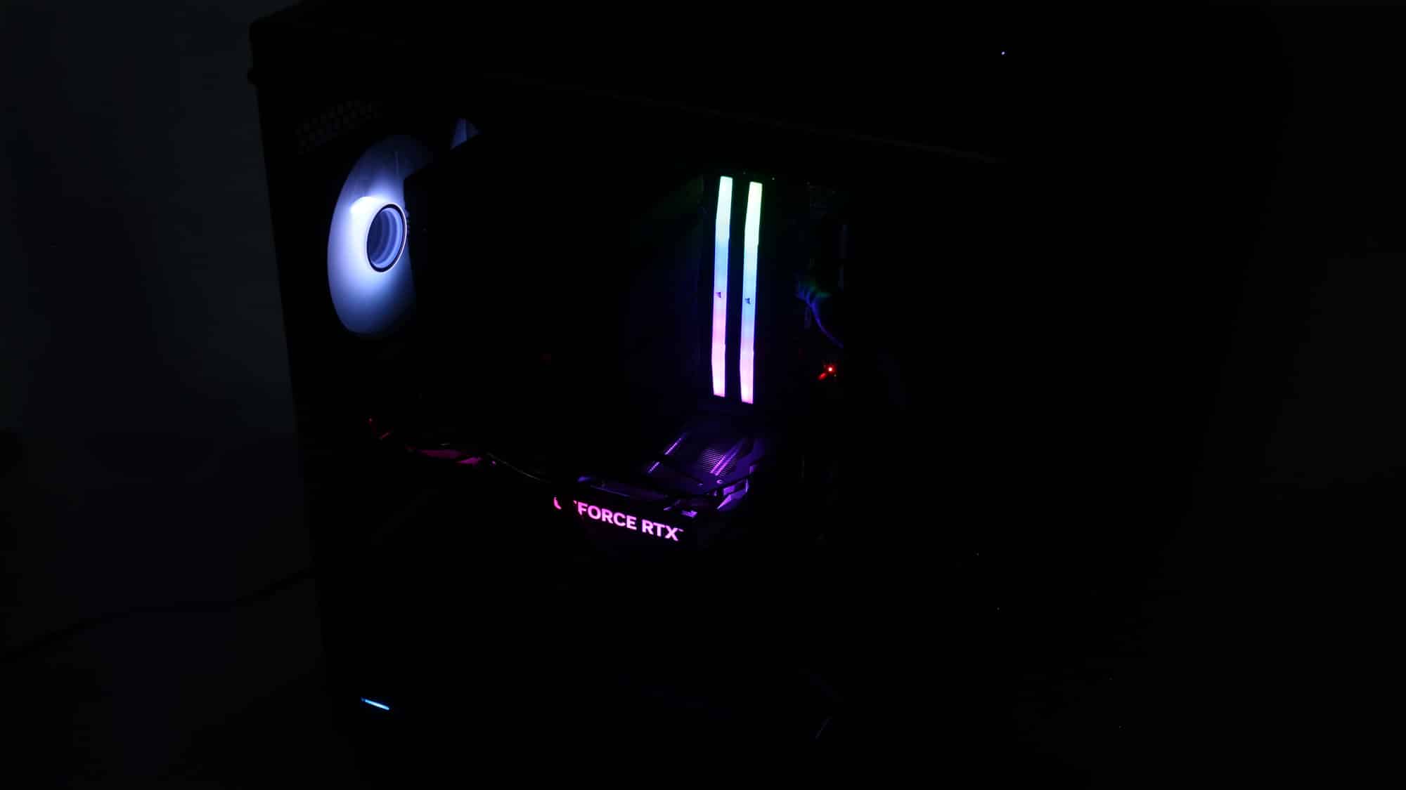 The finished build had a clean, all-black theme. With the ARGB lighting on, the case transforms visually; the front mesh mutes brightness, but the side glass still provides a bold glow.