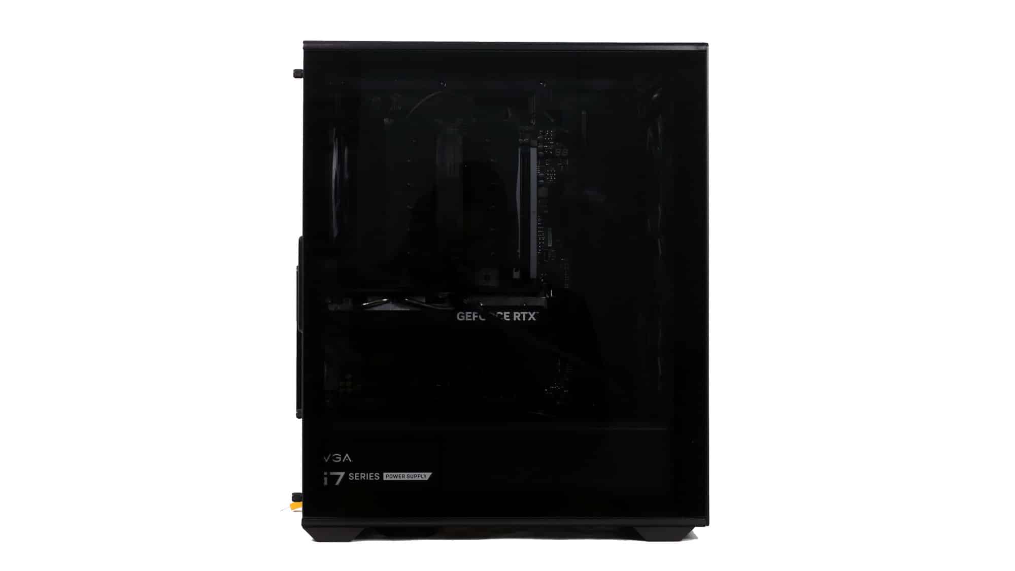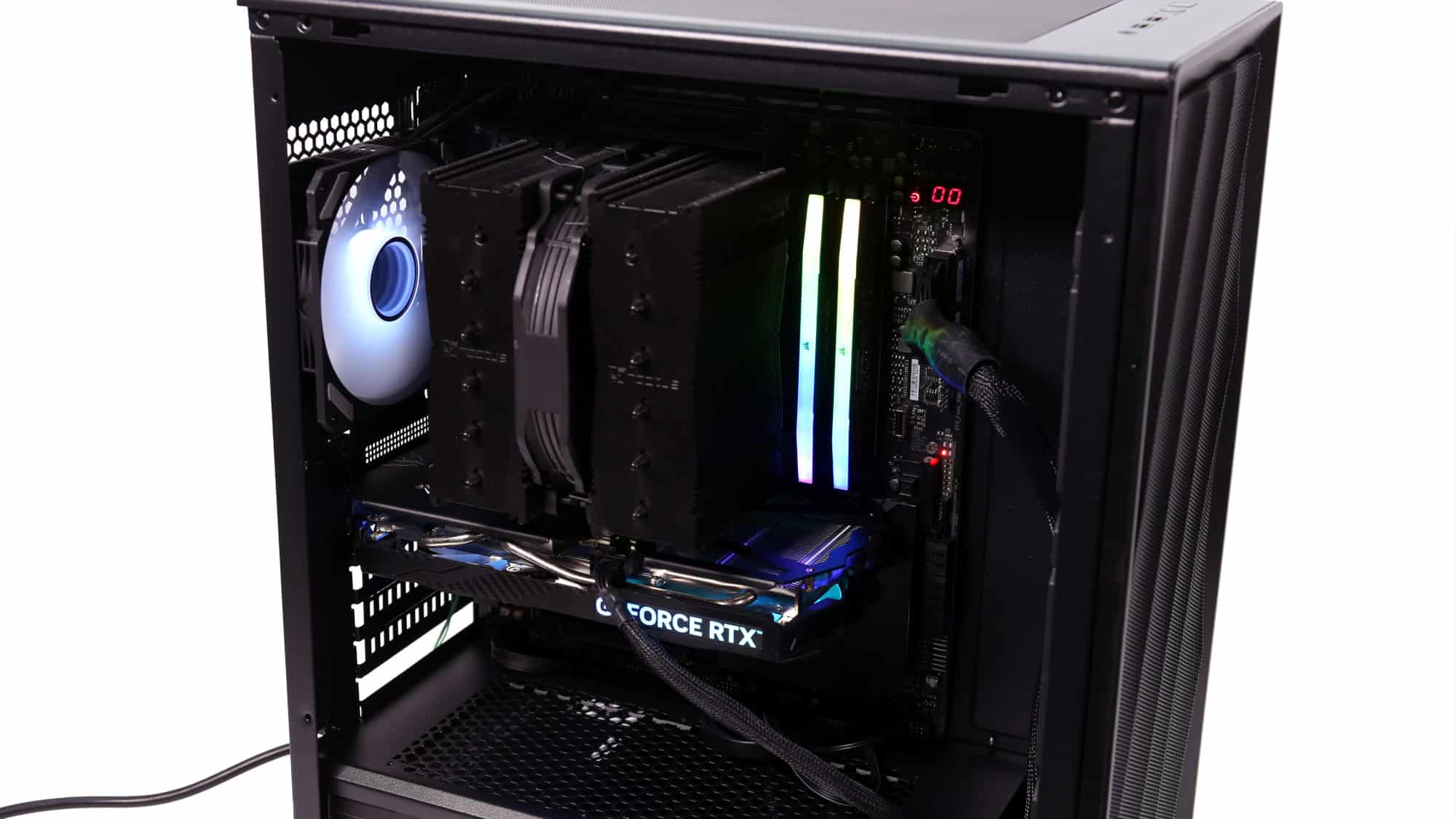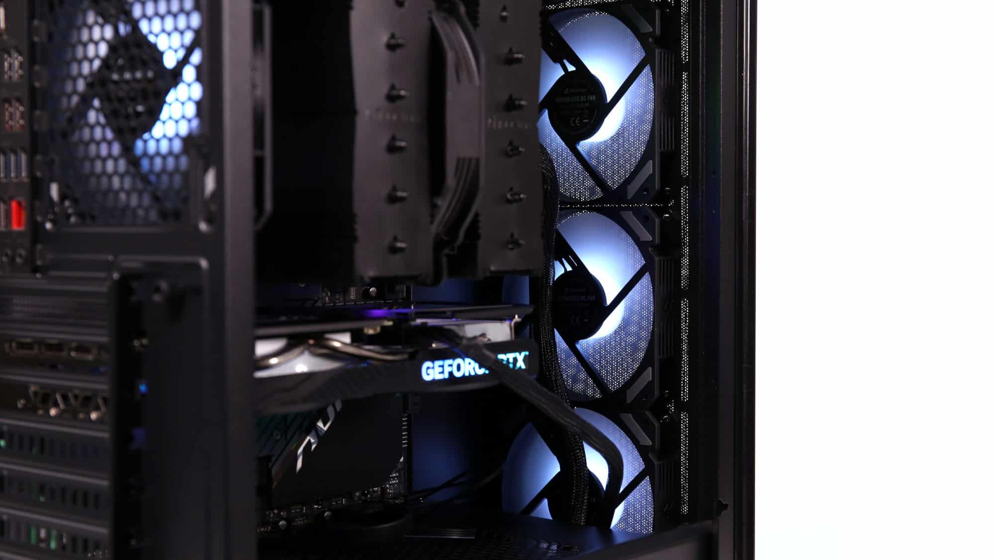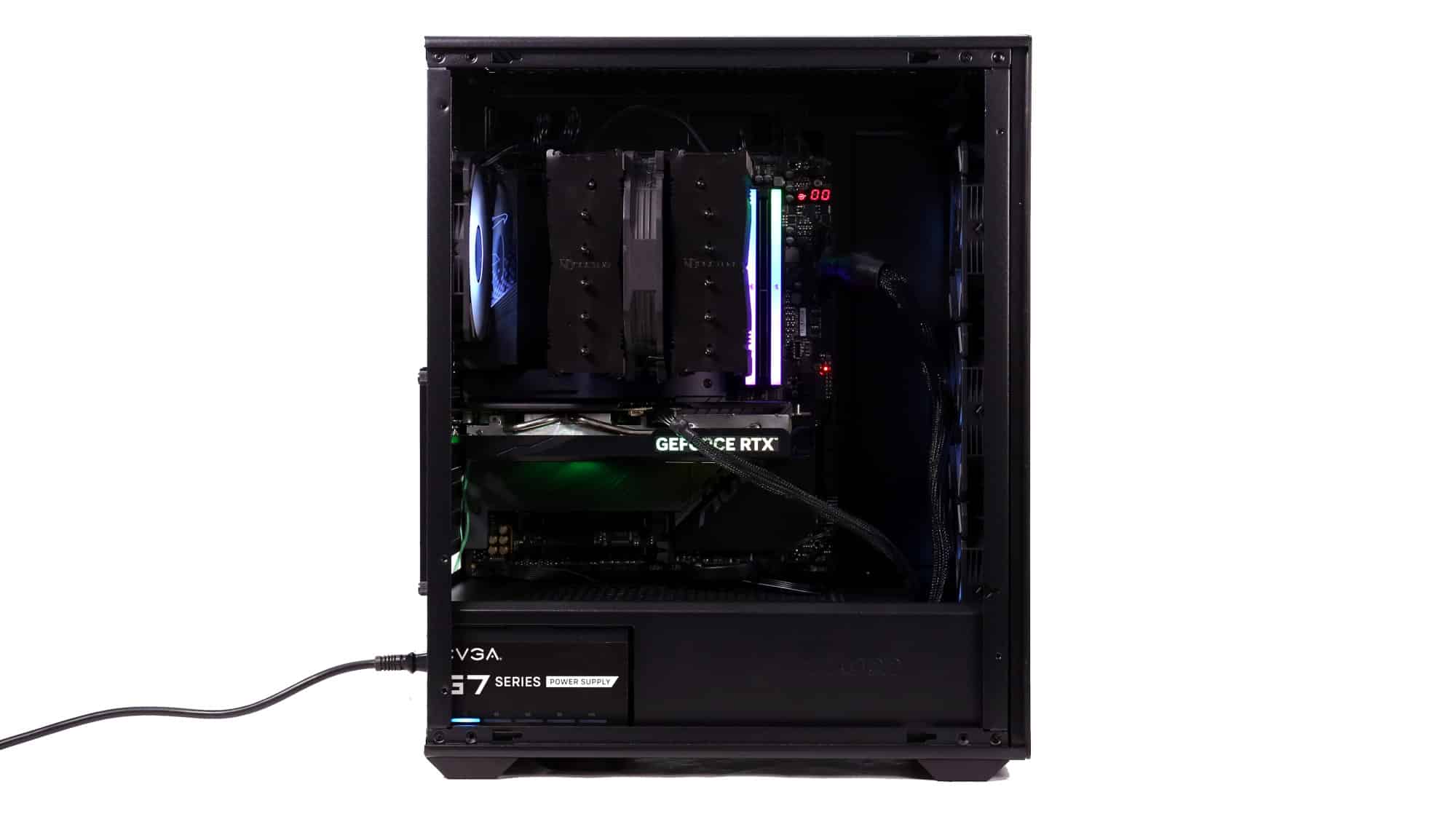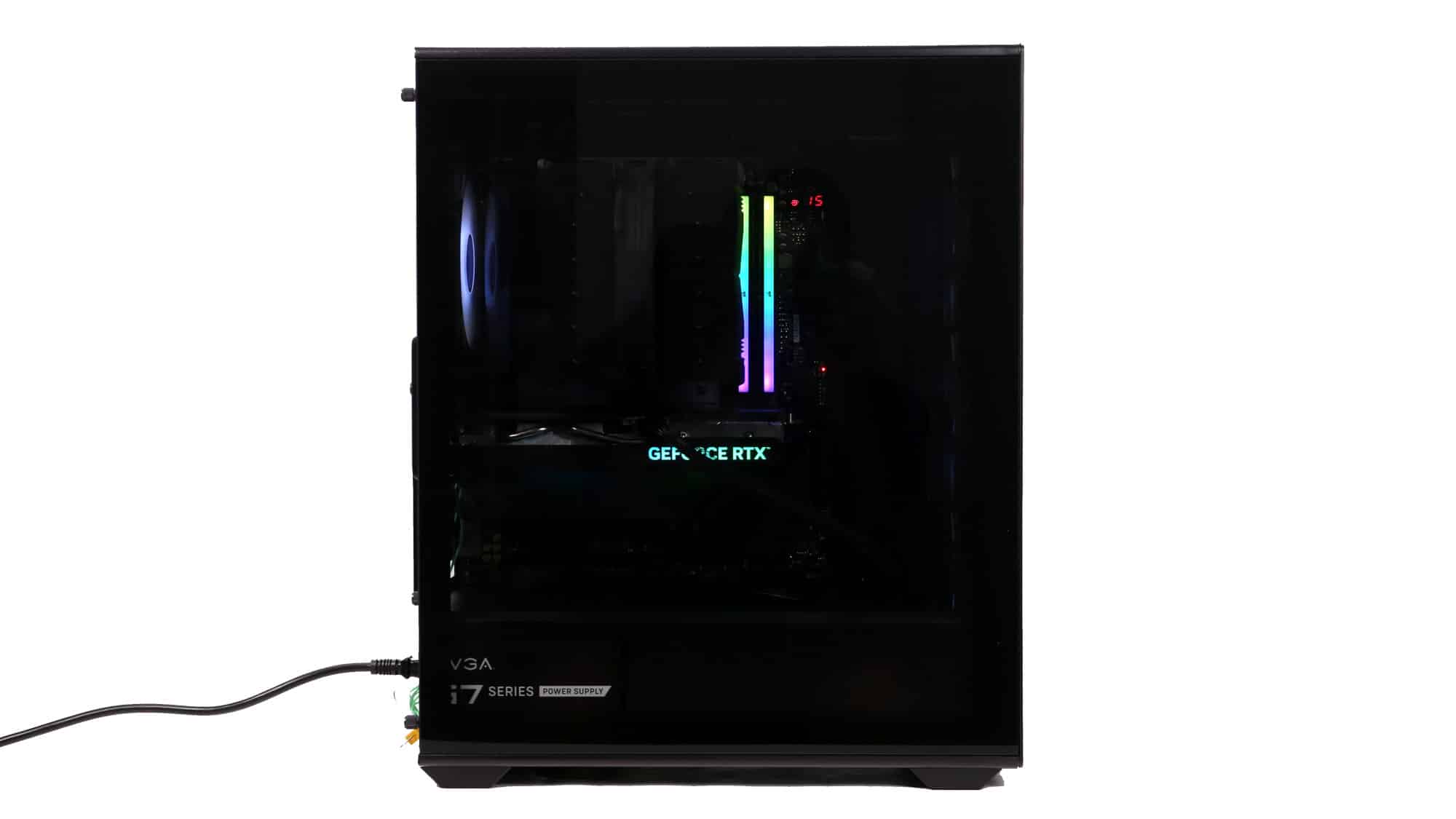 The finished build had a clean, all-black theme. With the ARGB lighting on, the case transforms visually; the front mesh mutes brightness, but the side glass still provides a bold glow.