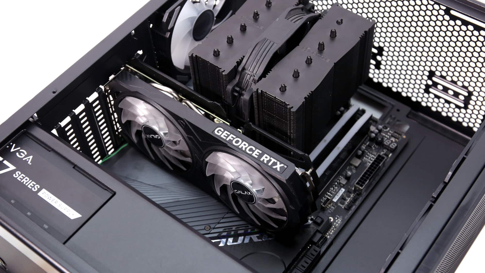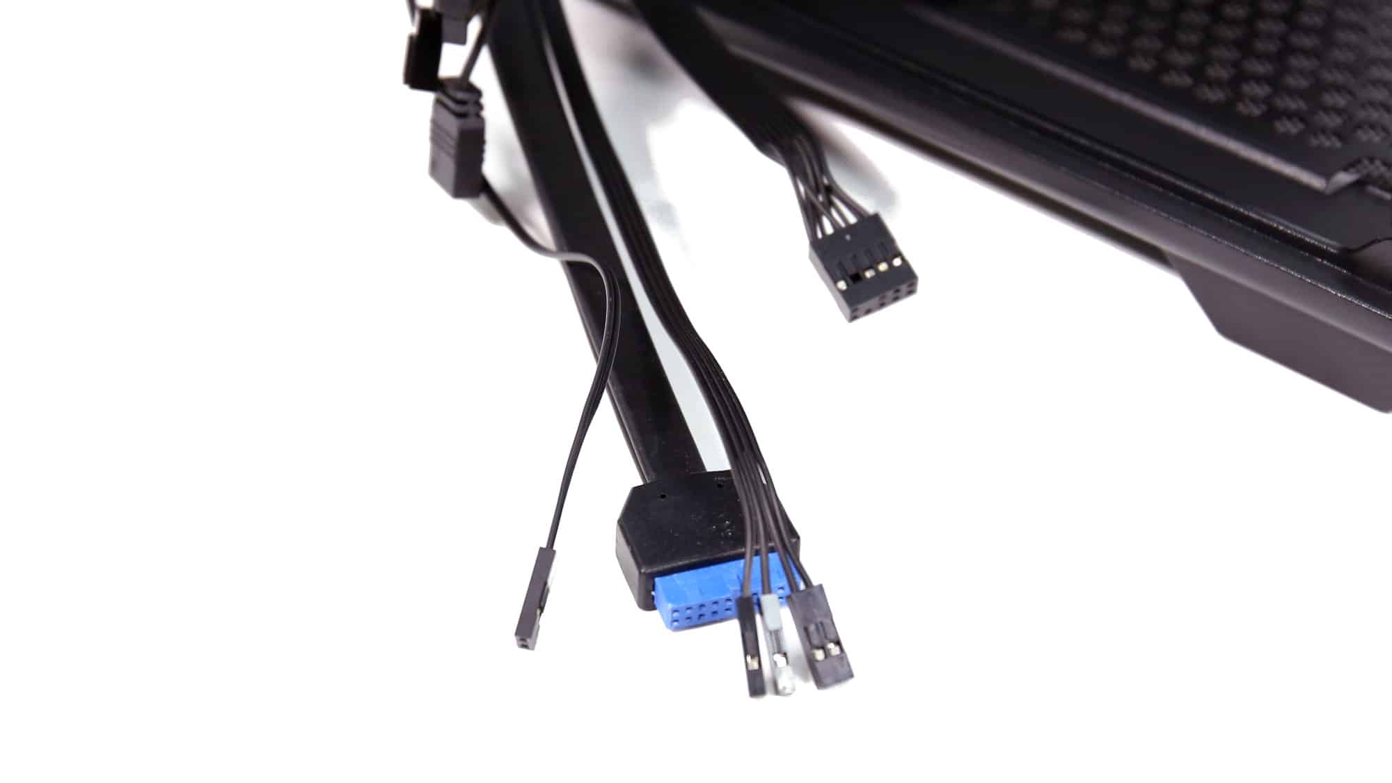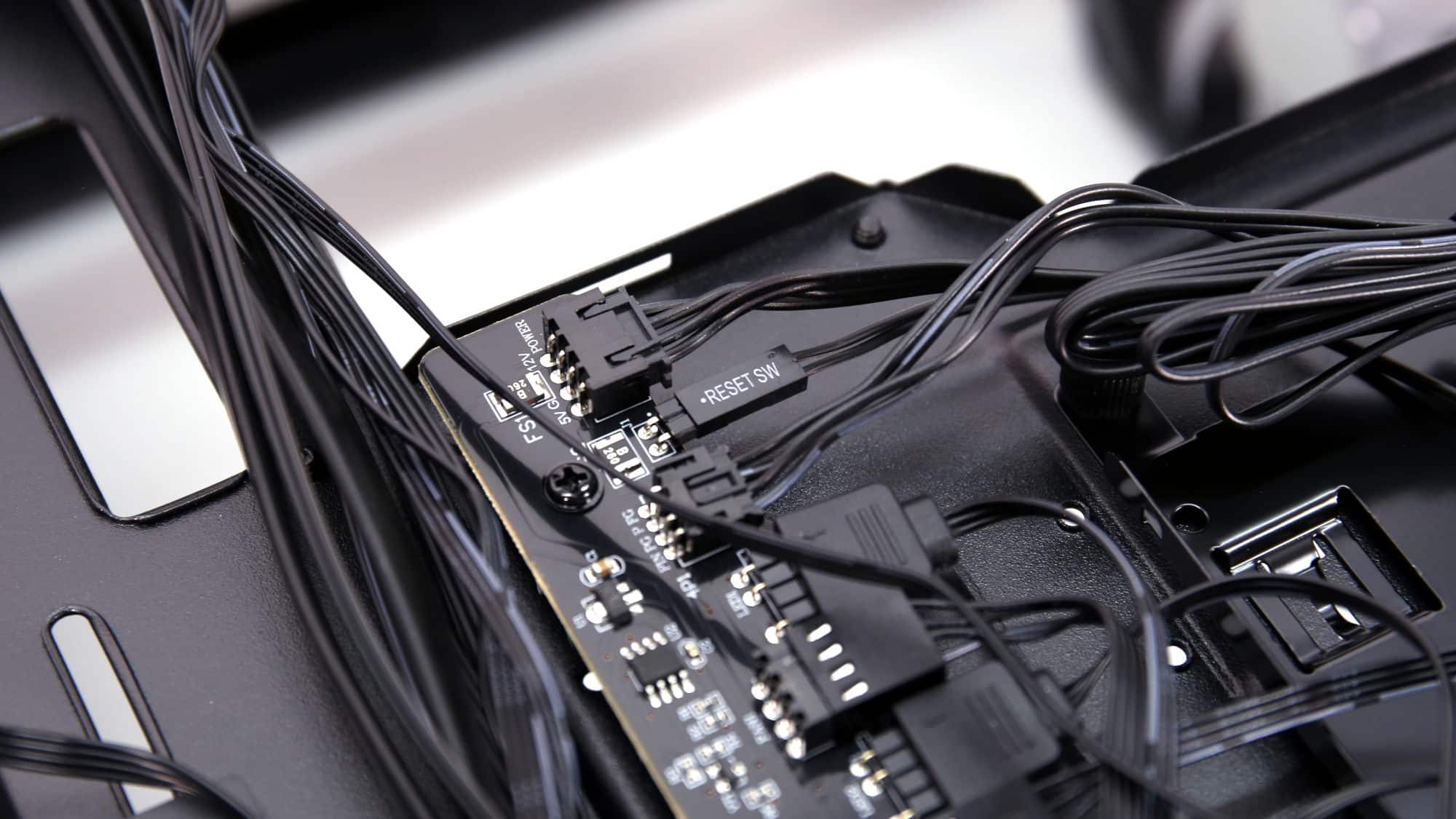 The front I/O cables were connected at the bottom, and the hub cables were routed toward the top. CPU power cables were easy to install thanks to the generous clearance above the motherboard. Finally, we installed the GPU and secured the expansion slots. As you can see, the Reset cable connected to the hub could be repurposed as a regular Reset button.