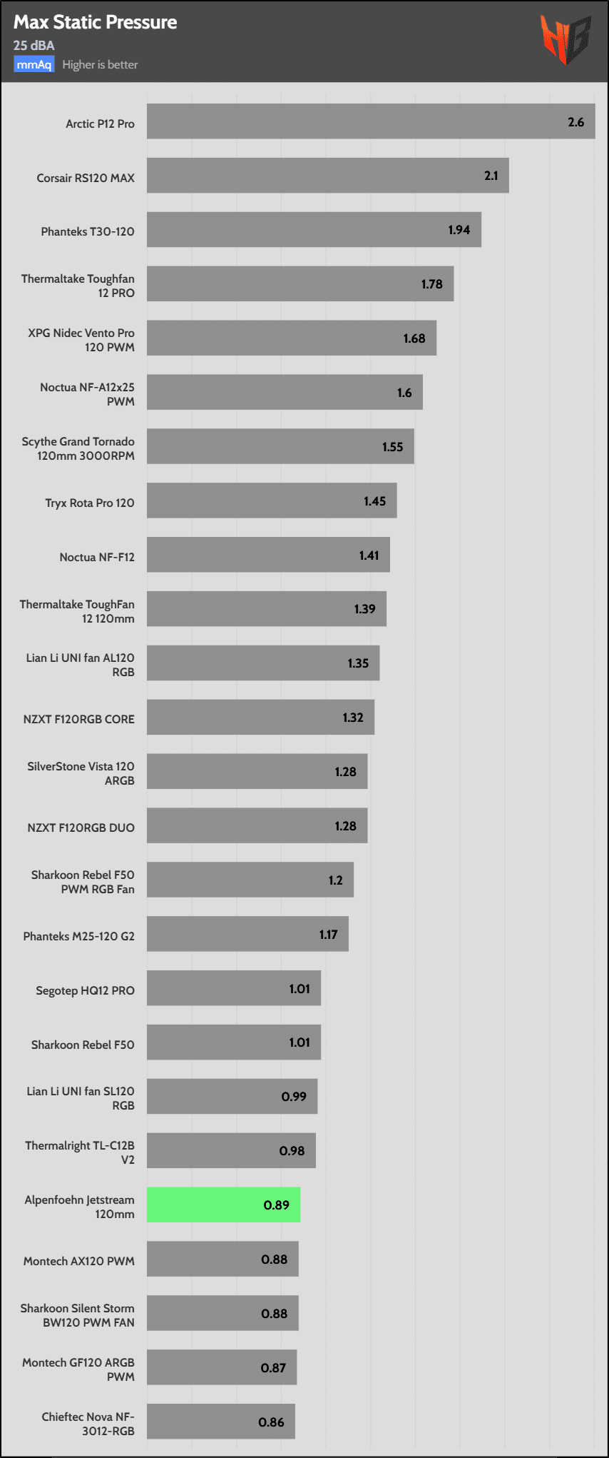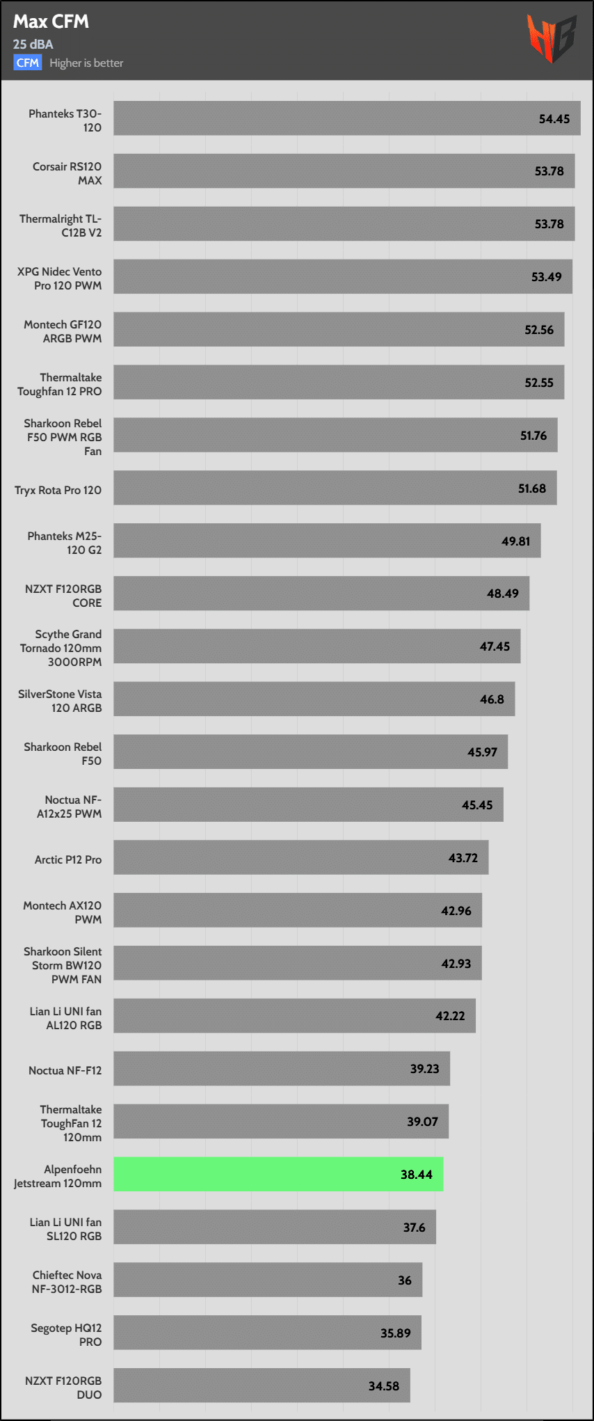 At 25 dBA, the fan’s airflow is low, and its static pressure is among the lowest. At 15 euros, this fan is currently sold; you can find way better choices, including the Arctic P12 Pro, which achieves top static performance and decent airflow. If you want top airflow without spending much, look at the Thermalright TL-C12B V2 and the Montech GF120, which also offers ARGB lighting.
