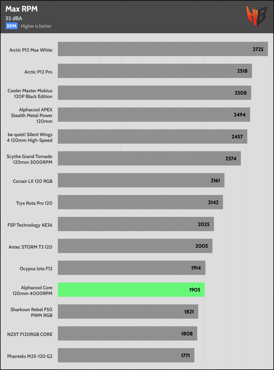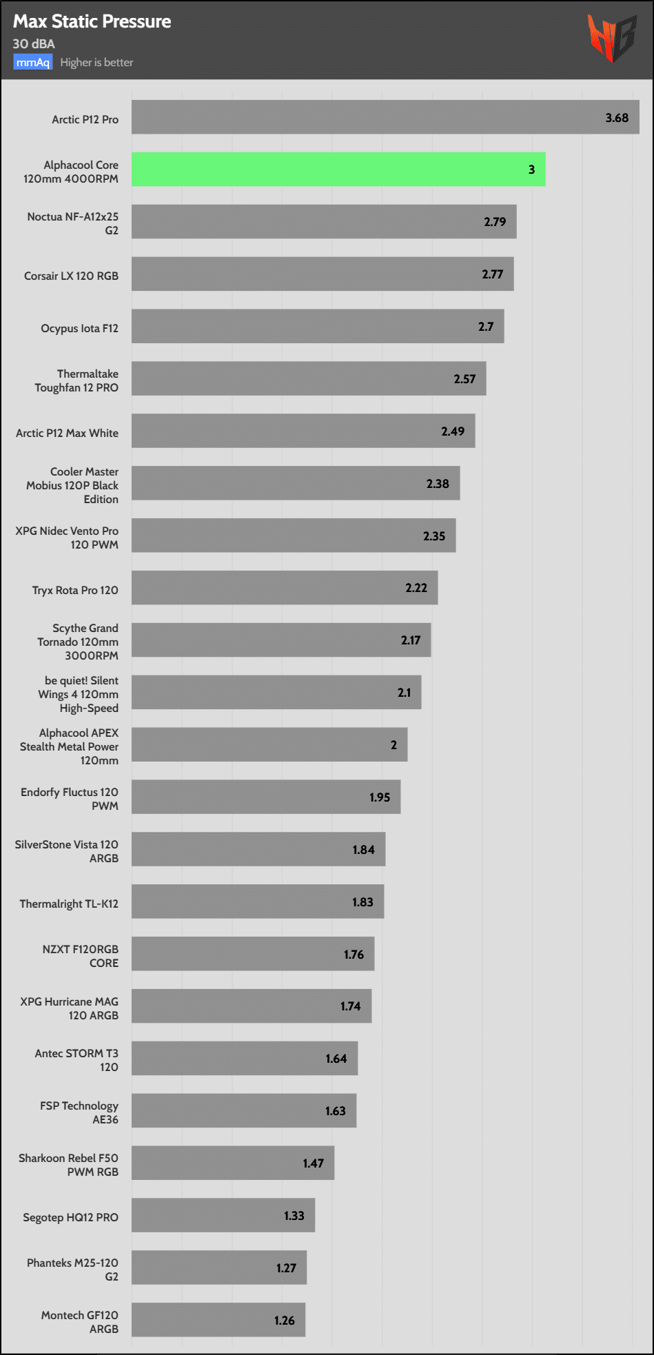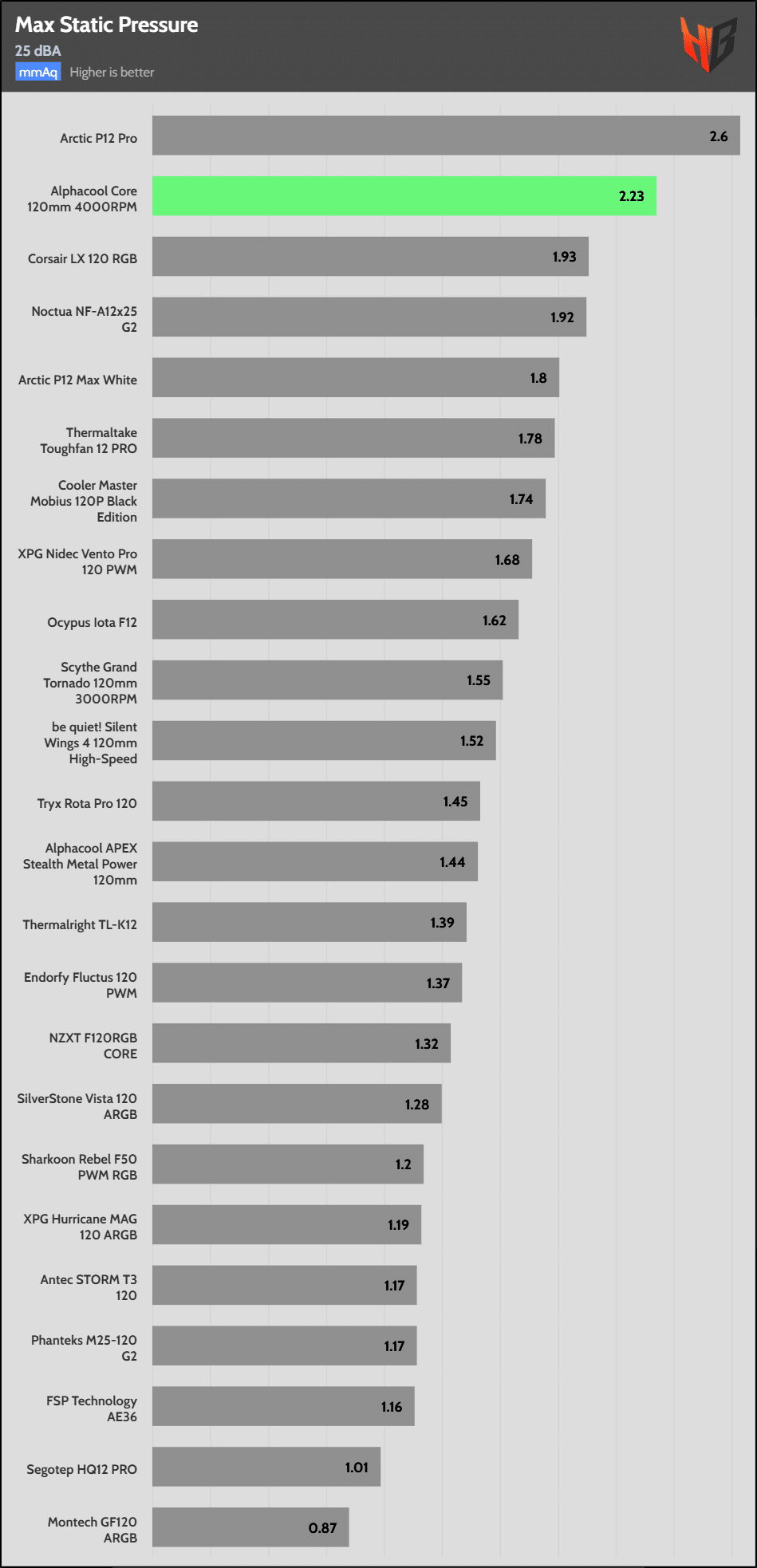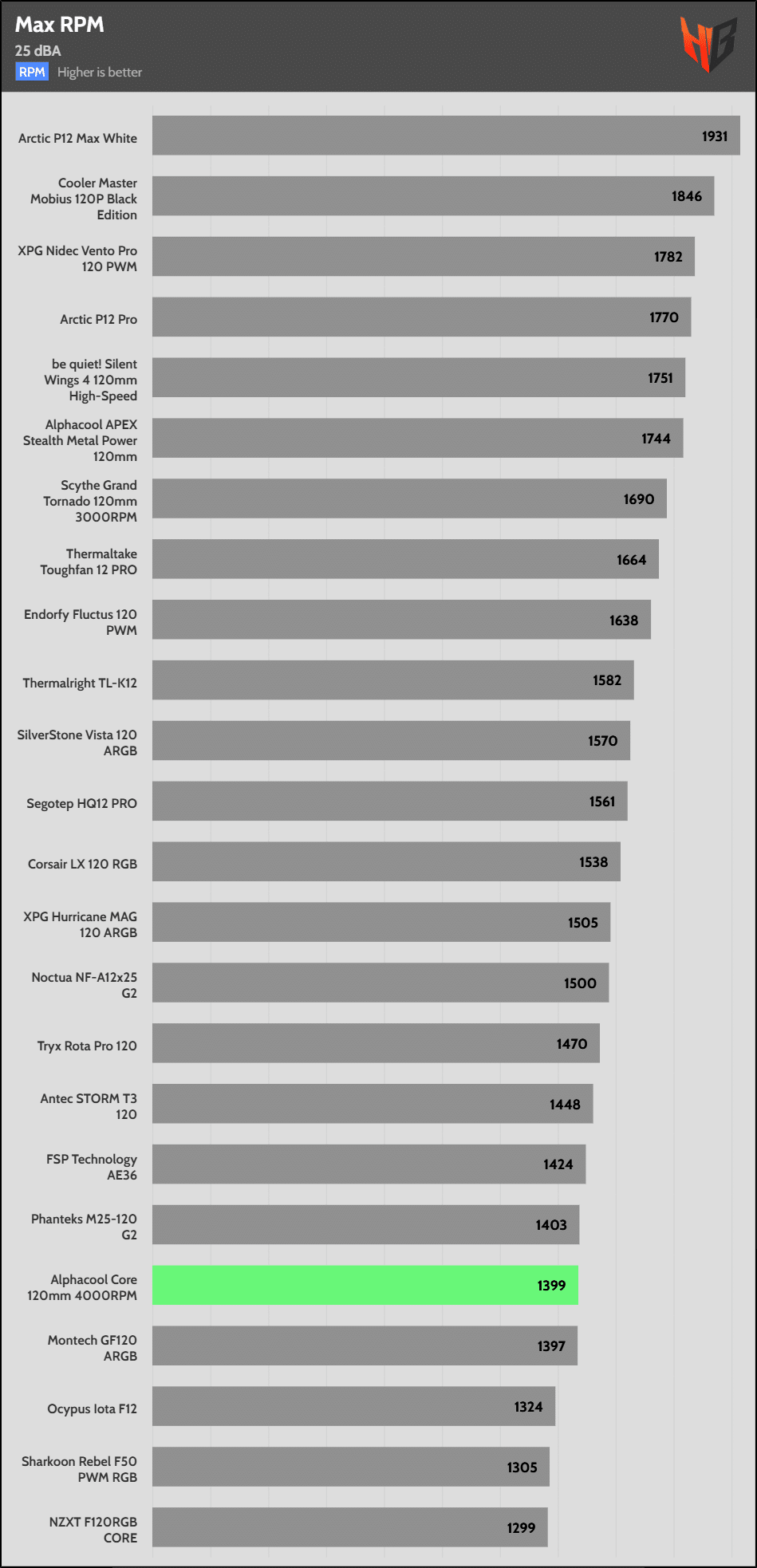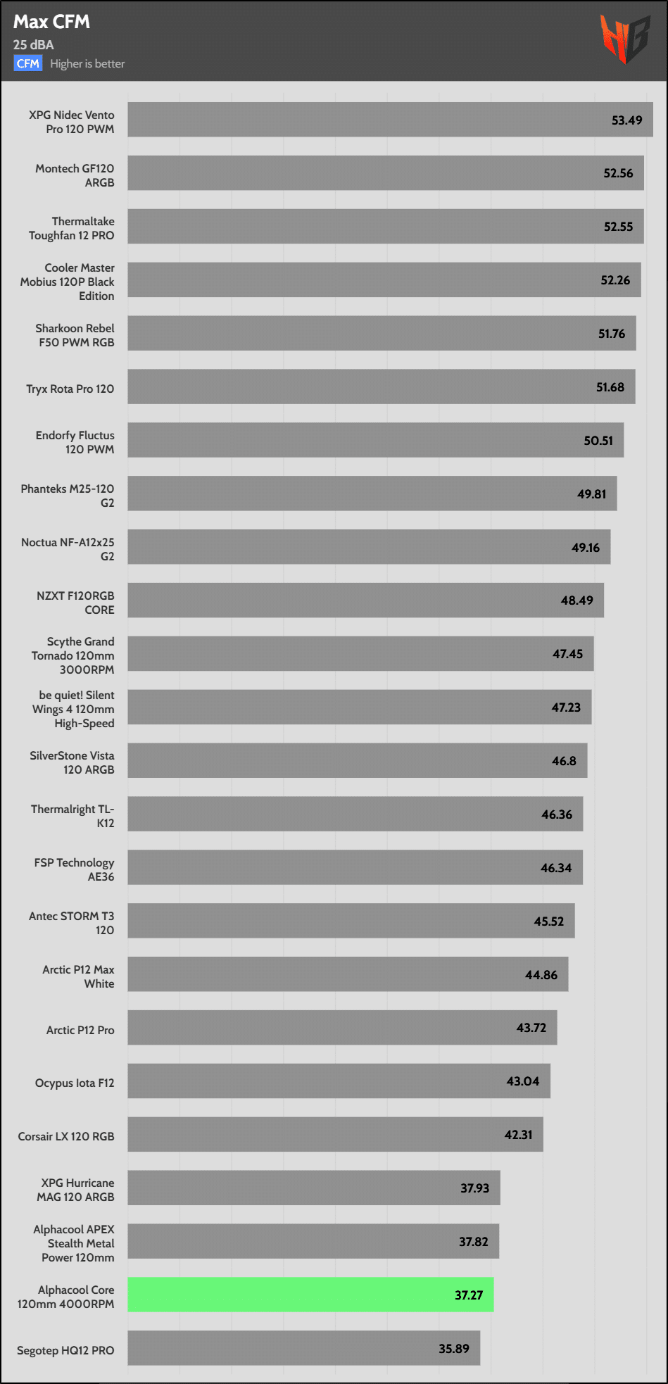 And again, the Alphacool Core 4000RPM 120mm is not only 3 times cheaper than the Noctua NF-A12x25 G2 but also better as a radiator fan.