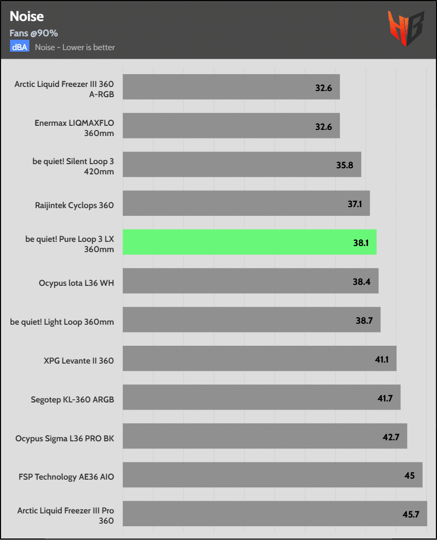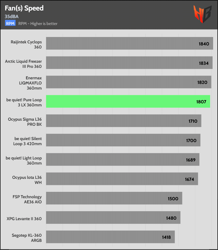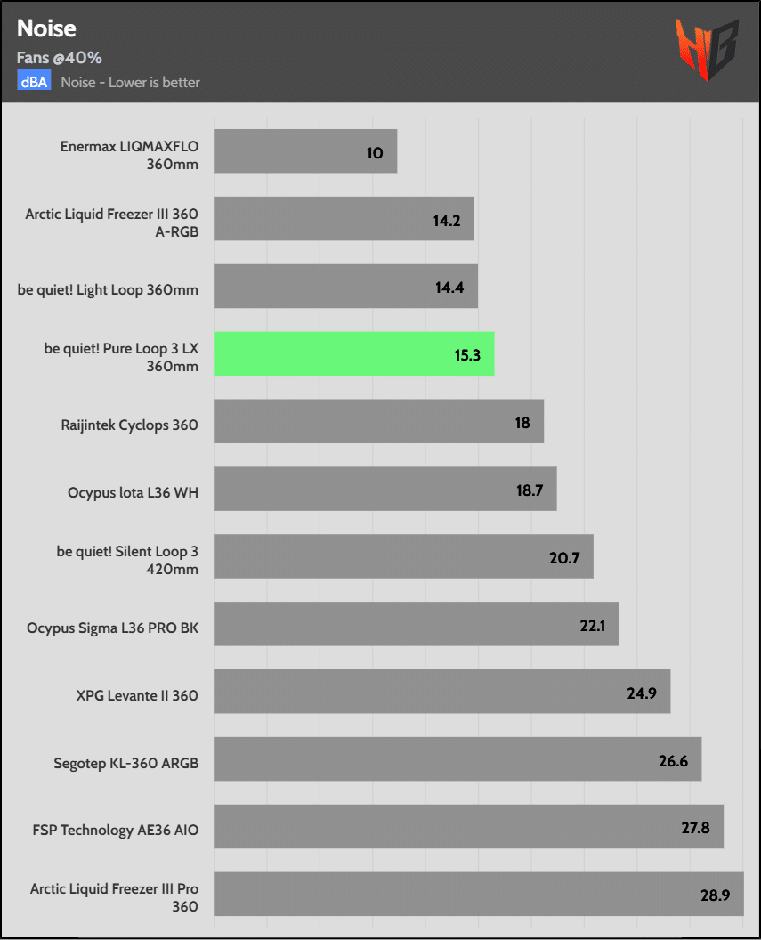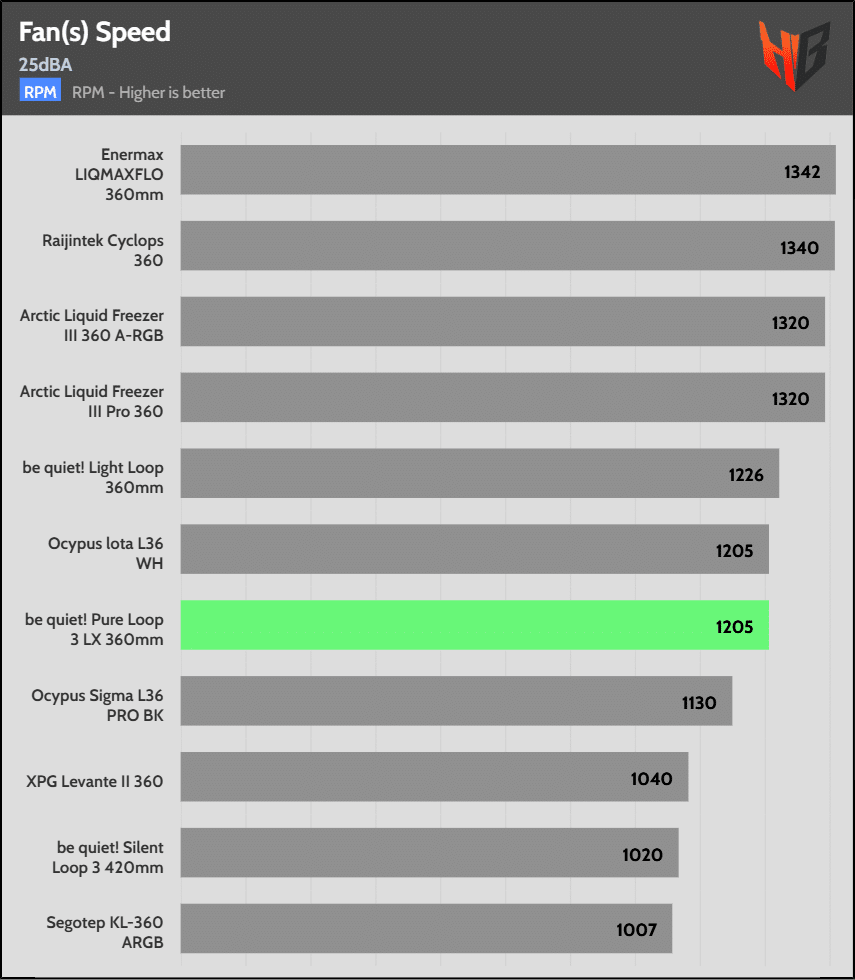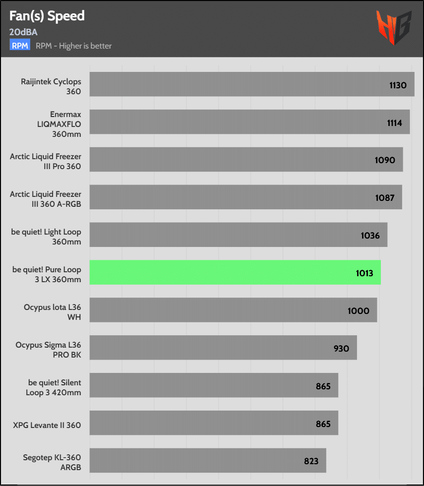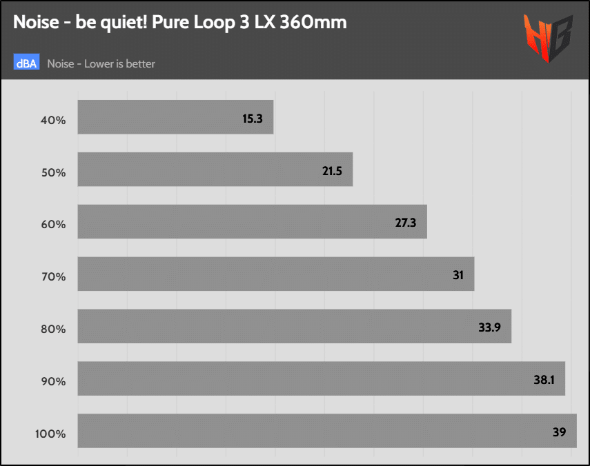Cooling be quiet! Pure Loop 3 LX 360mm AIO Review October 13, 2025October 13, 2025 crmaris Output Noise & Fan(s) Speed Noise Level @ 40%-100% of Max Speed Noise_40PercentNoise_50PercentNoise_60PercentNoise_70PercentNoise_80PercentNoise_90PercentNoise_100Percent PWM Level @ Noise & RPM Fan_Percentage_NoiseFan_Percentage_RPM Noise Level @ Fan Speed RPM_15dBARPM_20dBARPM_25dBARPM_30dBARPM_35dBARPM_Full_Speed The higher the RPM in these charts, the better. Pages: Prologue & Technical specifications Box, Contents & Bundle Installation Test Methodology Noise Output Frequency Plots & Noise Recordings Noise Normalized Testing Overall Performance – AMD Epilogue Pages: 1 2 3 4 5 6 7 8 9 Pages ( 5 of 9 ): « Previous1234 5 6789Next » Related Posts Cooling Ocypus Sigma L36 Pro Review – The IPS Display is ALL the Money! October 3, 2025October 3, 2025 crmaris Cooling Noctua NF-P14s redux-1200 PWM 140mm Fan Review August 10, 2025August 10, 2025 crmaris