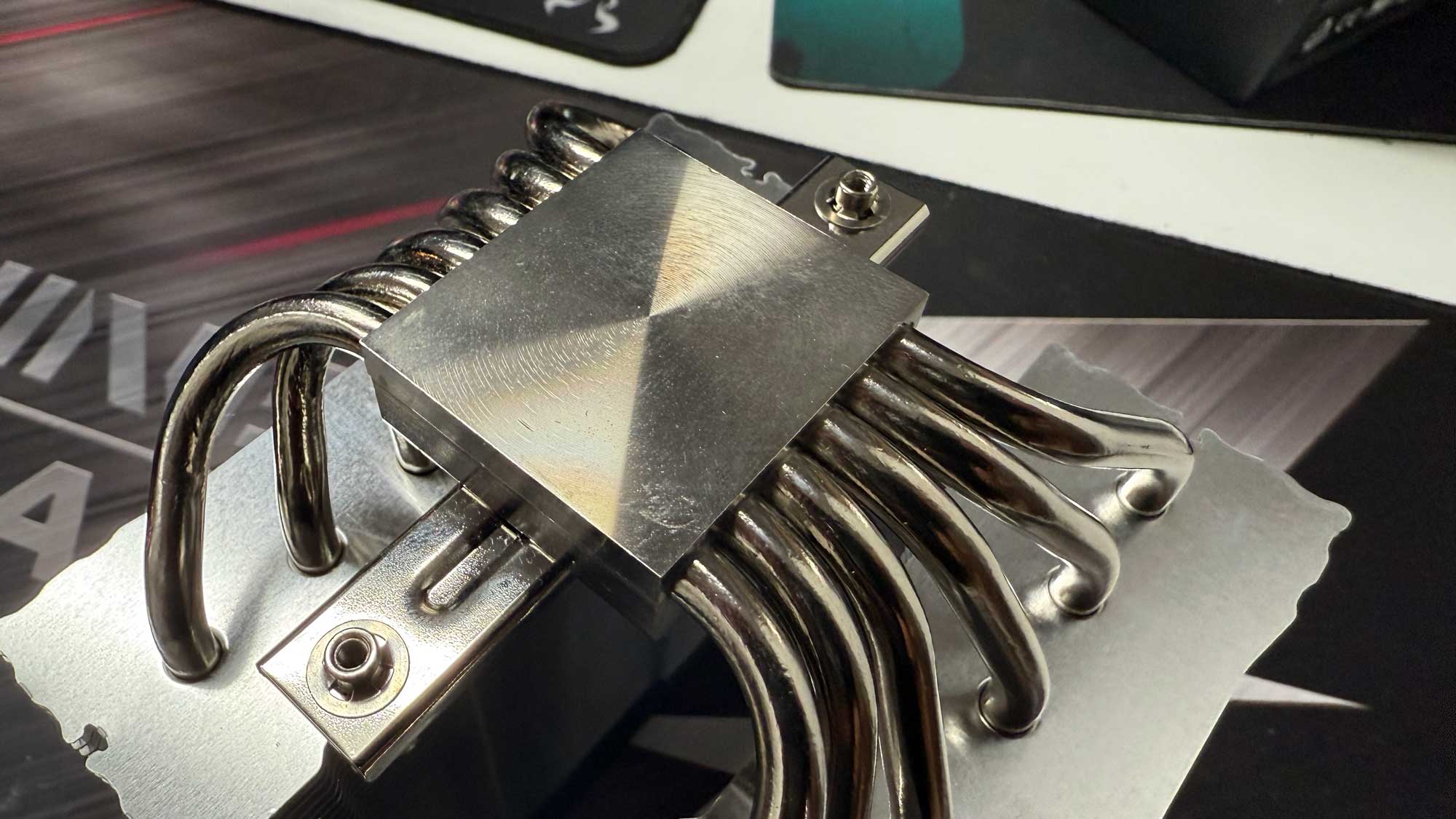 The cooler has a convex base for better contact with the CPU’s heatspreader. This will work well with Intel CPUs, which have slightly concave IHS, but not with AMD AM5 CPUs, which also have a slightly convex IHS and a very strong heat spreader that does not flex.