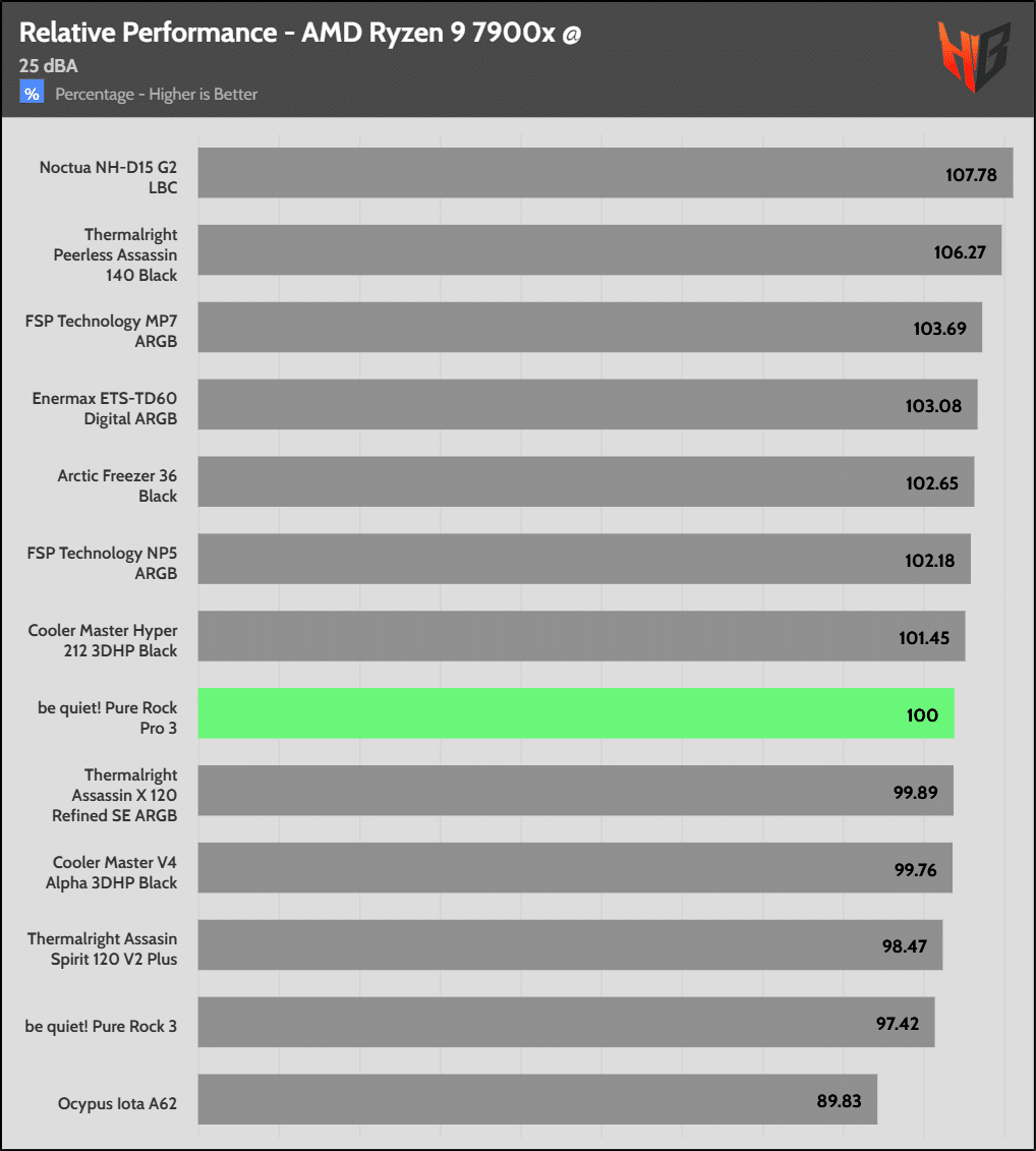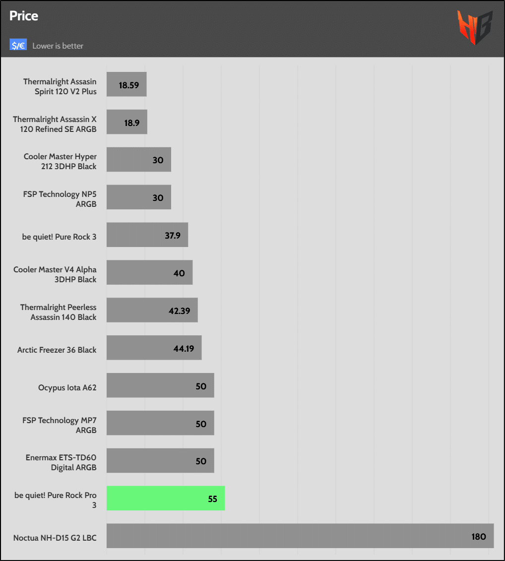 At a 25 dBA normalized noise output, a level that won’t bother most users while still allowing for good performance, the Pure Rock Pro 3 has only a 2.6% difference with the “plain” Pure Rock 3, which costs way less. The single-tower Arctic Freezer 36 also achieves better performance, while costing $11 less, a notable price difference. The competition is fierce in general, and the fact that a single-tower cooler offers increased compatibility with RAM and mainboard VRMs can seal the deal for many users.
