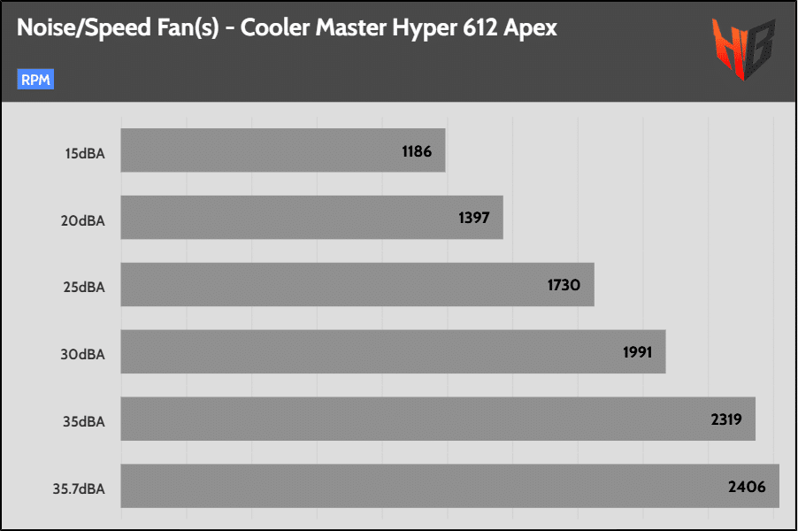 For these tests, I set the cooler’s fan(s) to speeds with noise output at the following predefined levels: 20/25/30/35/40 dBA. I skip the corresponding tests if the cooler’s fan(s) cannot reach some noise levels. Finally, I include a test where the cooler’s fan(s) spins at full speed.