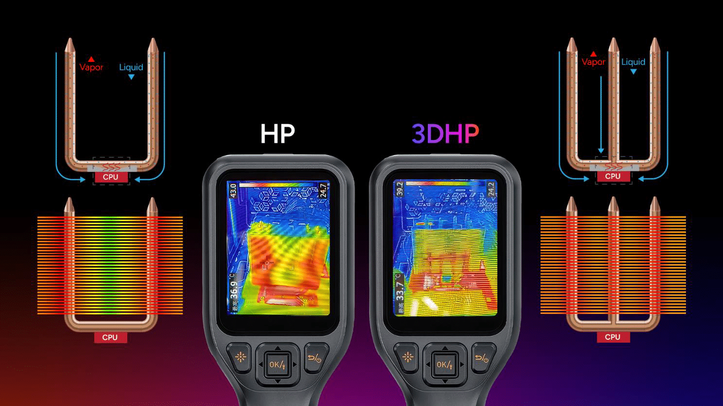 3DHP adds extra heat pipe ends and T-joints to pull heat from areas a standard U-pipe misses and to speed liquid return. By expanding pickup and return paths, it boosts effective heat transfer. In controlled tests, a 2-pipe 3DHP layout can meet the temperature targets of typical 4-pipe coolers.