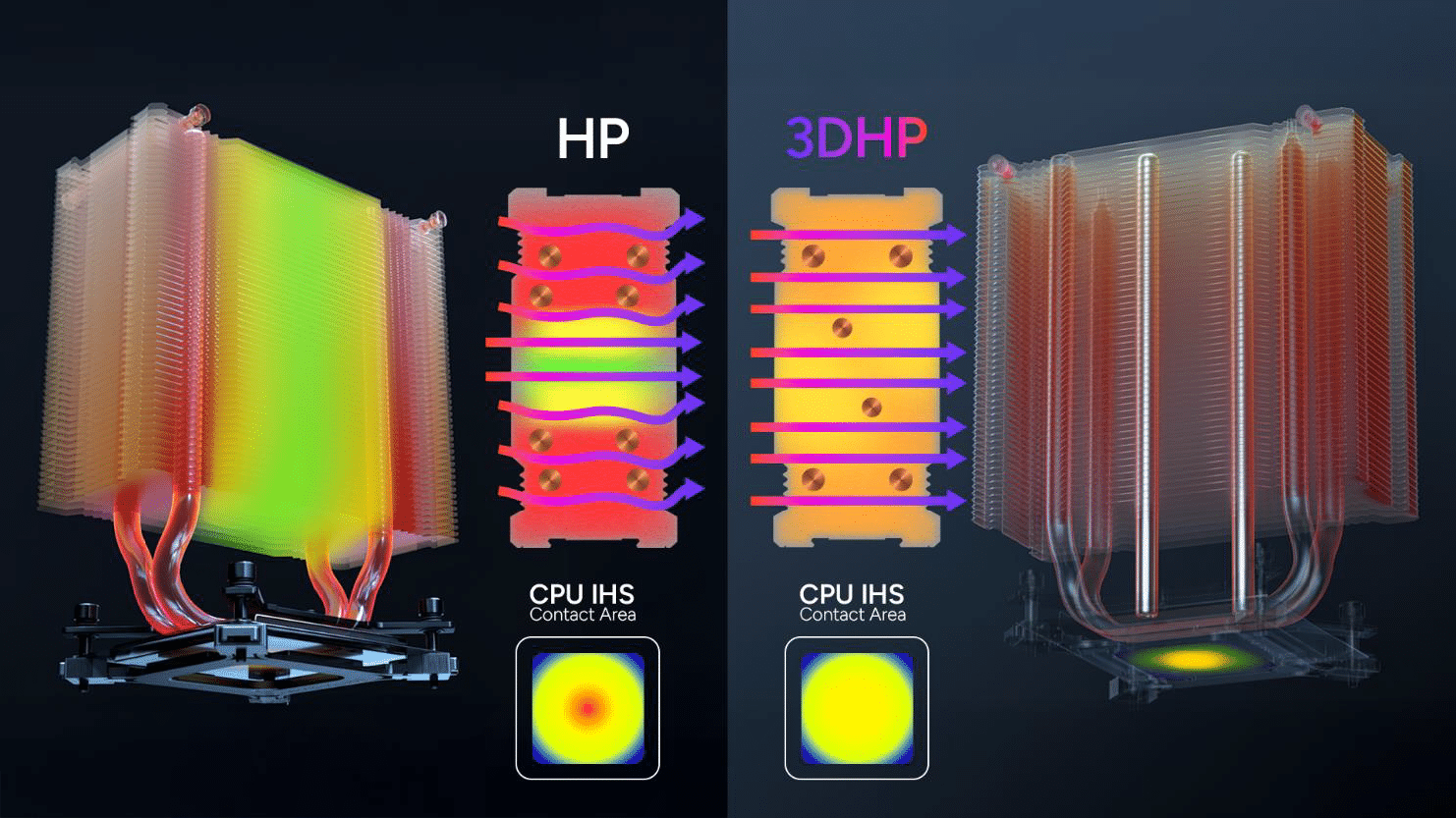 Cybenetics Coolers DatabaseAccording to Cooler Master, 3DHP keeps the heat-pipe approach and focuses on efficiency inside each pipe, instead of adding more pipes, 3DHP asks each pipe to do its job better. 3DHP lowers measured thermal resistance versus a conventional pipe of the same diameter. In practical terms, coolers using 3DHP can hit the same temperature targets as “plain” coolers but with fewer heat pipes.