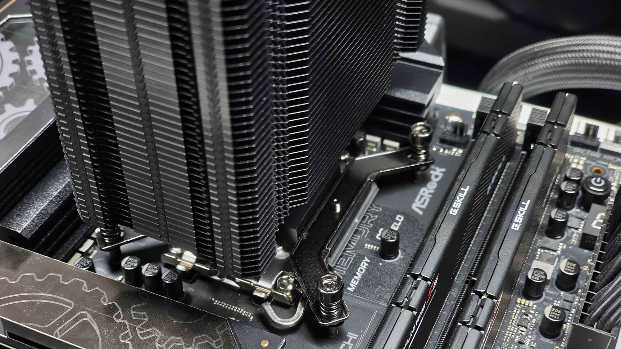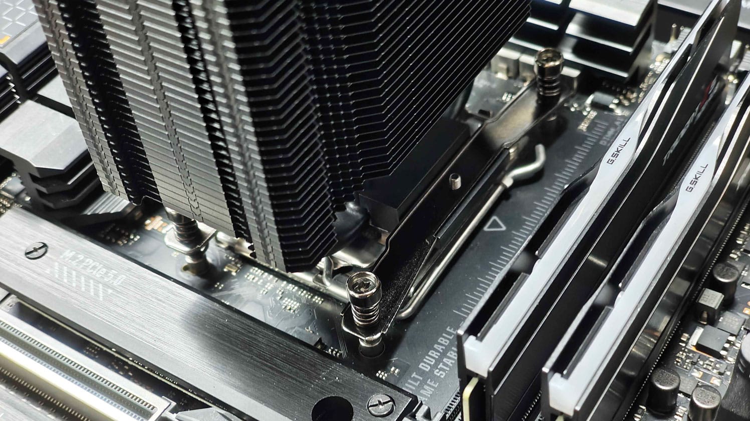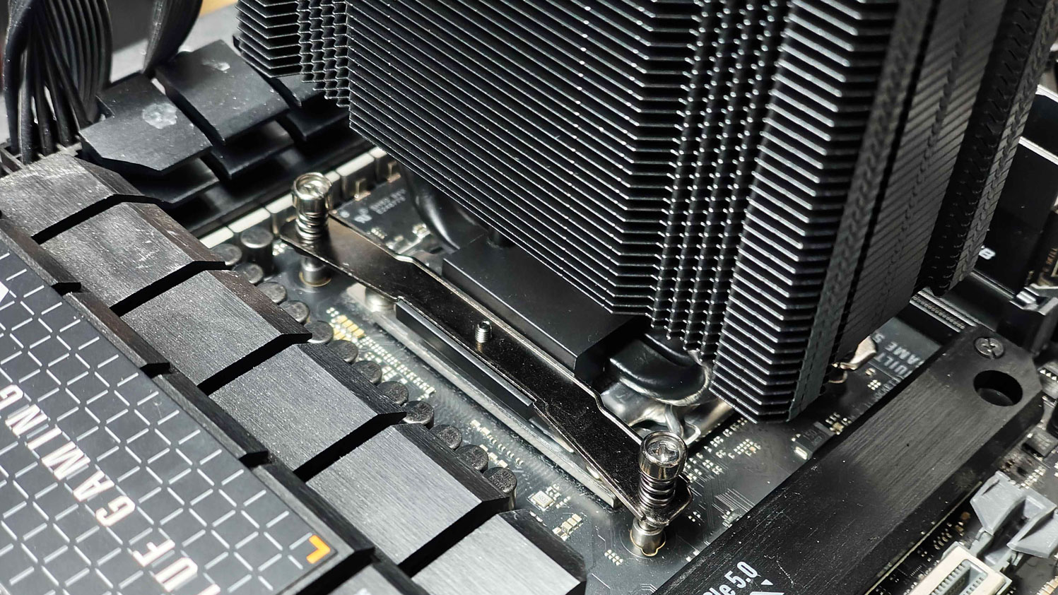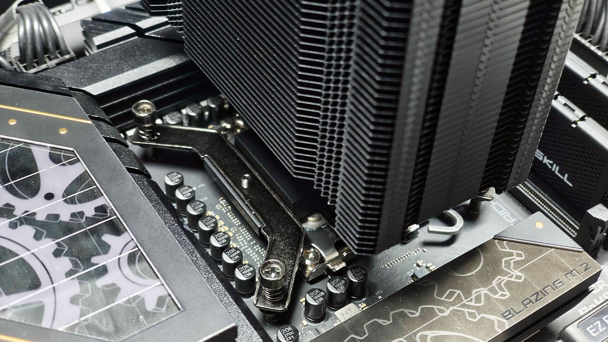 The process for the Intel system is always a bit more cumbersome, as you need to align the backplate while securing the heatsink. The good alignment of the thumbscrews with the backplate helped with the installation. However, other coolers that secure the brackets on the backplate and then the cooler to the brackets, make the installation on Intel even better. On the other hand, the design found here removes the load from the screws that mount the cooler to the brackets, as the arms sit above the cooler’s base and push it down on the CPU.
