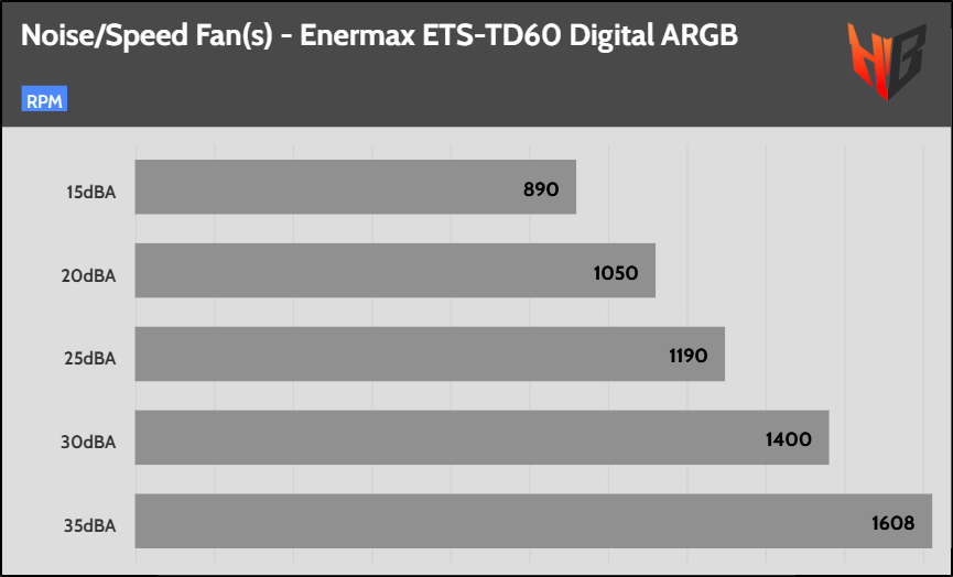 For these tests, I set the cooler’s fan(s) to speeds with noise output at the following predefined levels: 20/25/30/35/40 dBA. I skip the corresponding tests if the cooler’s fan(s) cannot reach some noise levels. Finally, I include a test where the cooler’s fan(s) spin at full speed.