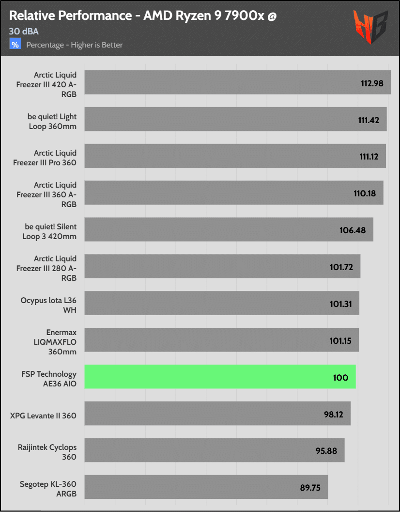 The cooler comes pre-assembled with the fans on the radiator daisy-chained together, relieving users of a significant installation step. If you plan to use it on an AMD platform, you won’t be thrilled by its performance, as you can see in the chart above. That said, given that you can find the AE36 as low as 65 euros in the EU market, it is a bargain, as this amount typically gets you a good, affordable air-cooler, rather than an RGB-lit 360mm AIO. If you are after a quiet AIO, you should think twice before buying it, as its lowest noise output, with fans spinning at 40%, is 27.8 dBA. This AIO is one of the few that cannot achieve 20 dBA normalized noise output. The reason is that its fans operate at a minimum speed of 1088 RPM. When three of these fans work together to push air through the AIO’s radiator, the noise output increases. In general, I would like to see higher quality and a wider RPM range of fans on this AIO.