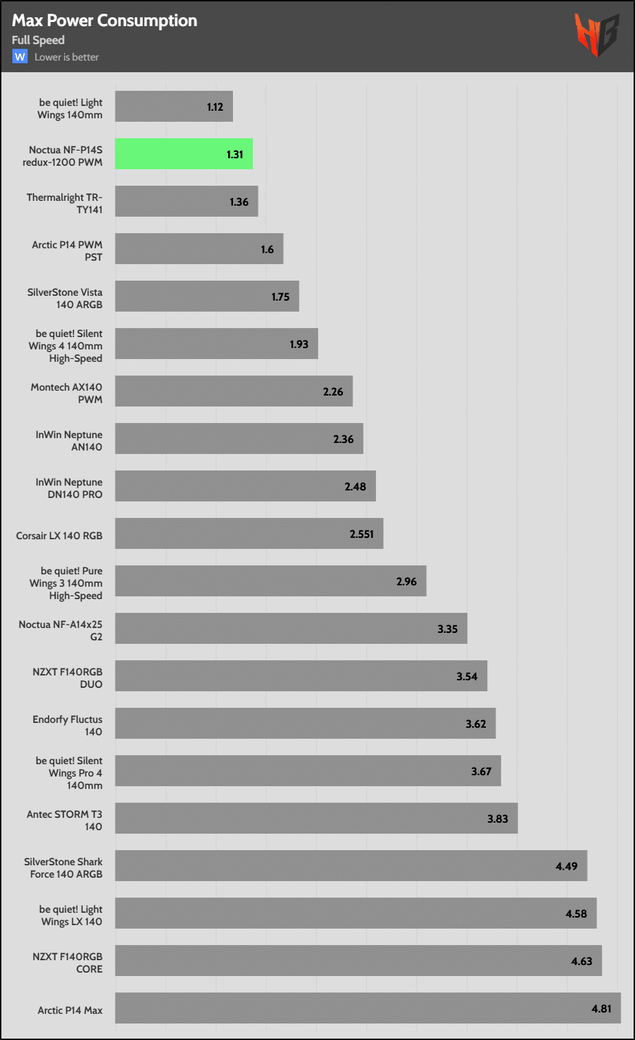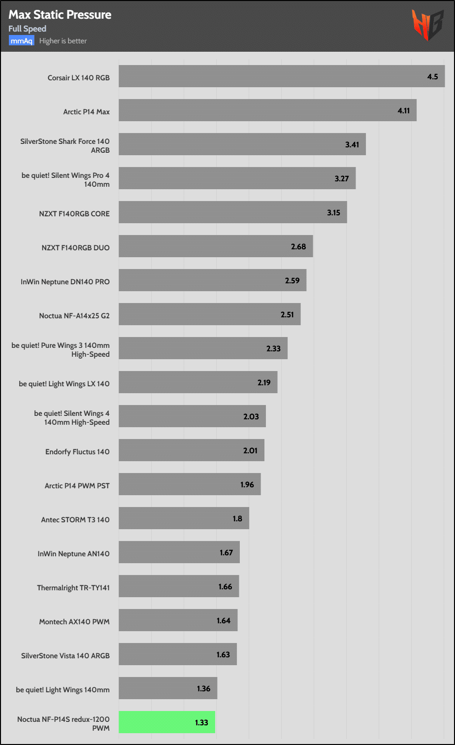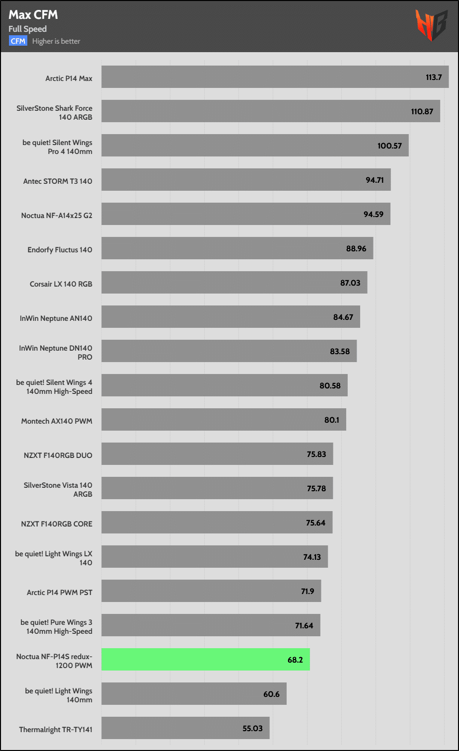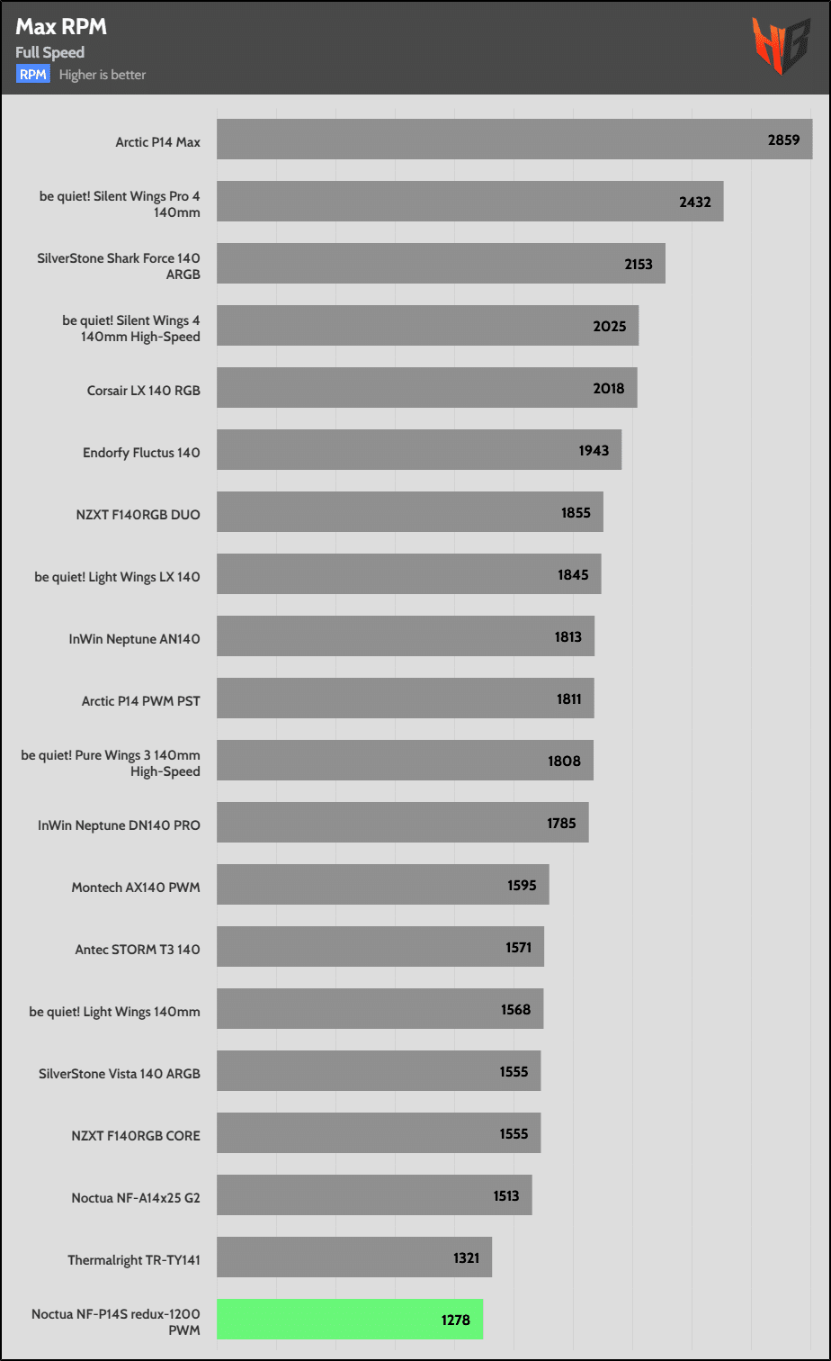 Since most fan control ICs don’t apply precisely the percentage of RPM speed that you want (e.g., 50% PWM for a 2000 RPM fan should be 1000 RPM), I used to find the fan’s maximum speed and then dial directly the fan speeds that corresponded to 10%, 20%, and so on of its maximum rated speed. I decided to stop doing that. So from now on, in all of my fan evaluations, I will dial the corresponding PWM value in 10% steps to also check how accurate its fan controller is, and for my noise results to align with the airflow and static pressure results from the Longwin apparatus, where I don’t use RPM but PWM control for all testing.