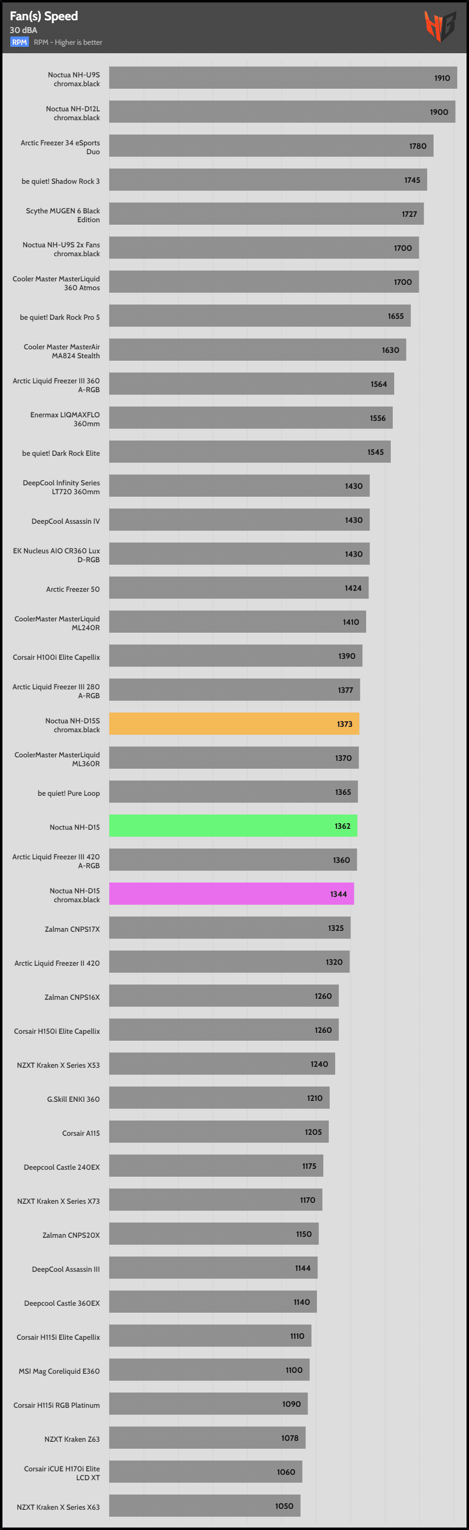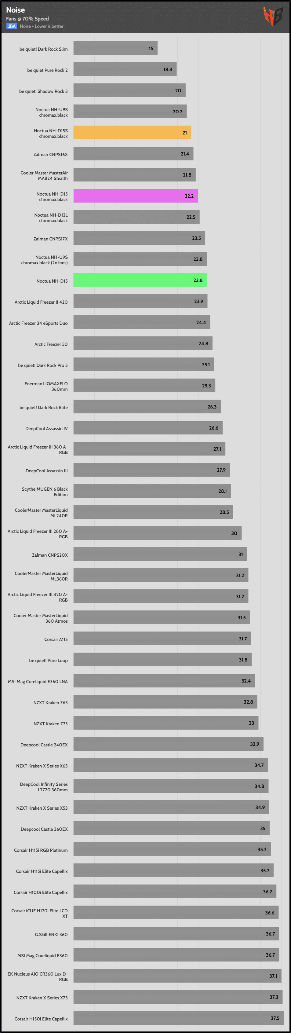 Noise output is low. The RPMs in the D15 chromax.black are slightly lower, hence its lower noise output.