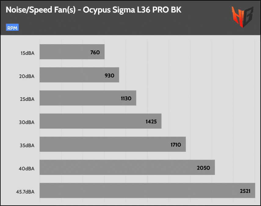For these tests, I set the cooler’s fan(s) to speeds with noise output at the following predefined levels: 20/25/30/35/40 dBA. I skip the corresponding tests if the cooler’s fan(s) cannot reach some noise levels. Finally, I include a test where the cooler’s fan(s) spins at full speed.