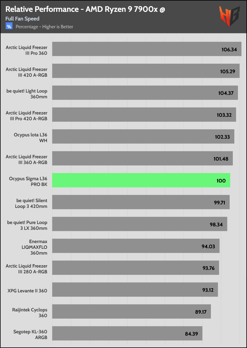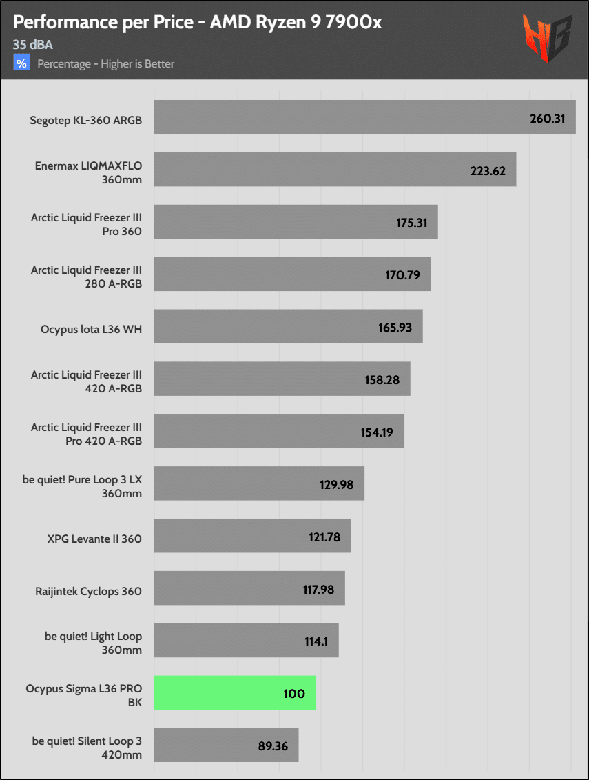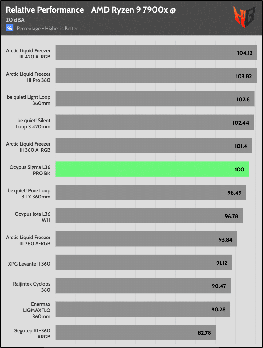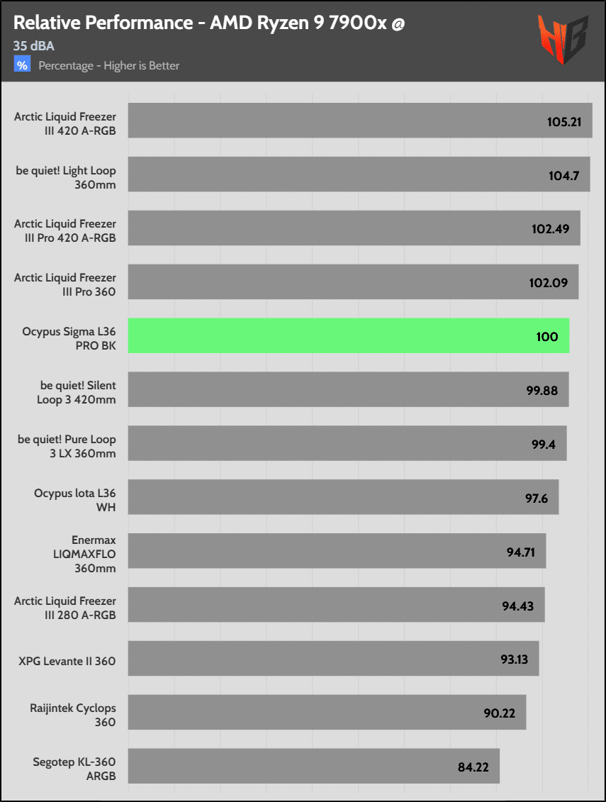 Not highly competitive results in the AMD platform. From 360mm AIOs, the be quiet! The Light Loop 360mm is currently the best in my charts, reaching up to 35 dBA. At full speed, regardless of noise output, the Arctic Liquid Freezer III Pro 360 leads the pack.
