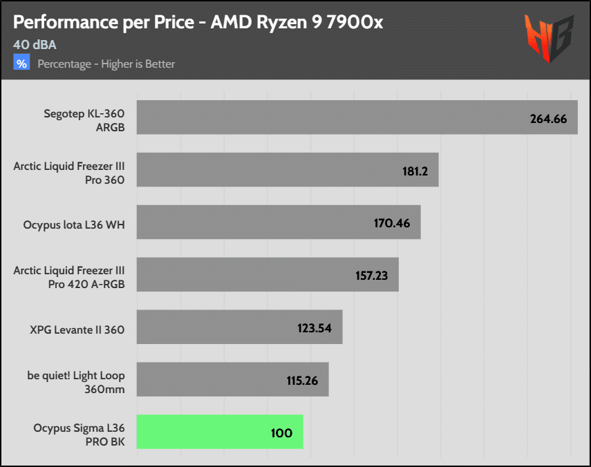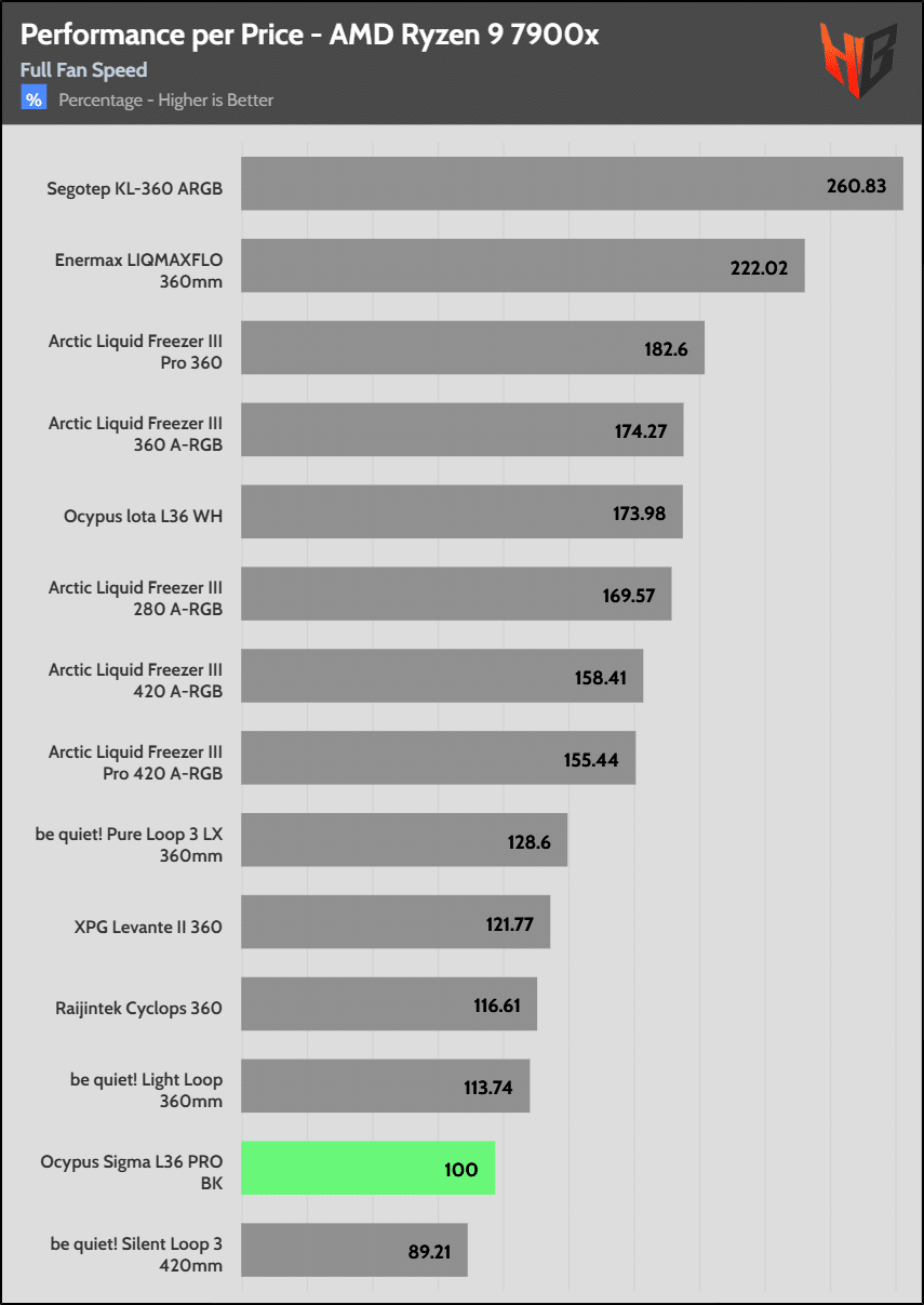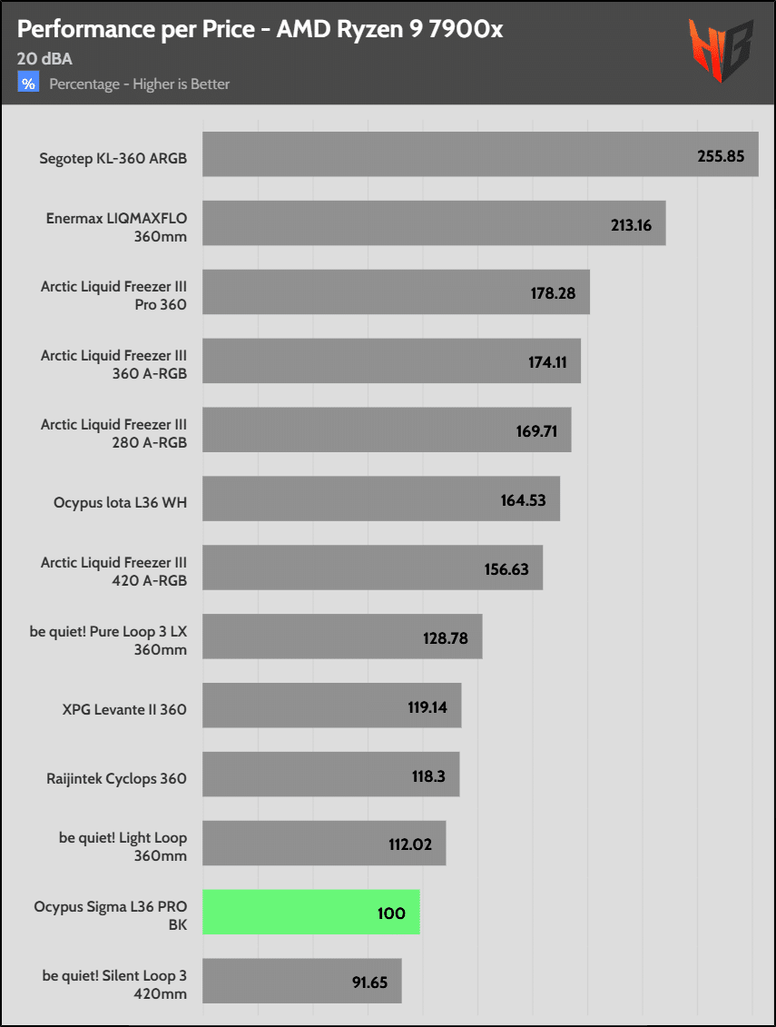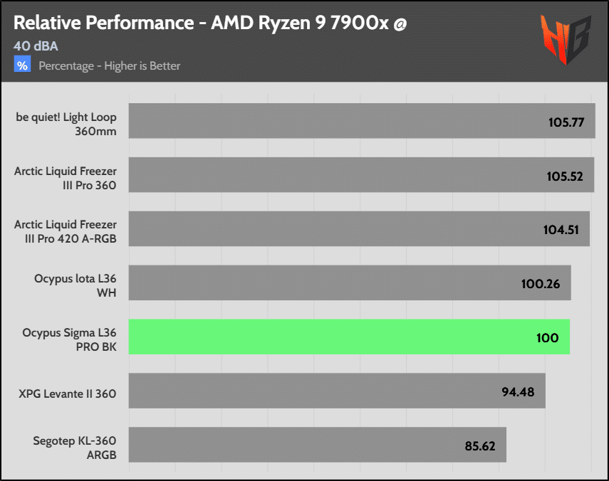Not highly competitive results in the AMD platform. From 360mm AIOs, the be quiet! The Light Loop 360mm is currently the best in my charts, reaching up to 35 dBA. At full speed, regardless of noise output, the Arctic Liquid Freezer III Pro 360 leads the pack.