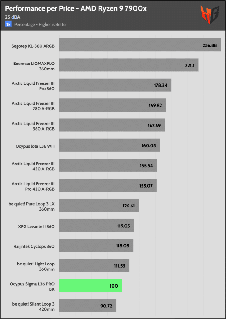 The Ocypus Sigma L36 Pro has an impressive display on top of its block, which, however, boosts the price to $170. Combined with the not highly competitive performance, the performance-to-price ratio drops low, especially when compared to solutions by Arctic with highly affordable price tags.