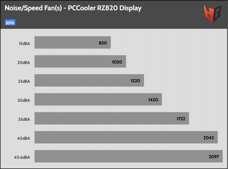 For these tests, I set the cooler’s fan(s) to speeds with noise output at the following predefined levels: 20/25/30/35/40 dBA. I skip the corresponding tests if the cooler’s fan(s) cannot reach some noise levels. Finally, I include a test where the cooler’s fan(s) spin at full speed.