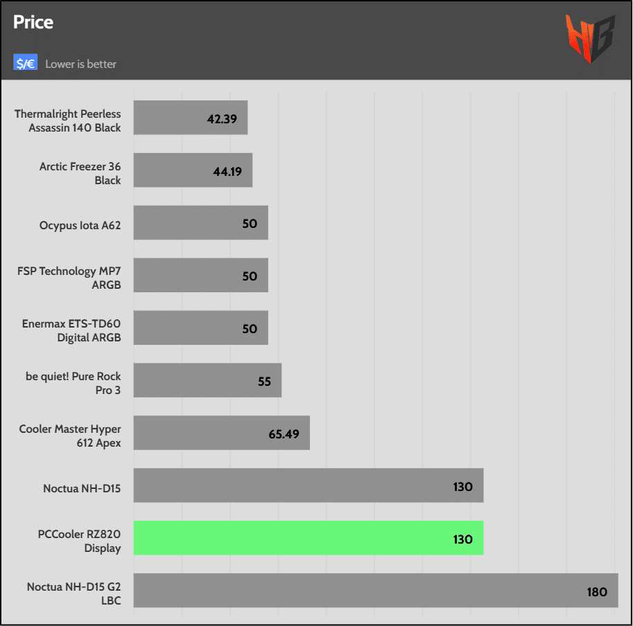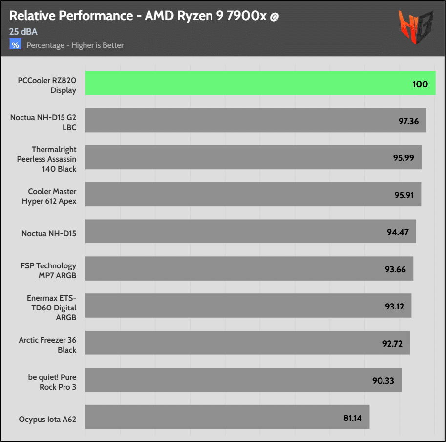 At a 25 dBA normalized noise output, a level that won’t bother most users while still allowing for good performance, the RZ820 display easily beats the Noctua NH-D15 G2, proving that there is a new air cooler king! I just hope they offer it at a fair price.