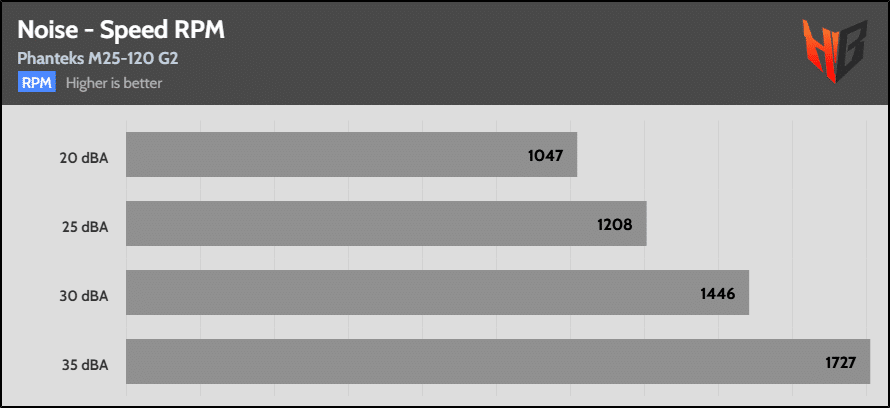 For these tests, I set the fan to speeds with noise output at the following predefined levels: 20, 25, 30, 35, 40, and 45 dBA. I skip the corresponding tests if the fan under the test cannot reach some noise levels. The speeds shown in the graph below are measured with the fan in a clear space inside my hemi-anechoic chamber without any obstacles. I set these speeds on the Longwin machine, but they change slightly due to the variable conditions that the device applies.