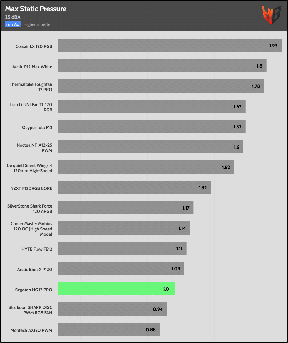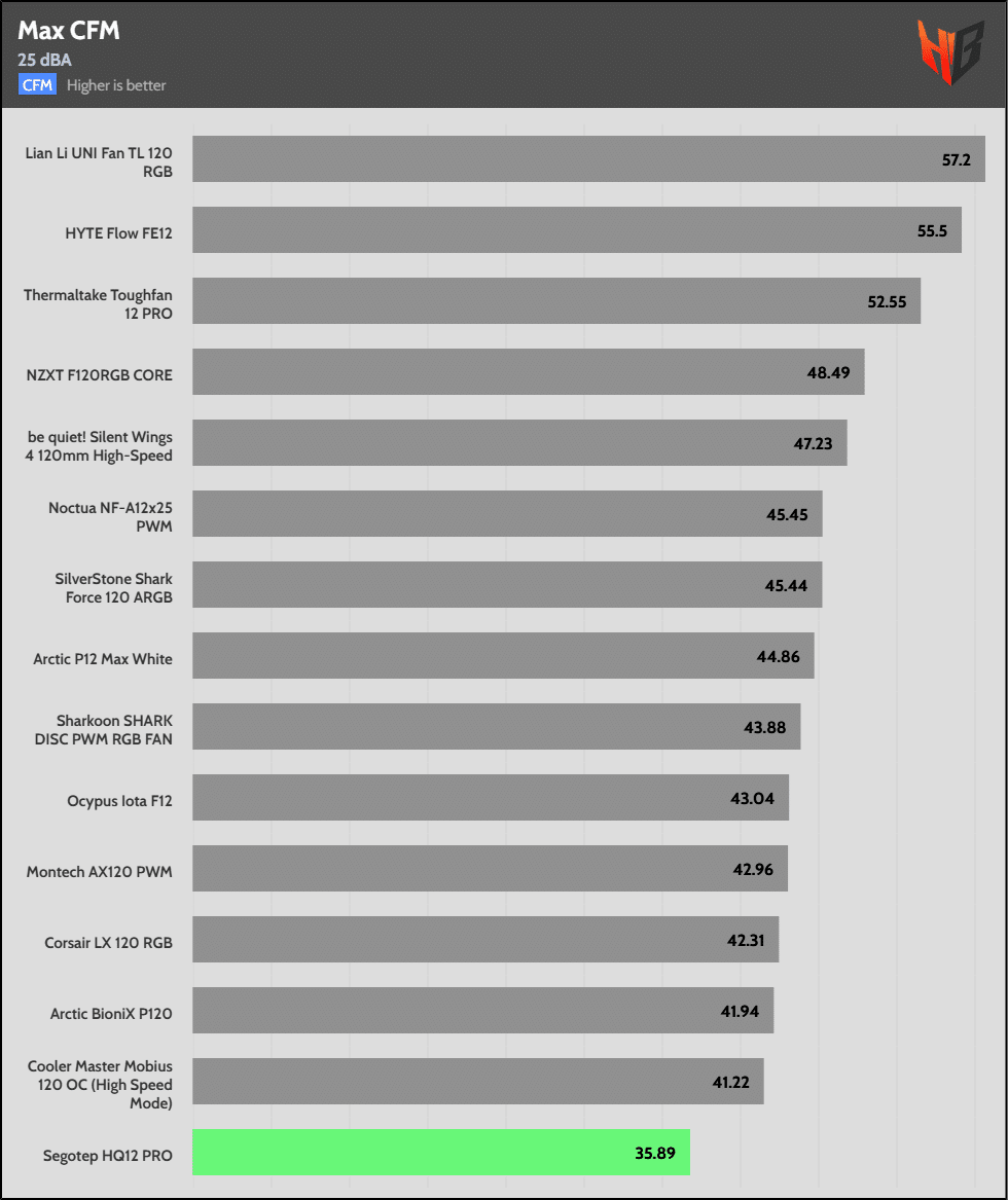 At 25 dBA, the fan’s airflow is low, notably lower than the other fans I used for comparison purposes. It performs a little better in static pressure, but still, it is on the last entries of the respective graph.