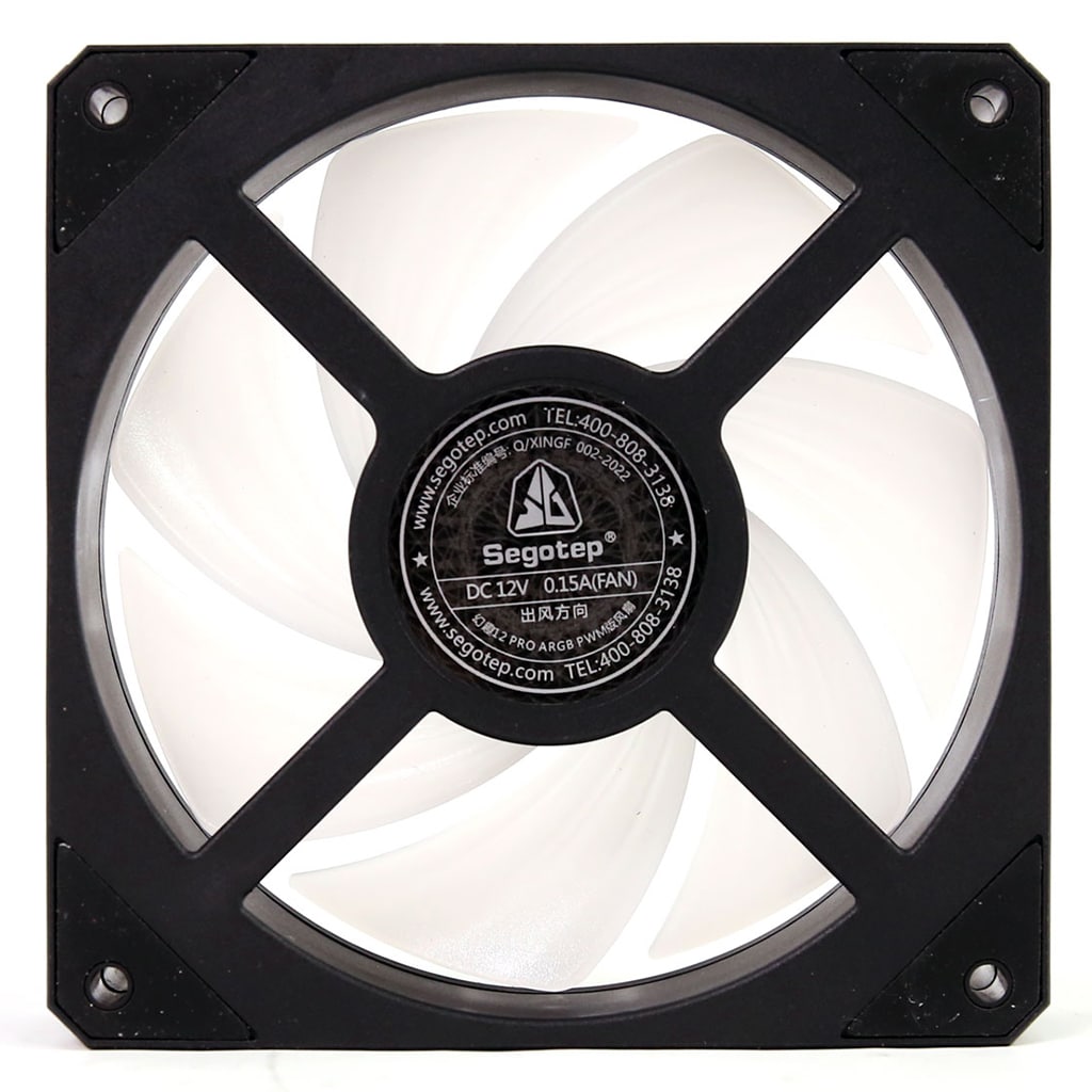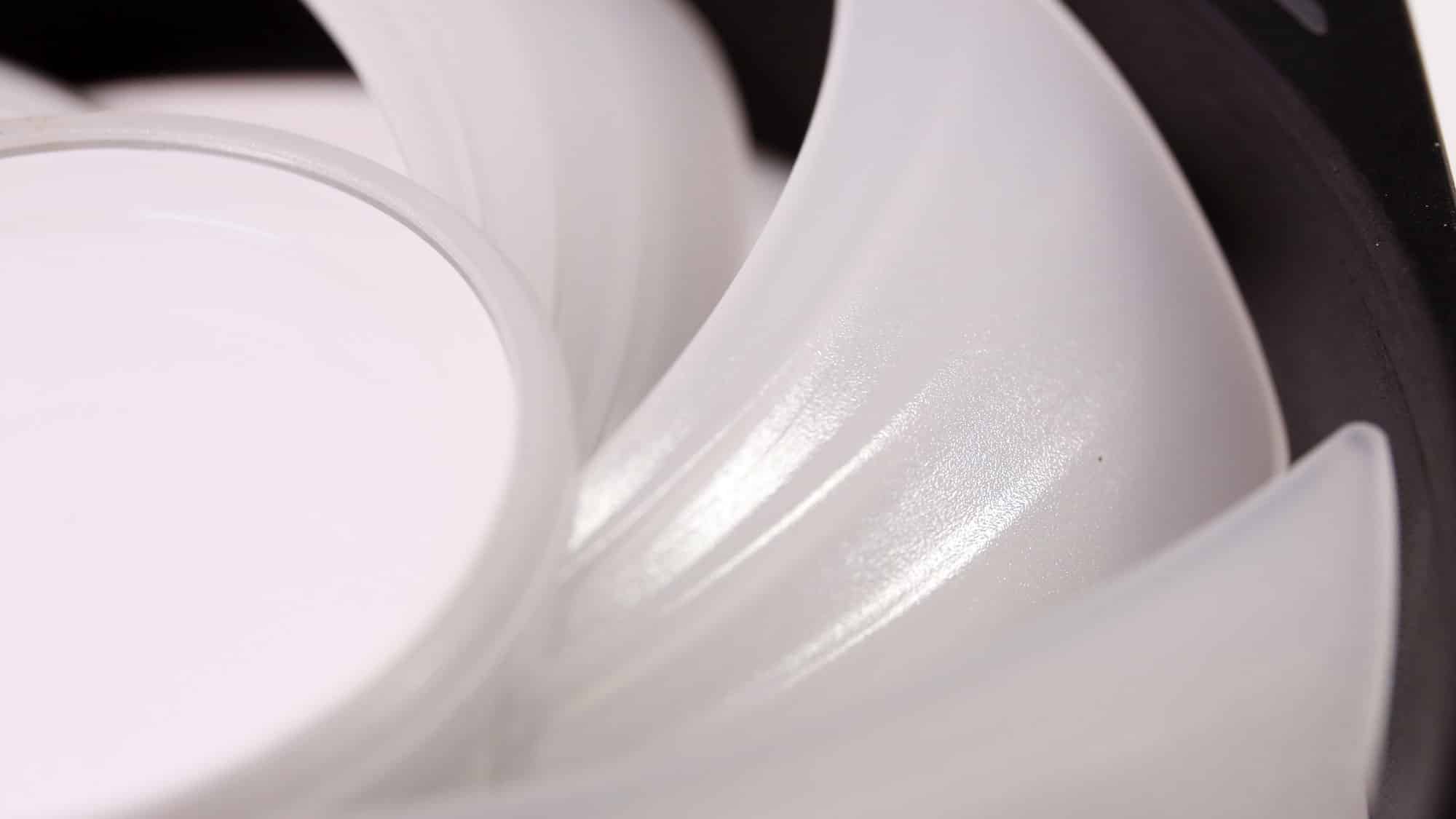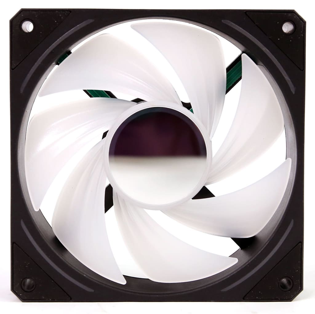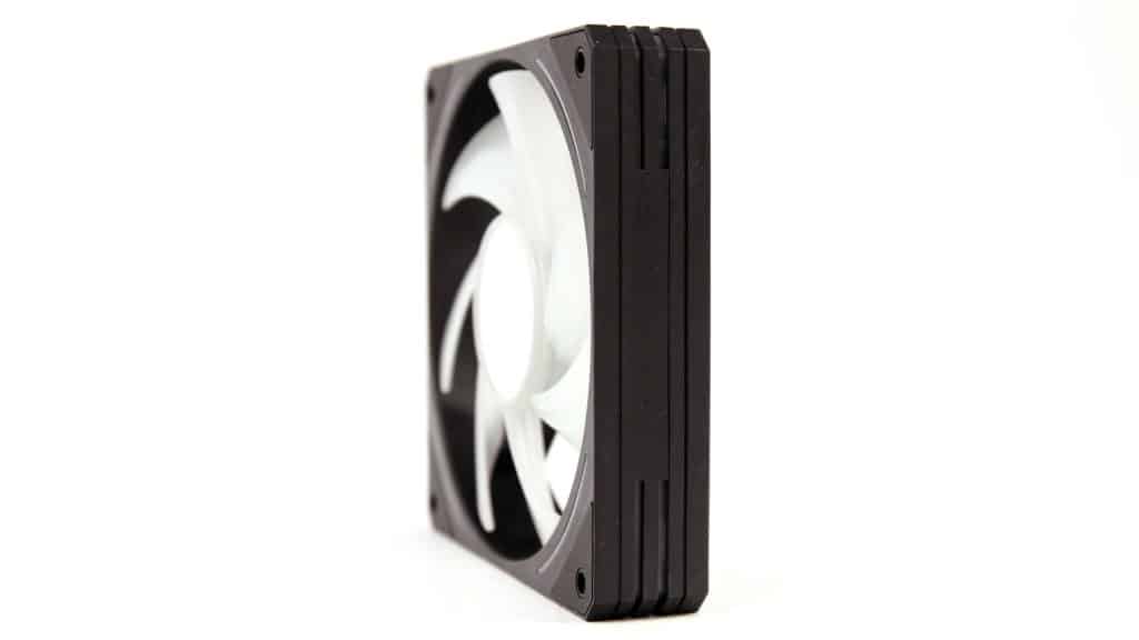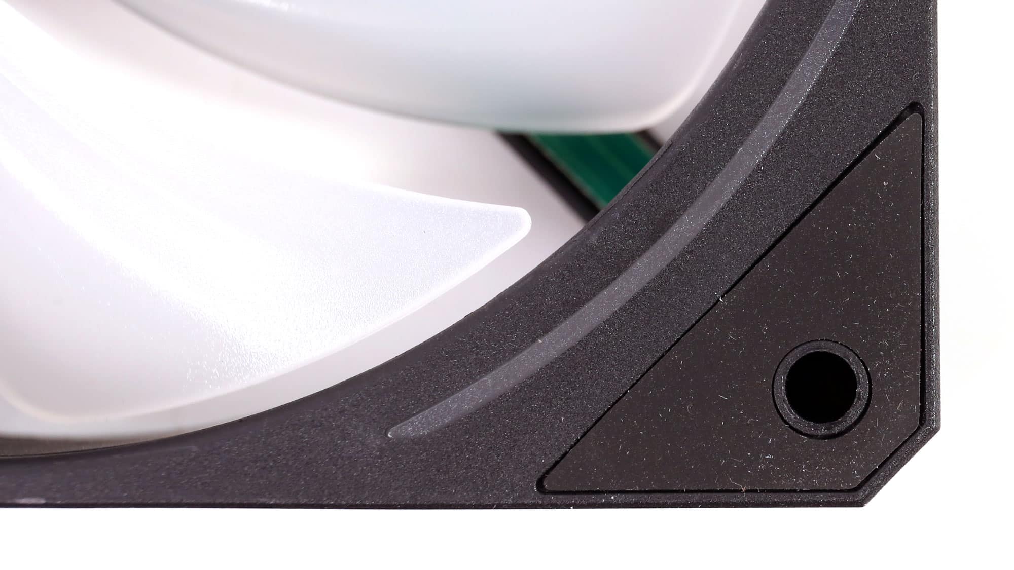 The fan has seven blades to push the air, and its build quality is good. Its fluid dynamic bearing offers lower noise output than double-ball bearing ones, and it is also reliable as long as you don’t push the fan at high temperatures (>40C). Twenty RGB lamp beads diffuse the light through the semi-translucent blades for a sublime lighting effect. There is also lighting on the four corners of the fan.