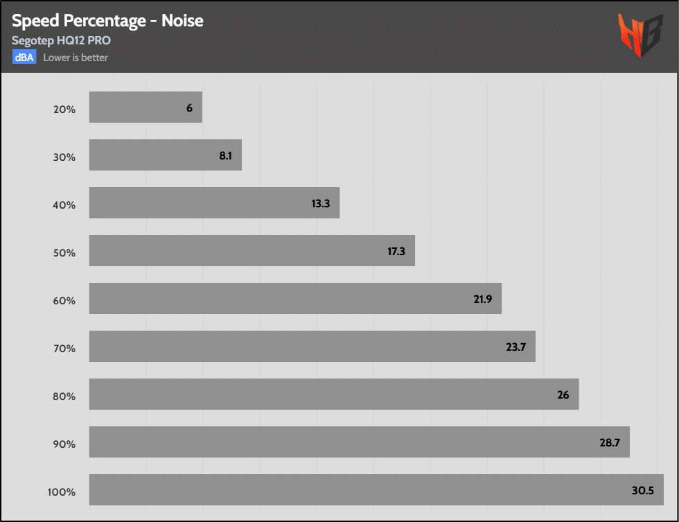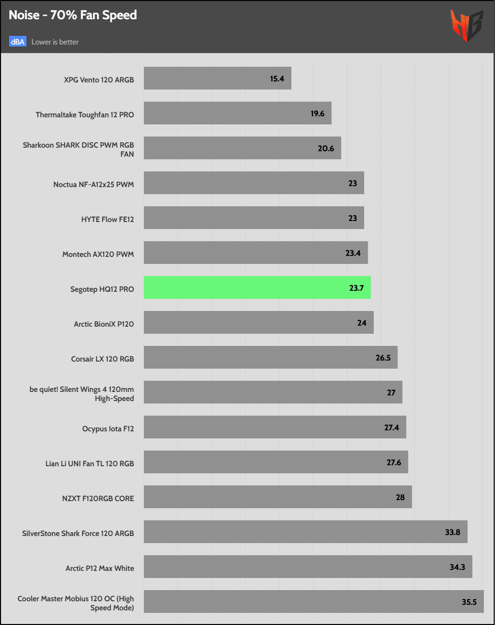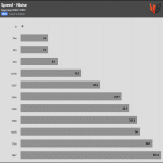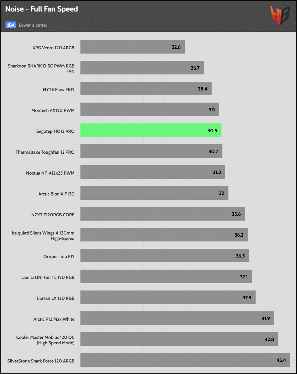 Despite its low maximum speed, the output noise is high compared to the rest of the fans included in the respective graphs.