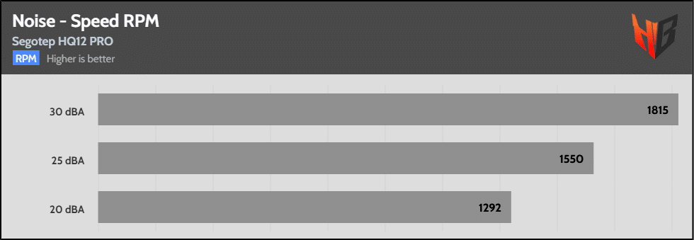 For these tests, I set the fan to speeds with noise output at the following predefined levels: 20/25/30/35/40/45 dBA. I skip the corresponding tests if the fan under the test cannot reach some noise levels. The speeds shown in the graph below are measured with the fan in a clear space inside my hemi-anechoic chamber without any obstacles. I set these speeds on the Longwin machine, but they slightly change because of the variable conditions that the device applies.