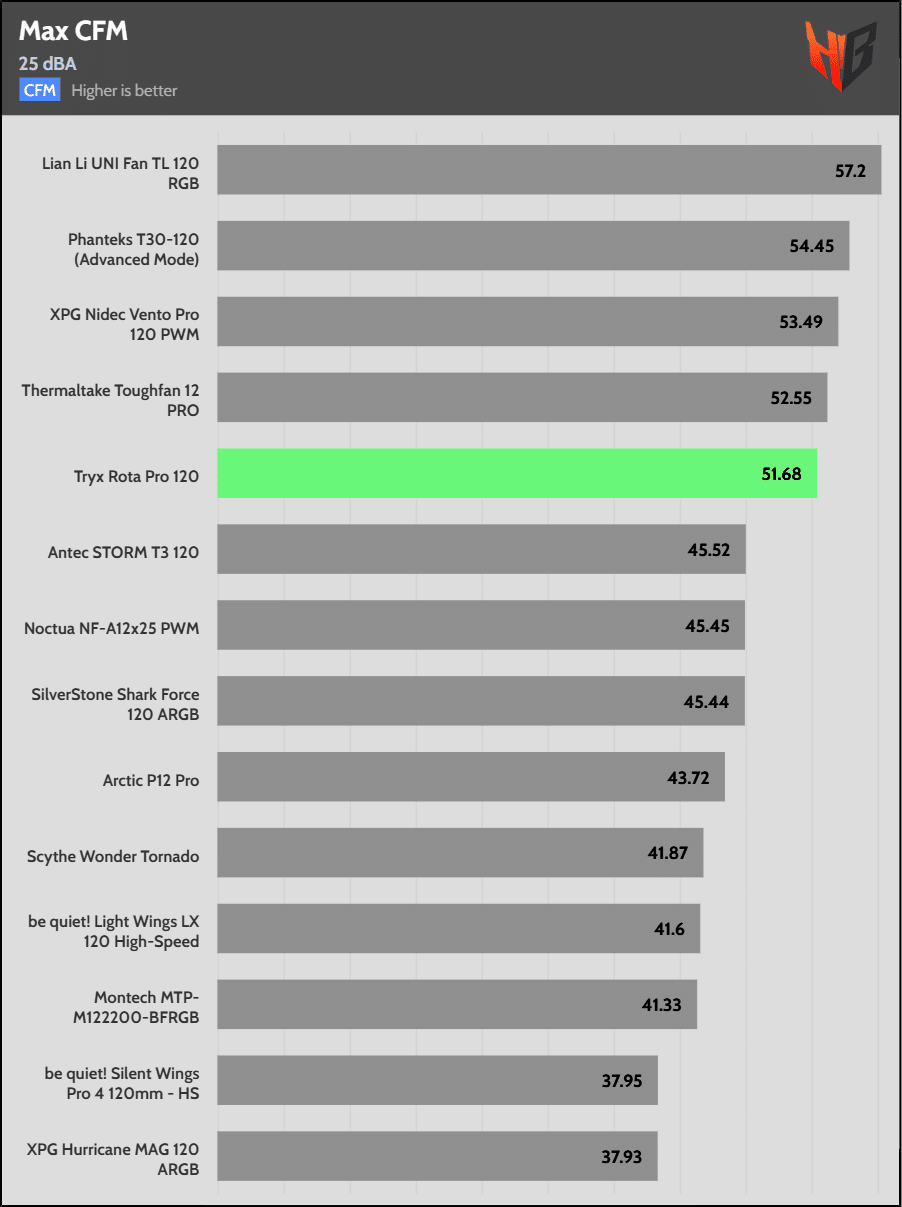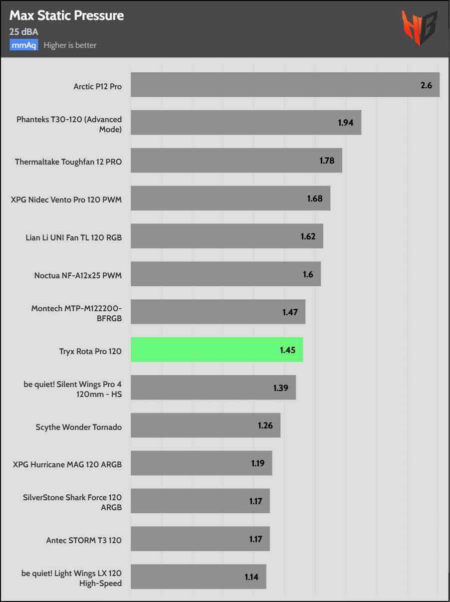 The Tryx ROTA Pro 120mm achieves good airflow and decent static pressure, although it is not particularly competitive, with a normalized noise output of 25 dBA. This fan is primarily designed for use in chassis rather than for heatsinks or radiators, where high static pressure is required. If you need a fan with high static pressure for use in cooling solutions, there are better choices available.