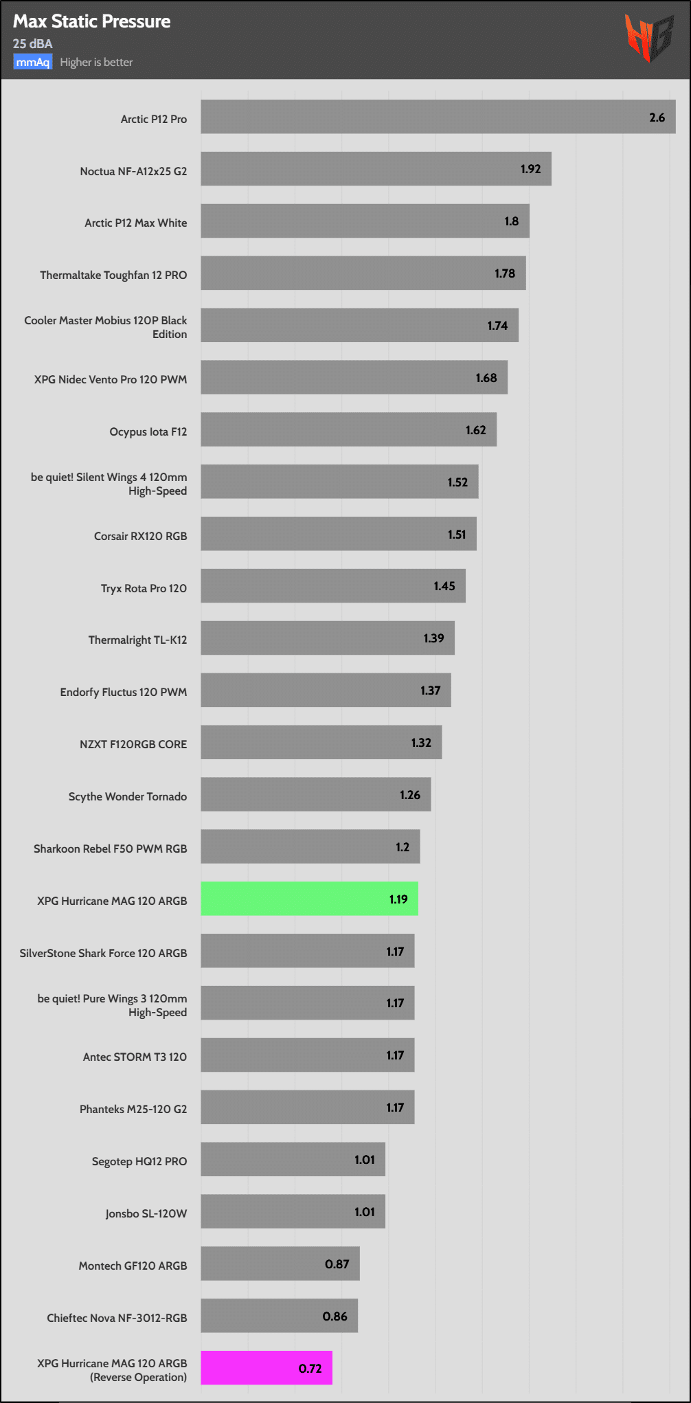 At 25 dBA, the fan’s airflow is low at both normal and reverse operation. At regular operation, the static pressure is close to the average in the 120mm category, but still not impressive, while it is dead low in reverse operation.